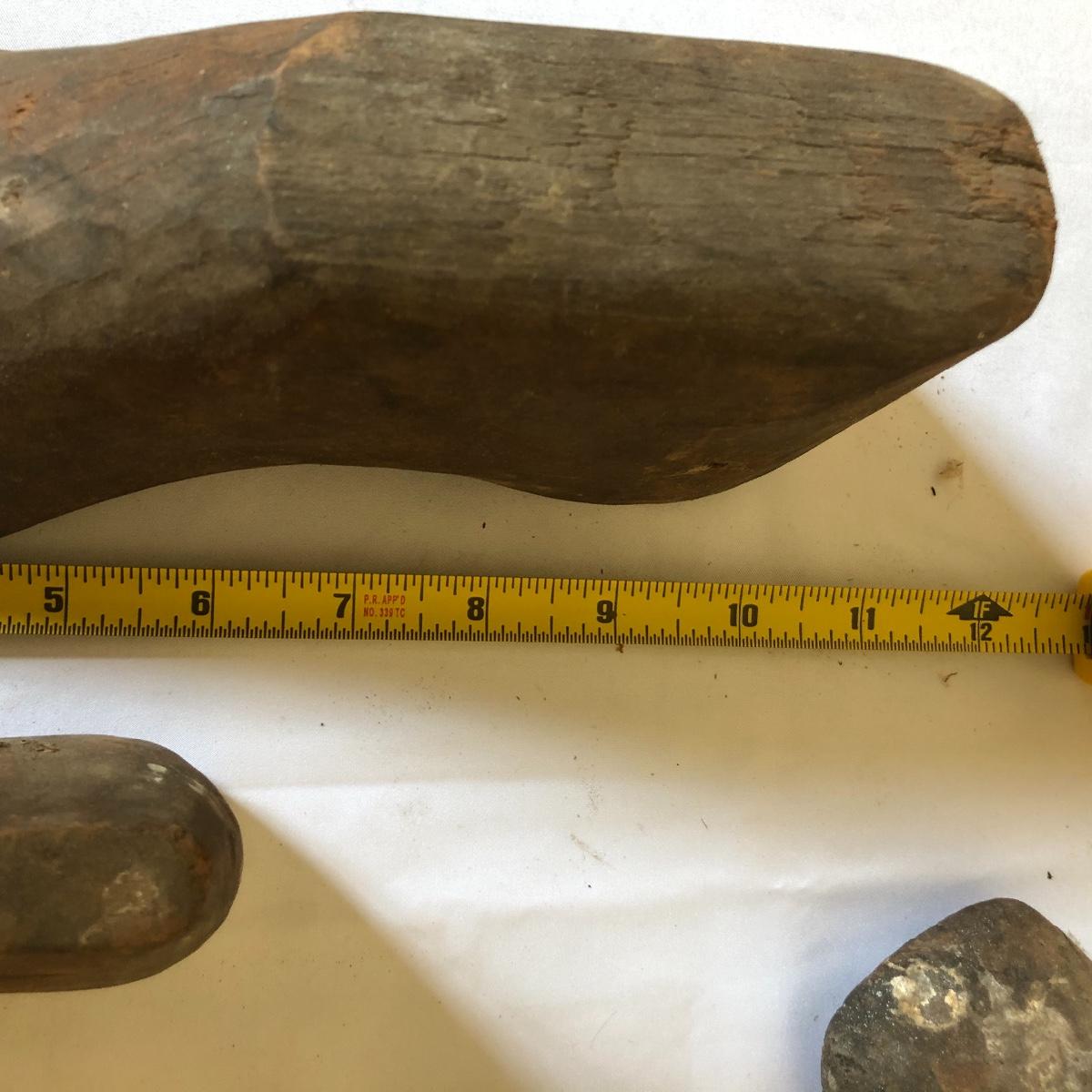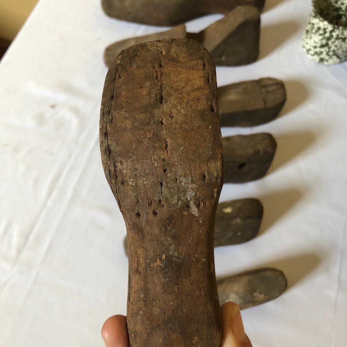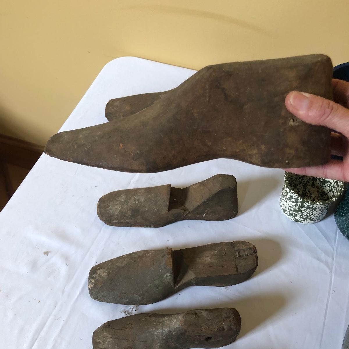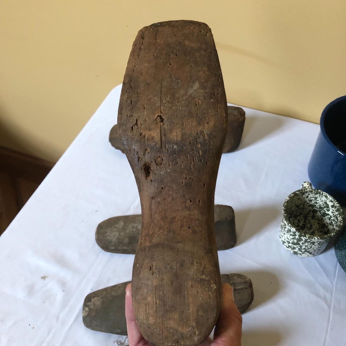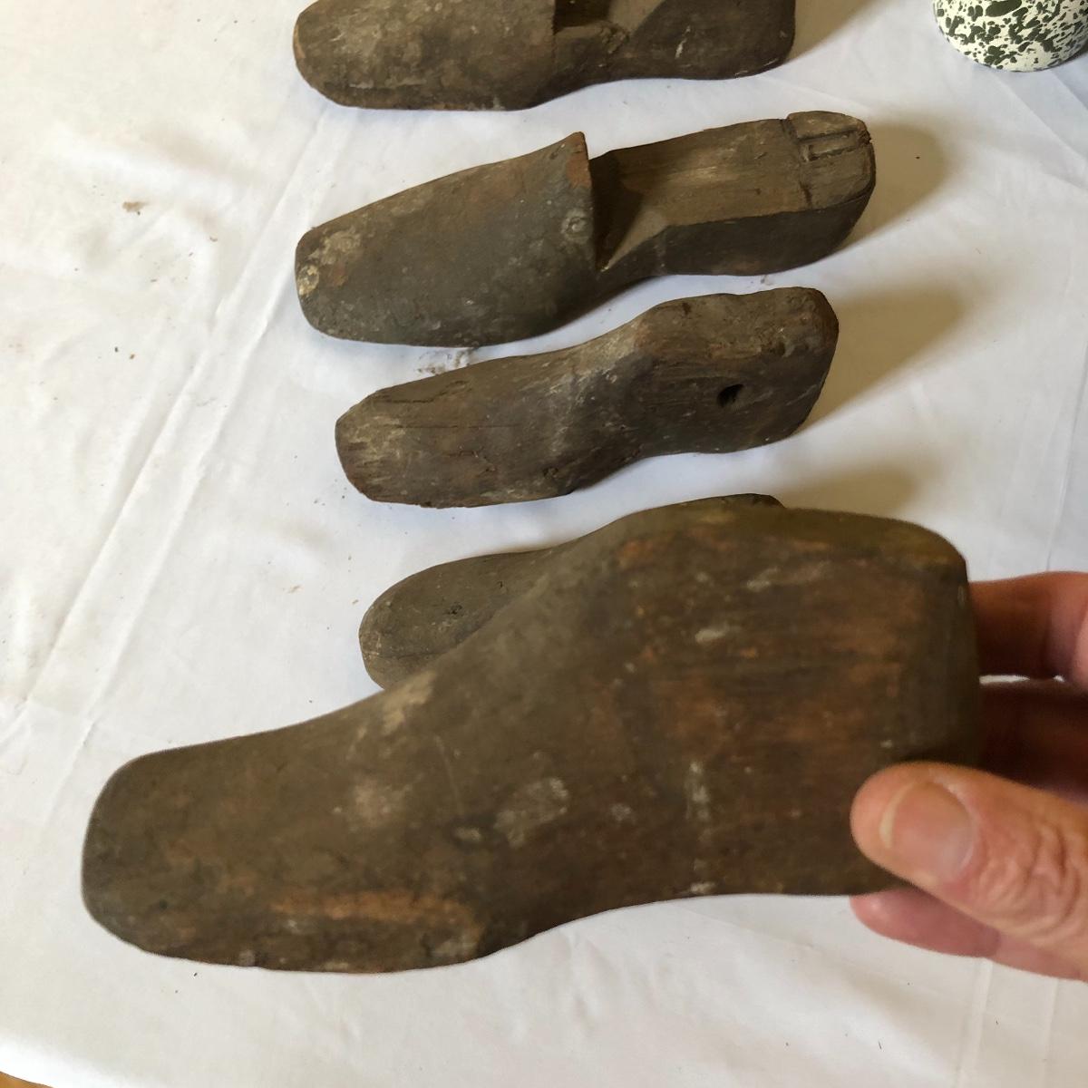 Mostly antique items in this lot with a few newer (made to look vintage) thrown in. The most unique of these items has to be the shoe-maker's wooden forms in various foot sizes and a primitive ball jar holder/carrier that is metal with a wooden handle. Two random antique drawers are included along with a large metal bowl that is pretty scratched from use. As for the newer items, there is a mini camping kettle that’s one inch high with mini cups and saucers, three rustic metal Jacks, two metal mugs (large one filled with marbles), a handled canister and a maroon speckled jug (this was added to the lot later and is not in the main image).