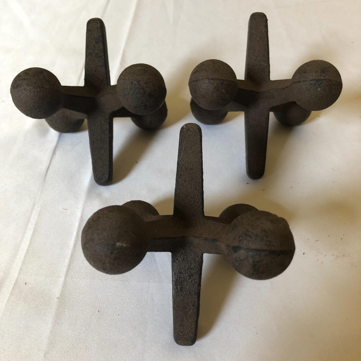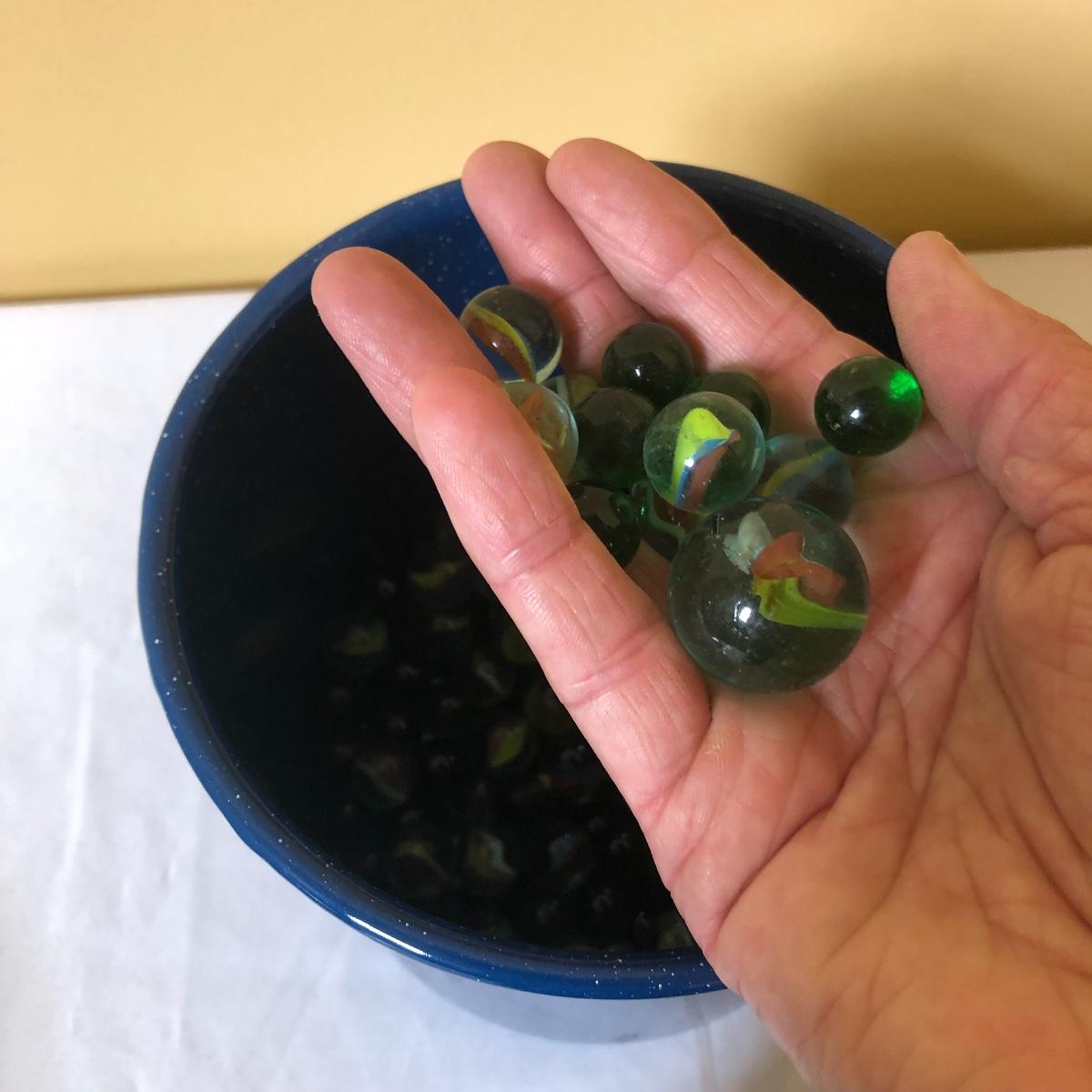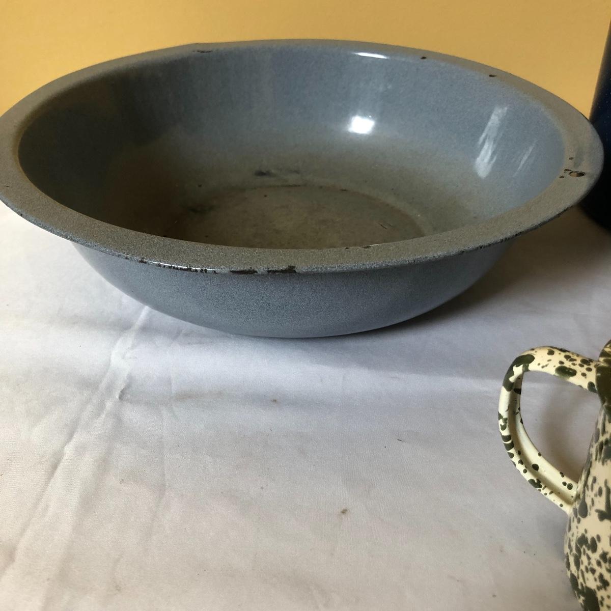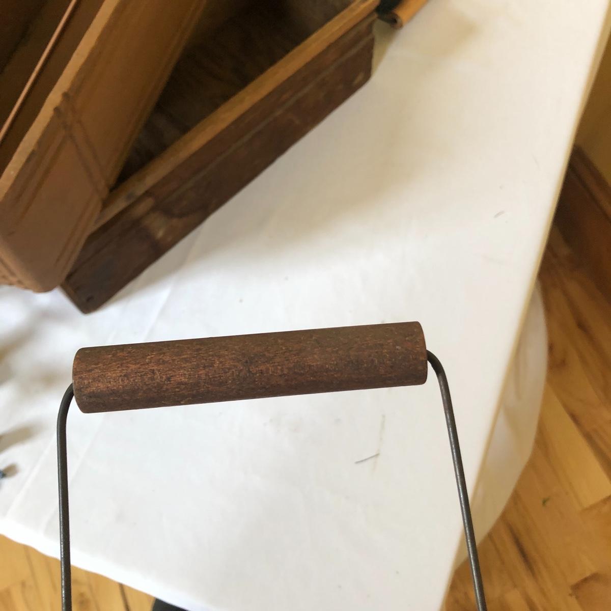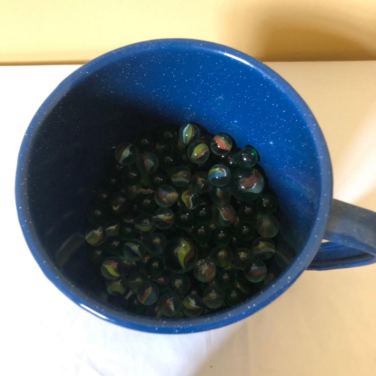 Mostly antique items in this lot with a few newer (made to look vintage) thrown in. The most unique of these items has to be the shoe-maker's wooden forms in various foot sizes and a primitive ball jar holder/carrier that is metal with a wooden handle. Two random antique drawers are included along with a large metal bowl that is pretty scratched from use. As for the newer items, there is a mini camping kettle that’s one inch high with mini cups and saucers, three rustic metal Jacks, two metal mugs (large one filled with marbles), a handled canister and a maroon speckled jug (this was added to the lot later and is not in the main image).