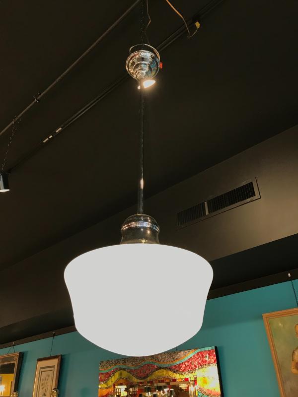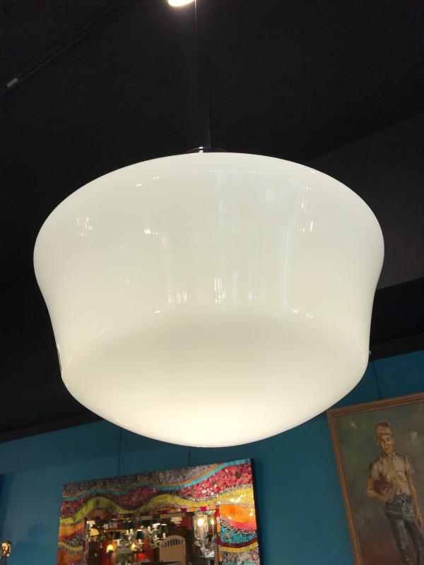 Very nice vintage large classic schoolhouse milk glass shade has been paired with a very high quality reproduction chrome downrod fixture. Very nicely shaped fitter cap and canopy. Long rod can be shortened to your desired length. 16" D x 43" H to canopy