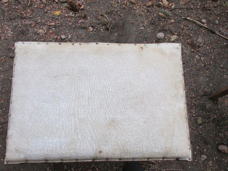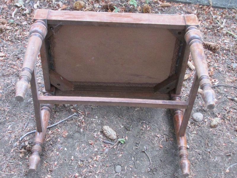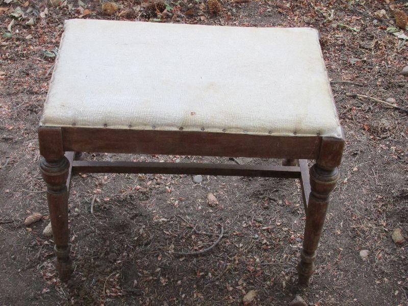 Vintage wood ottoman with tacked upholstery. The upholstery is a little beat up.