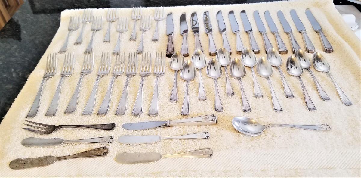 Vintage Sterling Silver flatware set - mark for Birmingham (UK) Sterling - monogrammed with initial "B". You get all you see here: 12 knives, 12 teaspoons, 8 forks, 1 soup spoon, 1 pie fork, 8 salad forks, 1 butter knife, 4 spreaders. Good vintage conditions - some pieces need a polish. Cool Art Deco look. Scrap price on this set is 826.00.