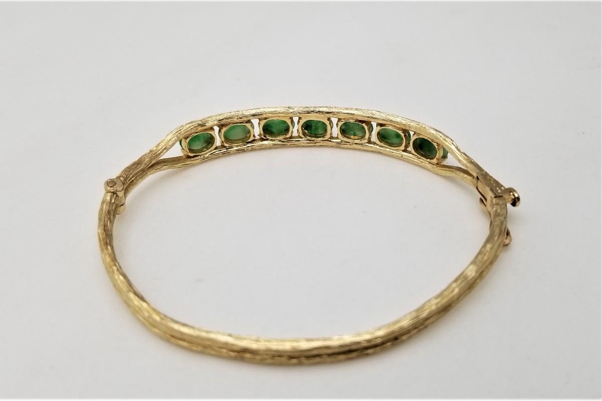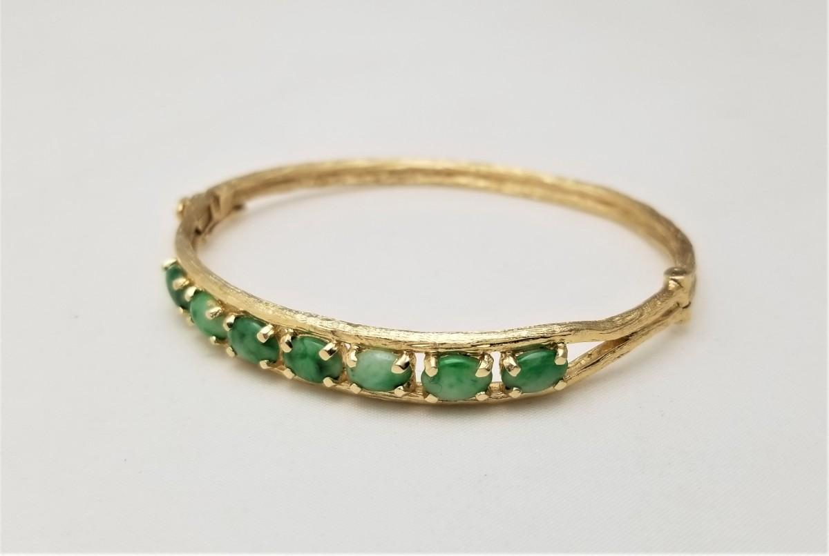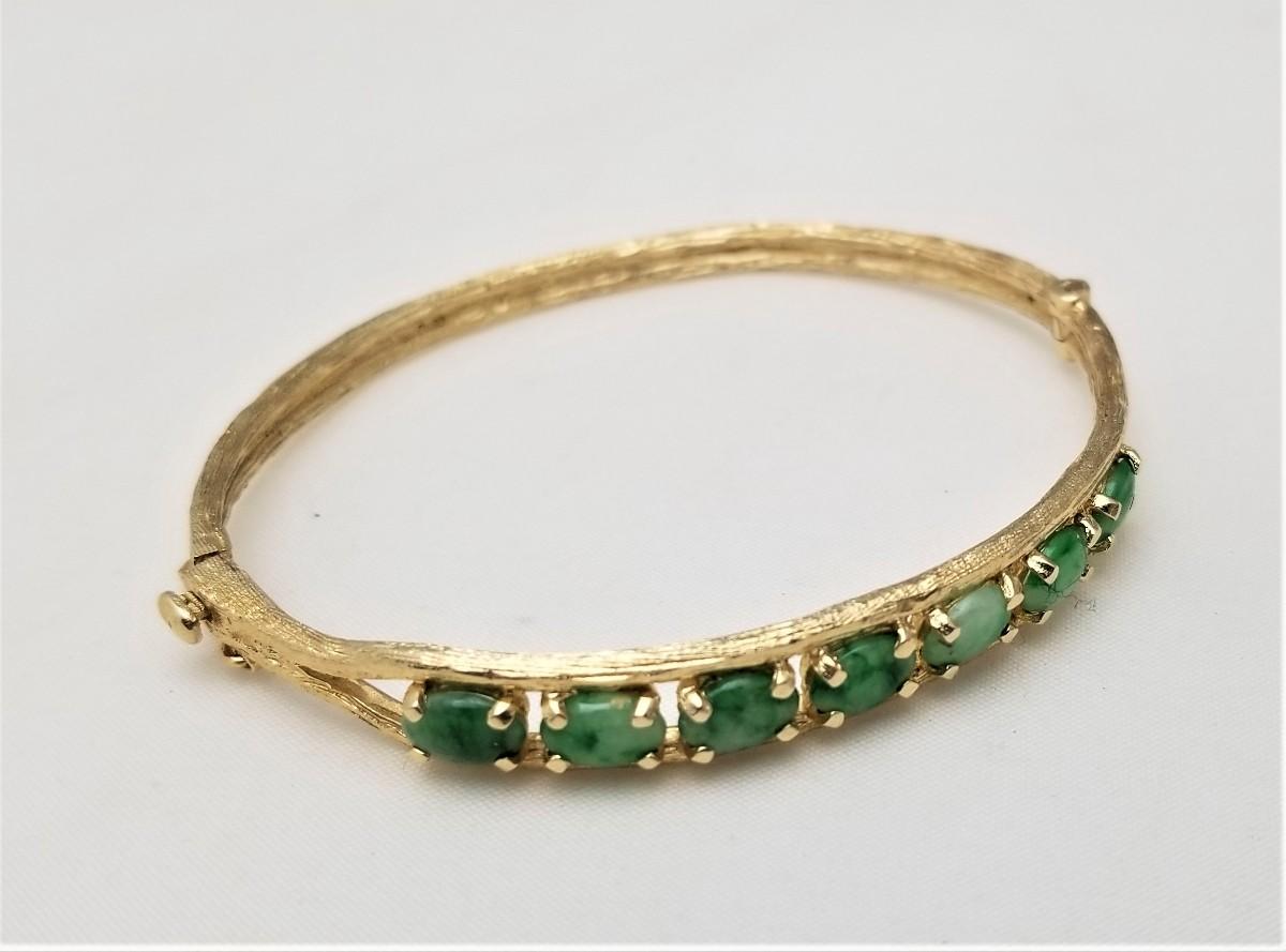 Lovely 14kt yellow gold (tested) hinged bangle bracelet with green stones (possibly Jade). Inside opening 2.25" x 2". Minimum bid is about 10% over the scrap price. Good condition.