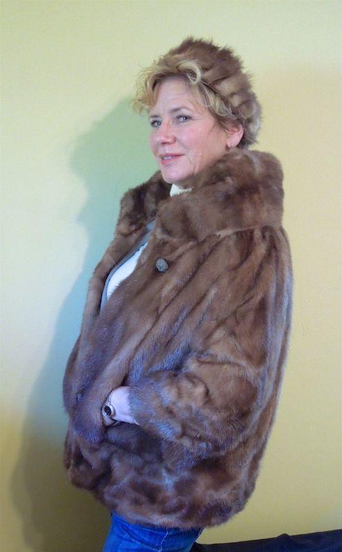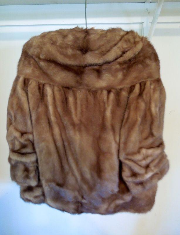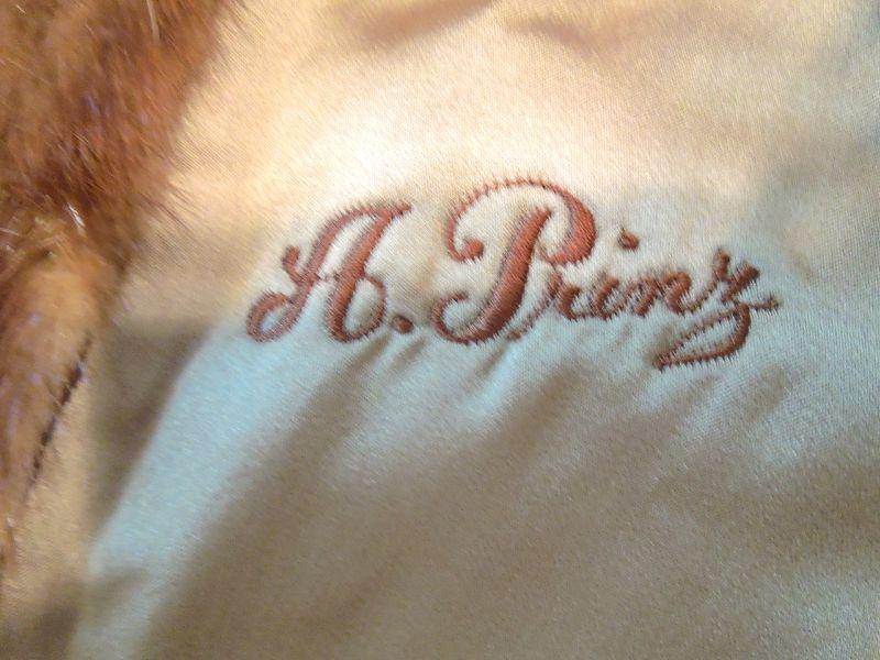 A very nicely tailored early 1960's mink stole with gathered shoulders 3/4 length arms and shawl collar. Nice drape. Has a pieced mink pelt beret style pillbox hat. Comes with very nice satin storage bag with hanger. Coat is embroidered "A. Prinz" in satin lining. Lining around neck has come loose. Pelts look to be in good condition with no splits.