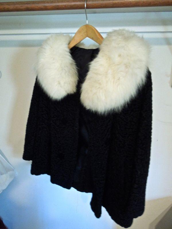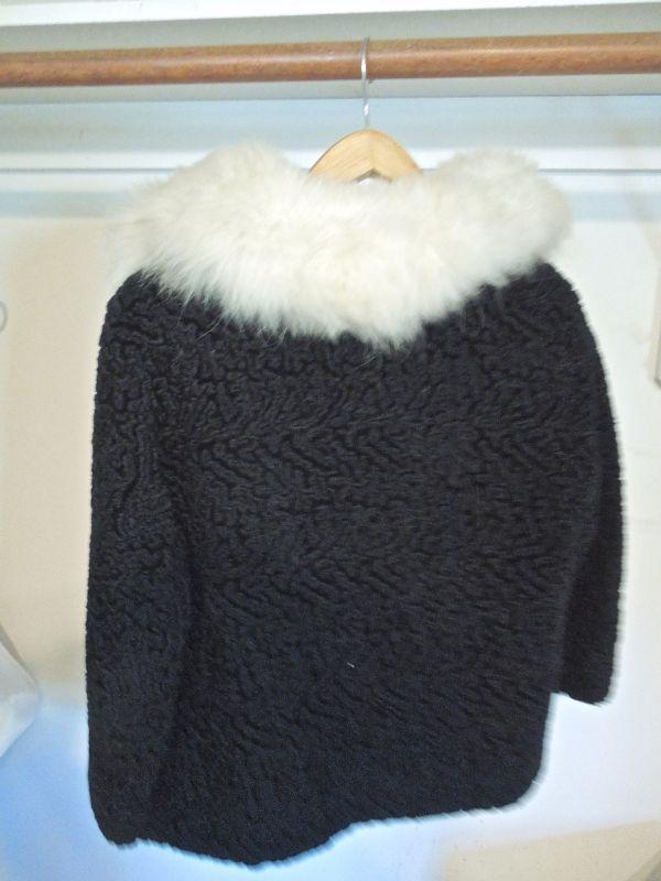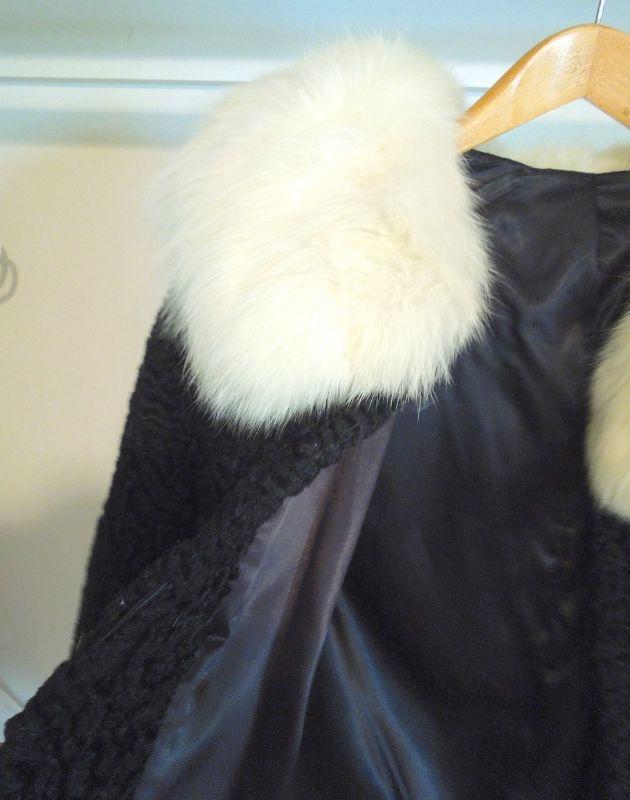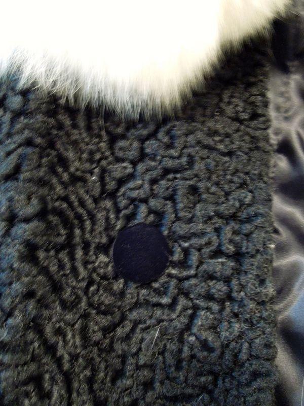 Also a faux curly lamb black jacket with white fur trim. Satin lining. It does not have a label.