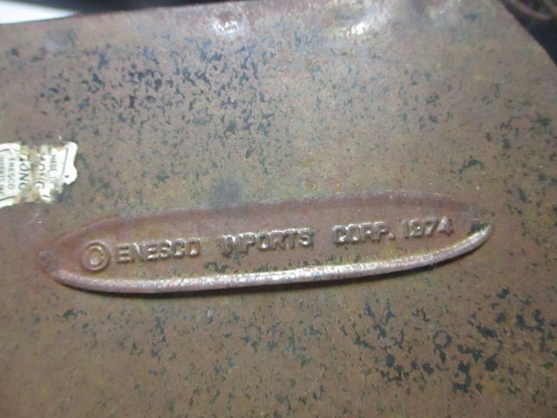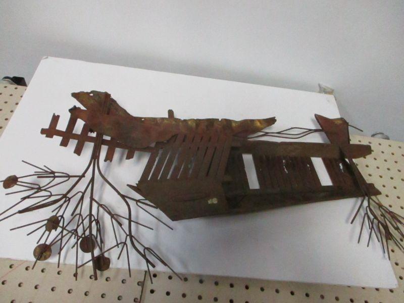 Offered here is a nice 70s metal wall sculpture by Enesco Imports 1974. It depicts an old covered bridge. It is in vintage condition with some wear, bends, patina, and finish losses from age and handling - see photos.