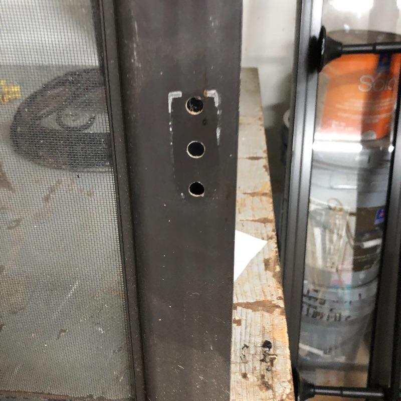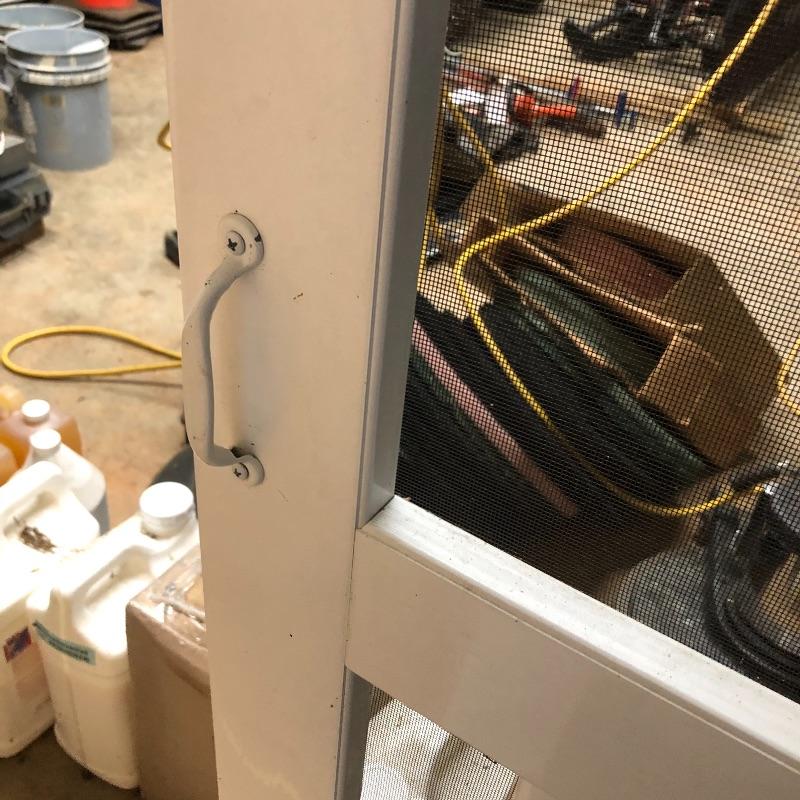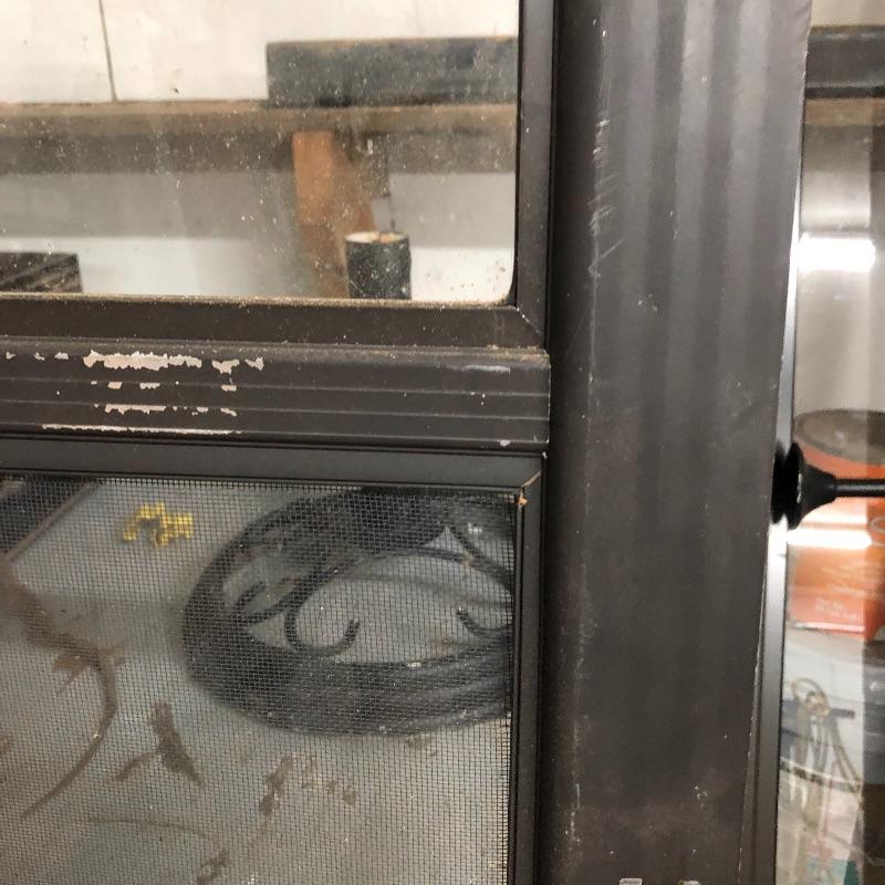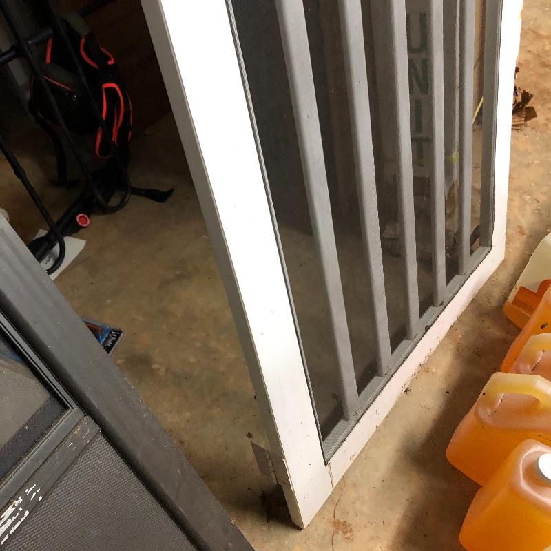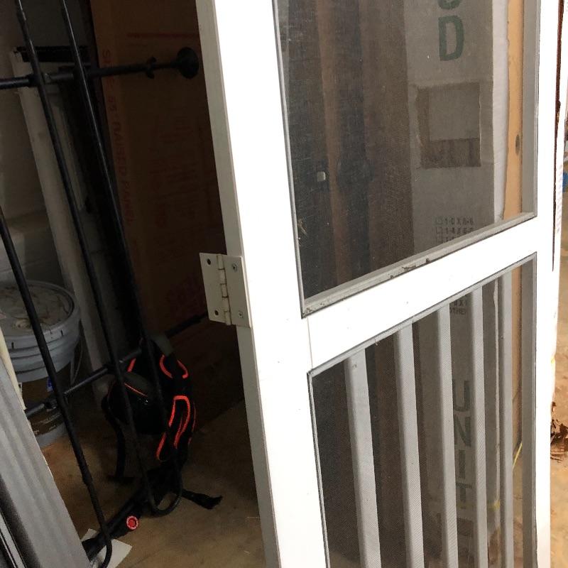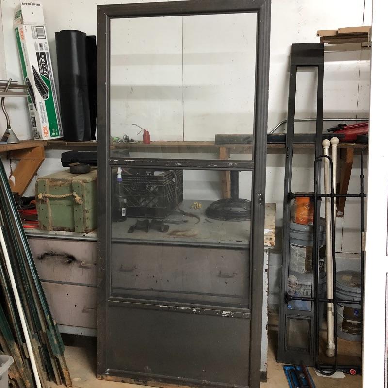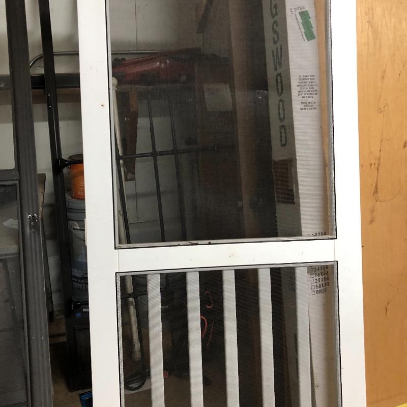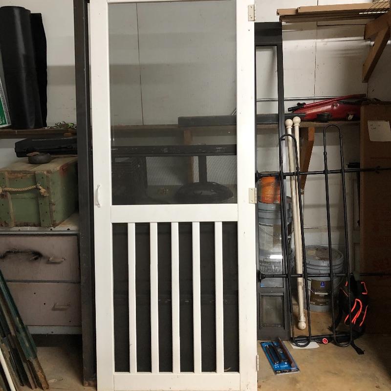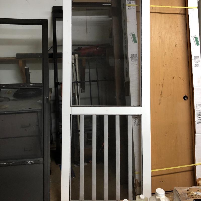 This lot includes two exterior screen doors; one a white vinyl screen door and a dark brown metal screen door. Dimensions of the white vinyl door: 32” x 80”. Note the small hole in the screen. The dimensions of the metal door:36” x 79”. The metal door has glass inserts on the top and bottom and a screen on the bottom. Local pick up only.