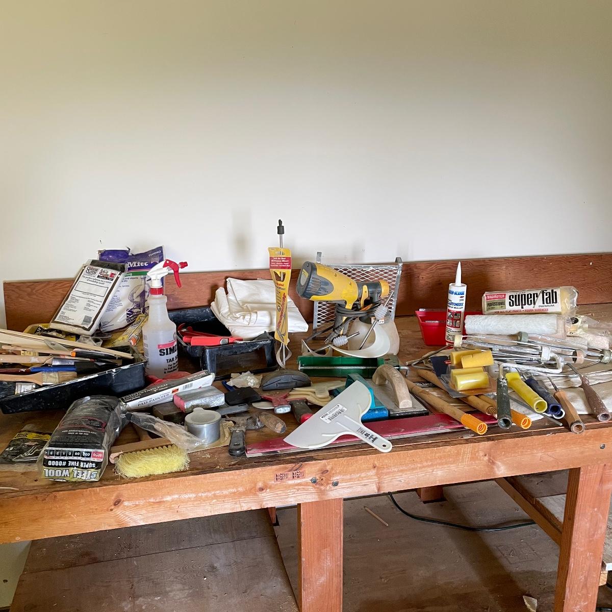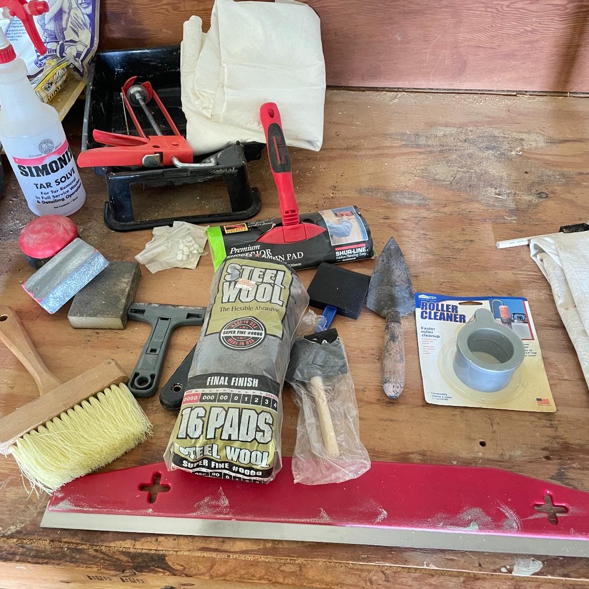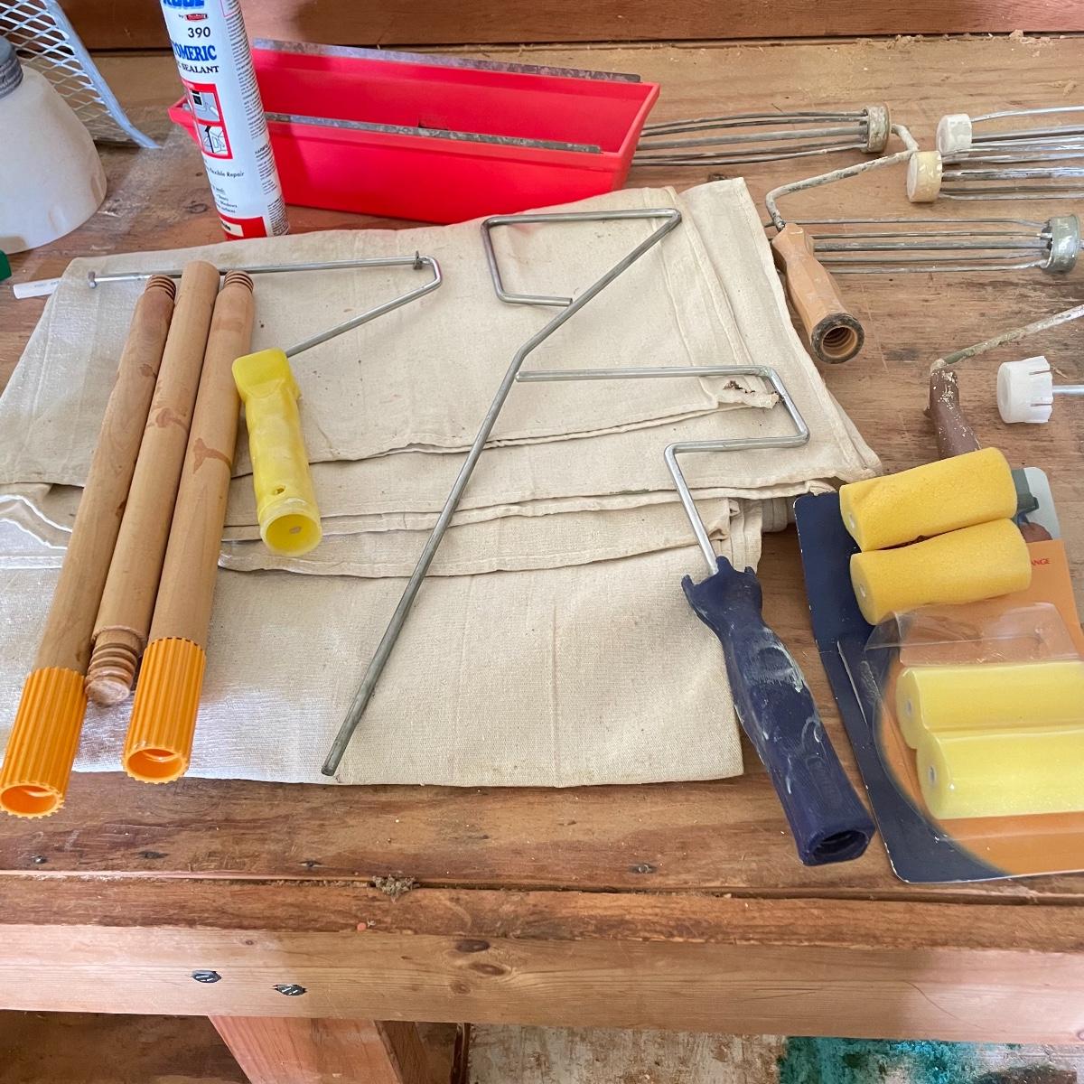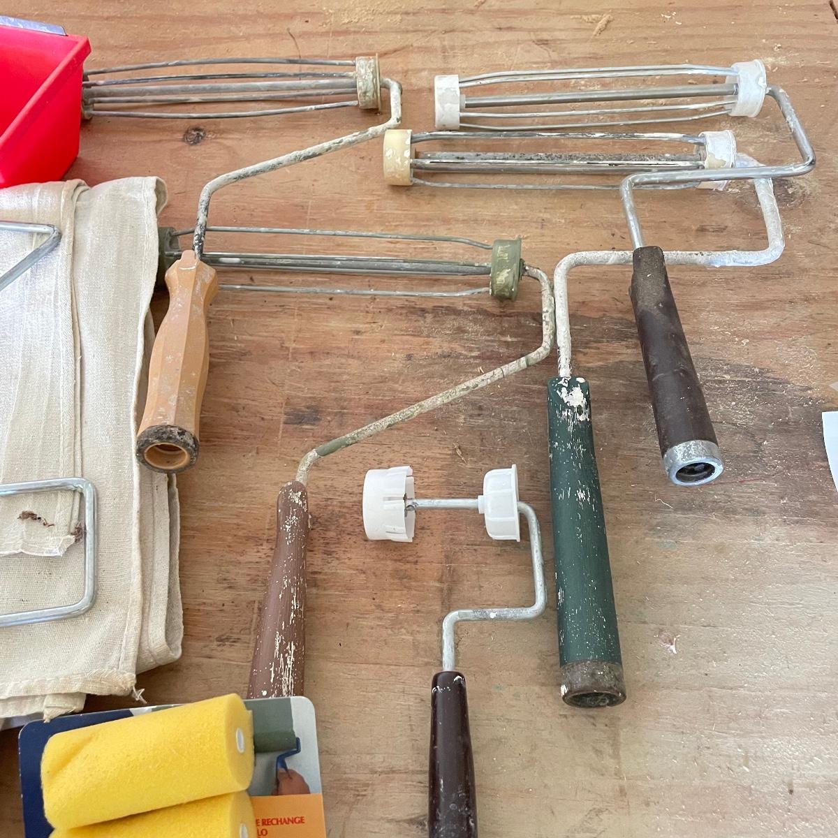 All the tools you need to freshen up your walls! Plenty of 9” rollers, a good selection of various sizes paint brushes, all used, but in good shape. A Wagner paint sprayer turned on when tested. Lot also includes drop cloths, both cloth and fabric, three paint trays, scrapers, sander pads and more! See images. Local pick up only.