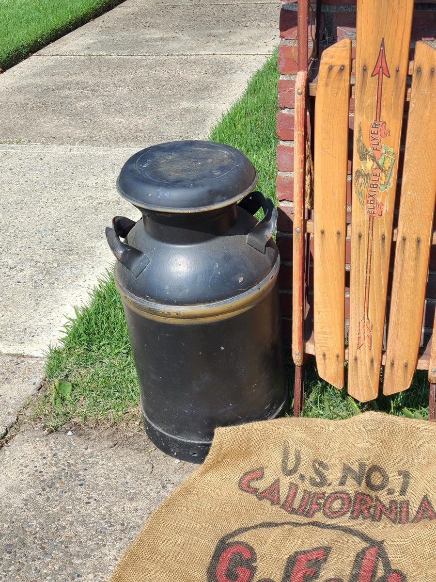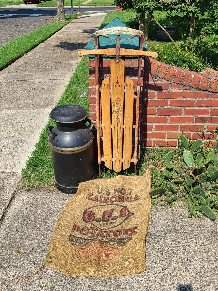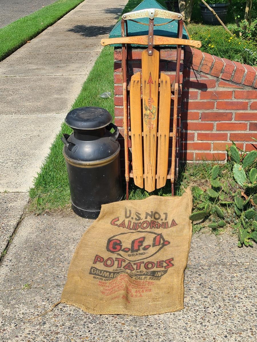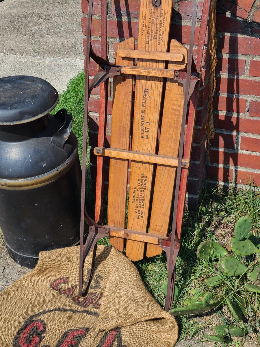 Lot 187G: Vintage Flexible Flyer, Milk Can and Burlap Potatoe Sack