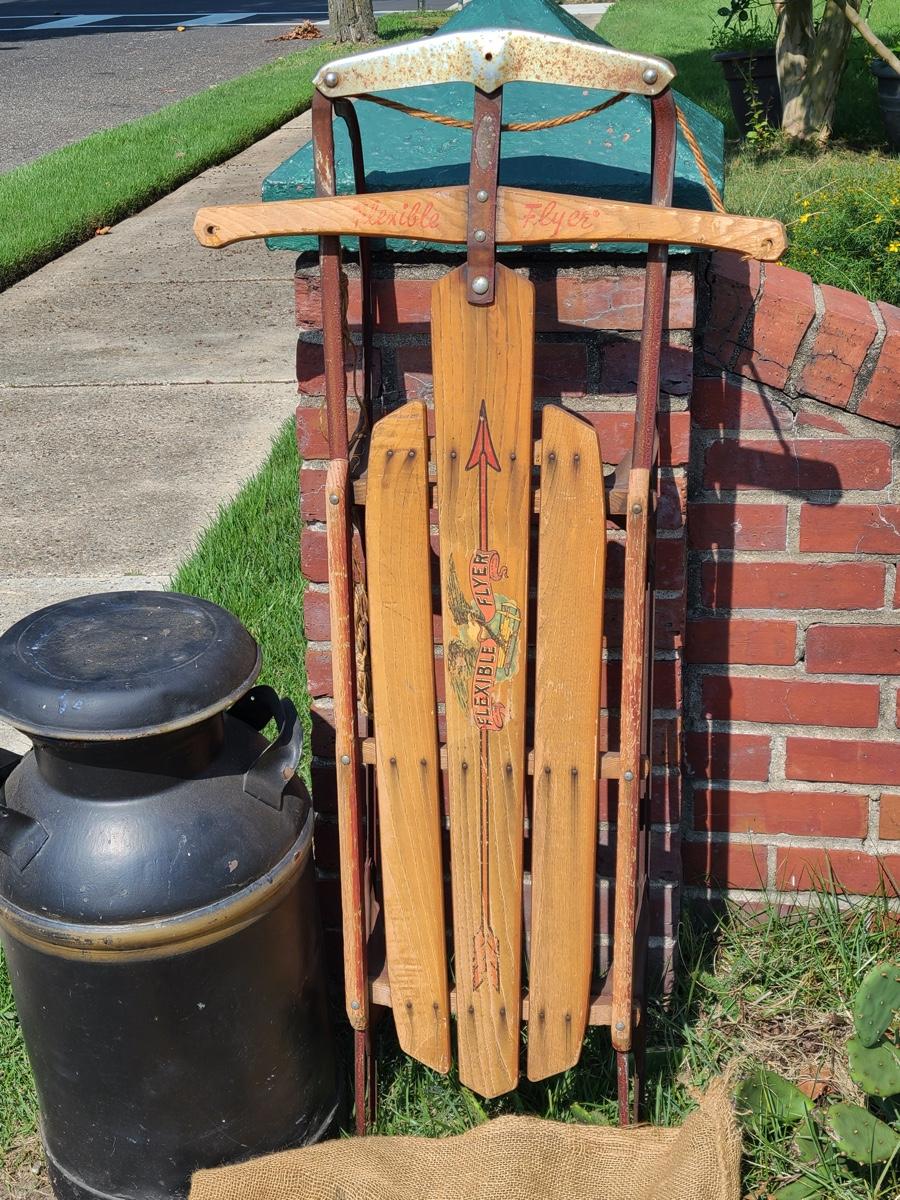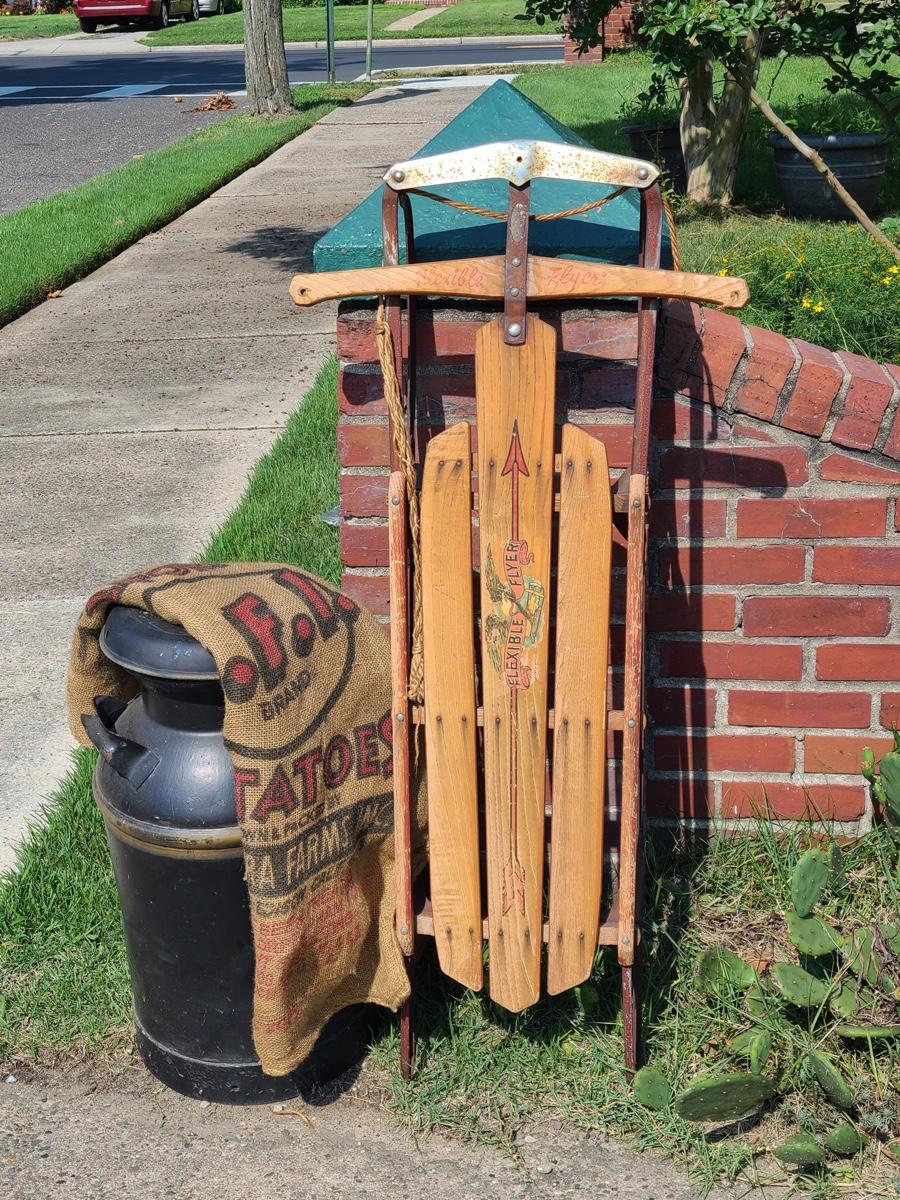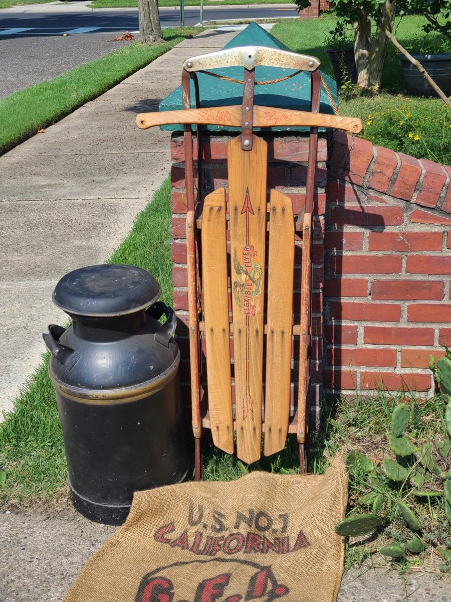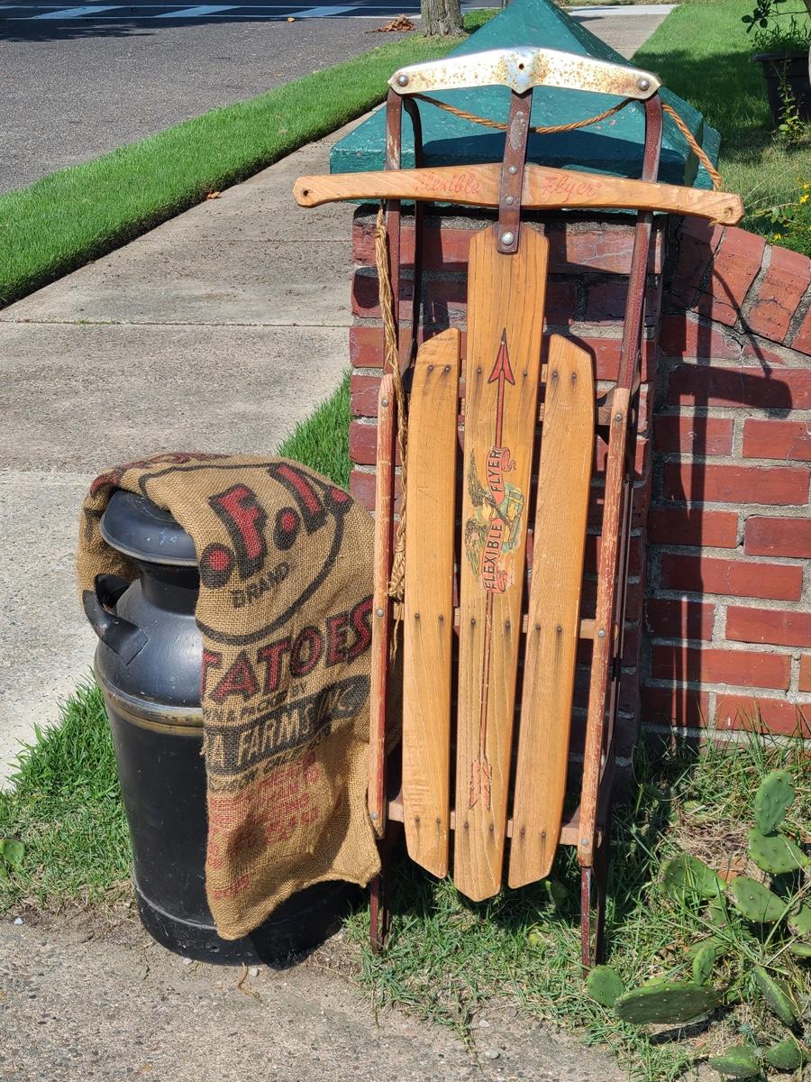 Lot 187G: Vintage Flexible Flyer, Milk Can and Burlap Potatoe Sack