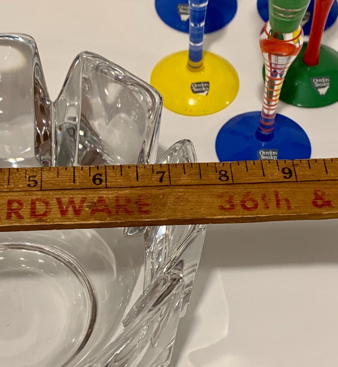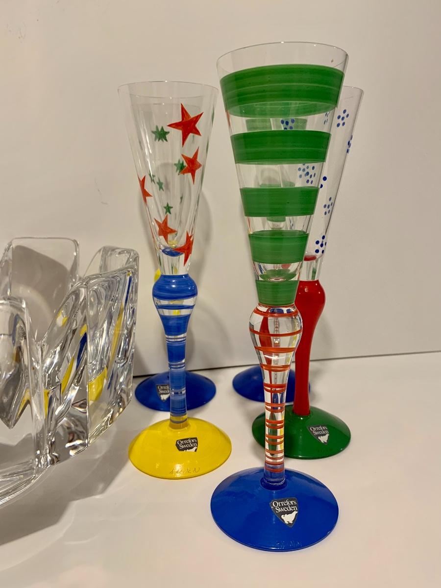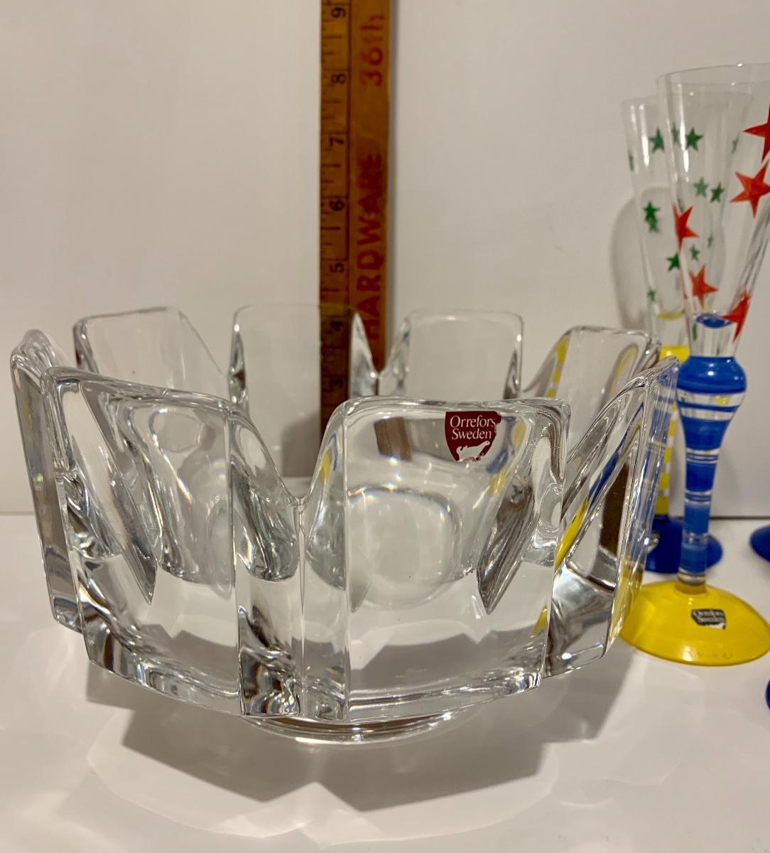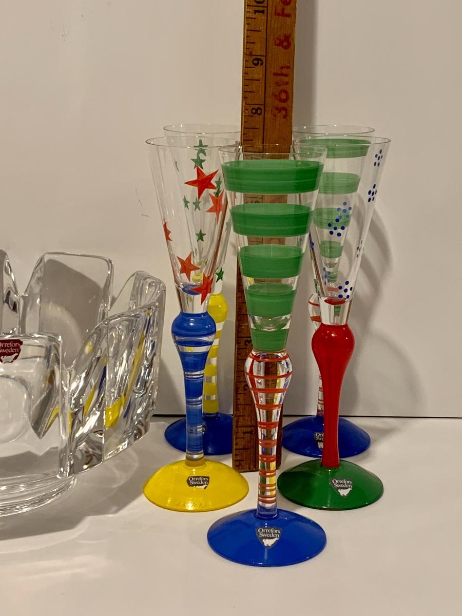 Beautiful & Fun crystal collection by Orrefors of Sweden. These look to be new with original stickers on the glasses. These are highly collectible! Also included is large crystal Orrefor Bowl. Please see all pictures as they are the best representation of the items. The pictures show condition, measurements if taken, and what is included in the lot. Due to the large amount that we photograph and the time frame, we are not always able to take measurements. All items unless noted, are pre-owned and have been used. If you purchased furniture, you must bring help. We do not allow one person to carry large furniture out on their own. Bring help, tools and a truck for the safety of our client’s homes, and your personal safety. Company policy. Thank you.