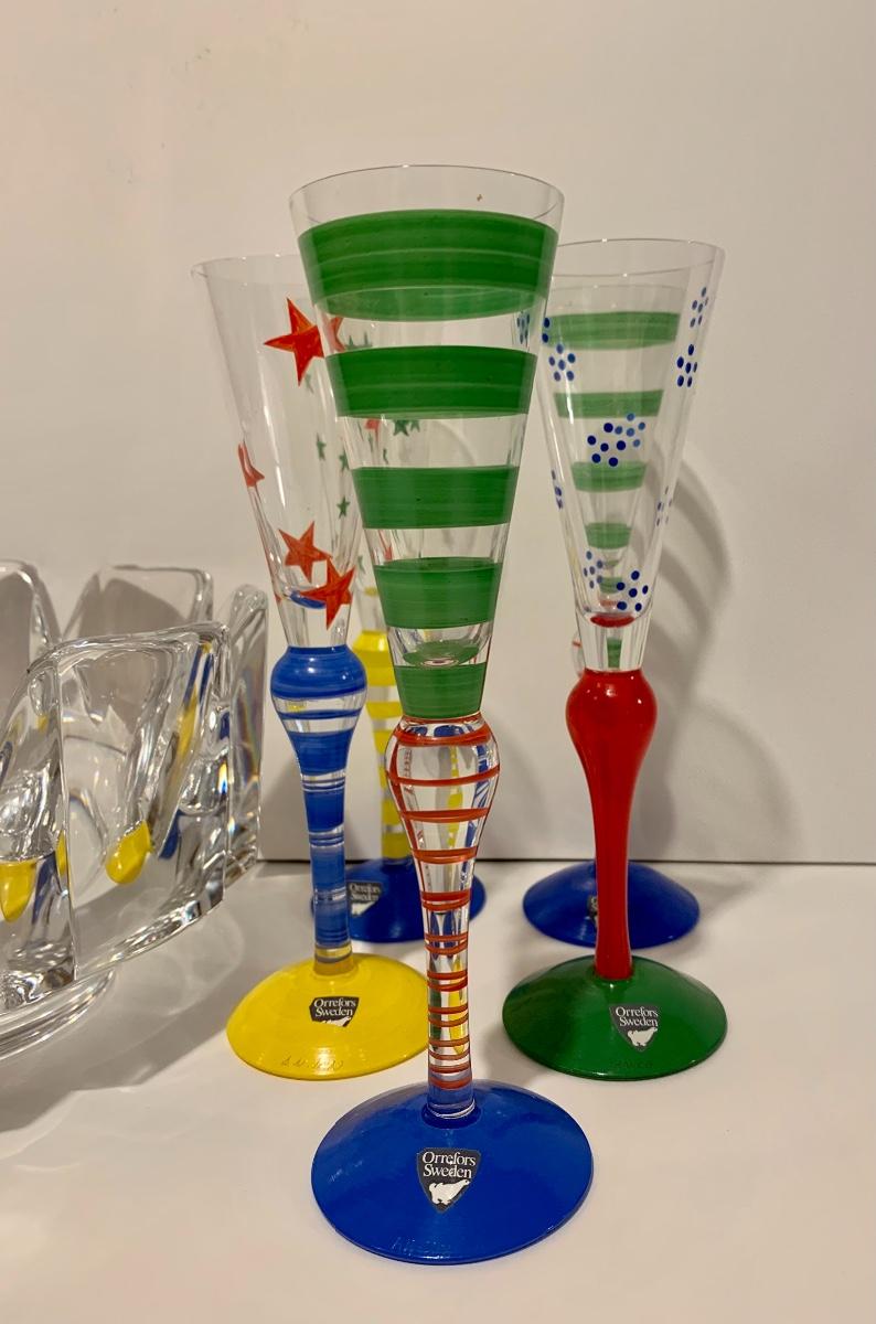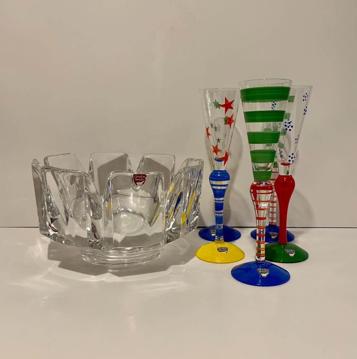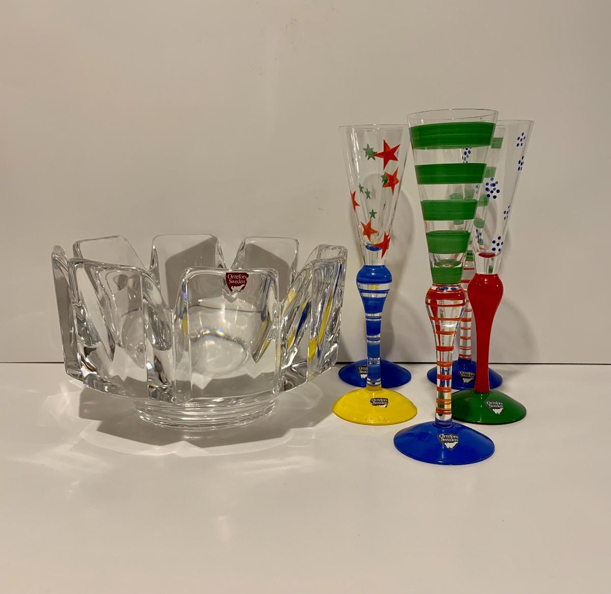 Lot 187: Vintage New Orrefors "Clown" Schnapps/Cordial Glasses & Crystal Bowl