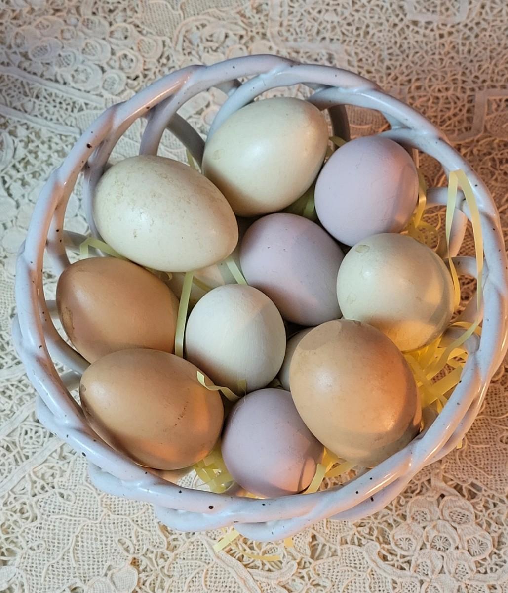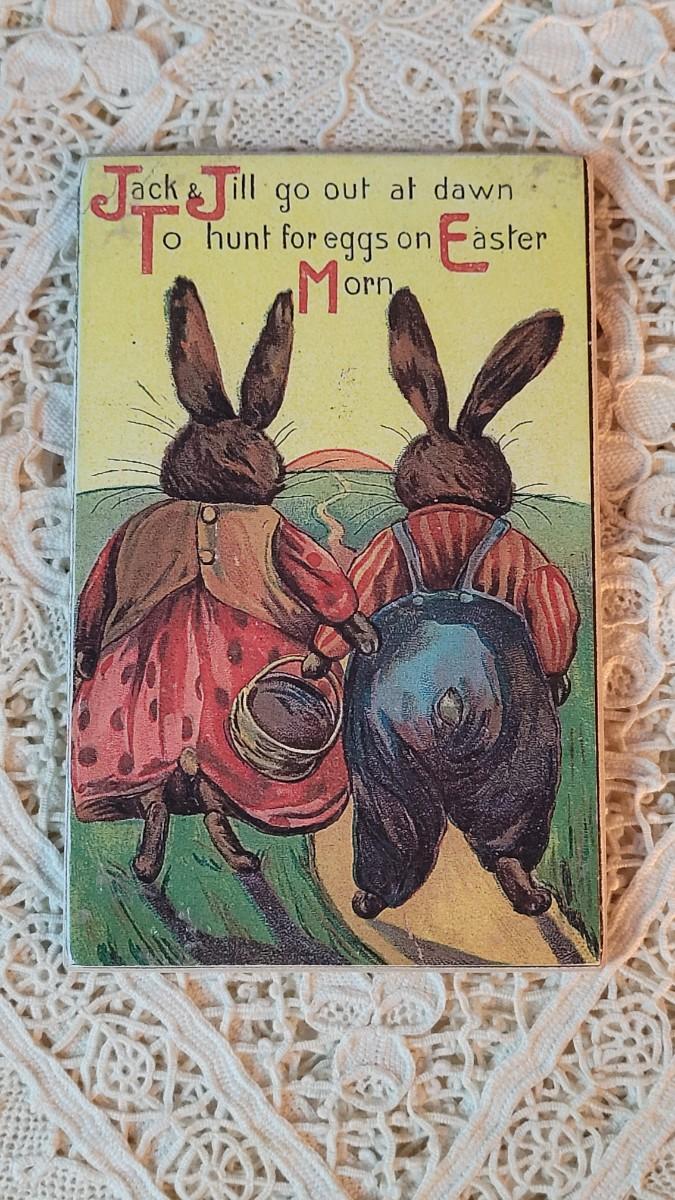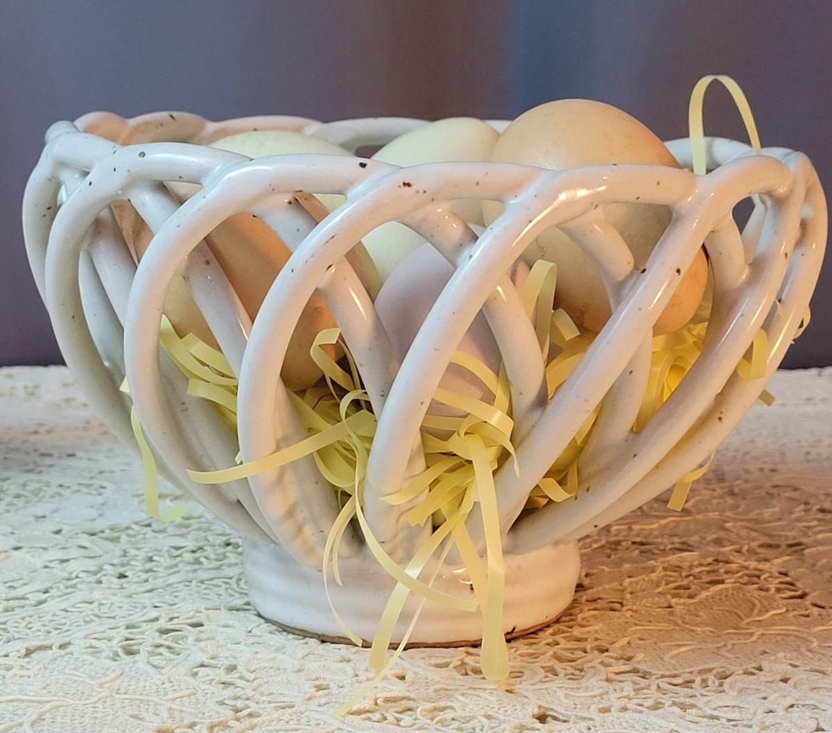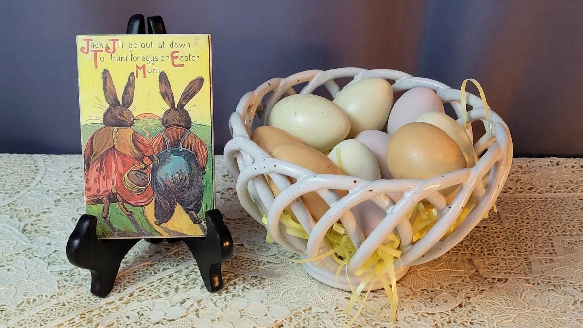 Lot 187: Ceramic Basket with Wood Eggs & Decorative Bunny Postcard