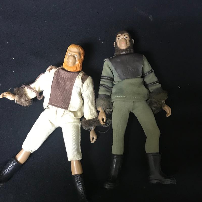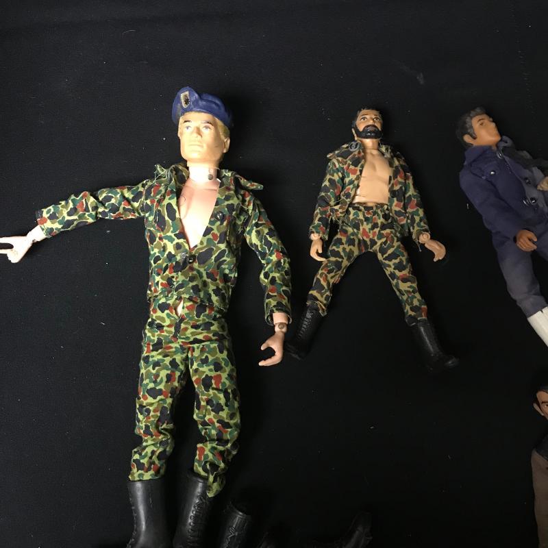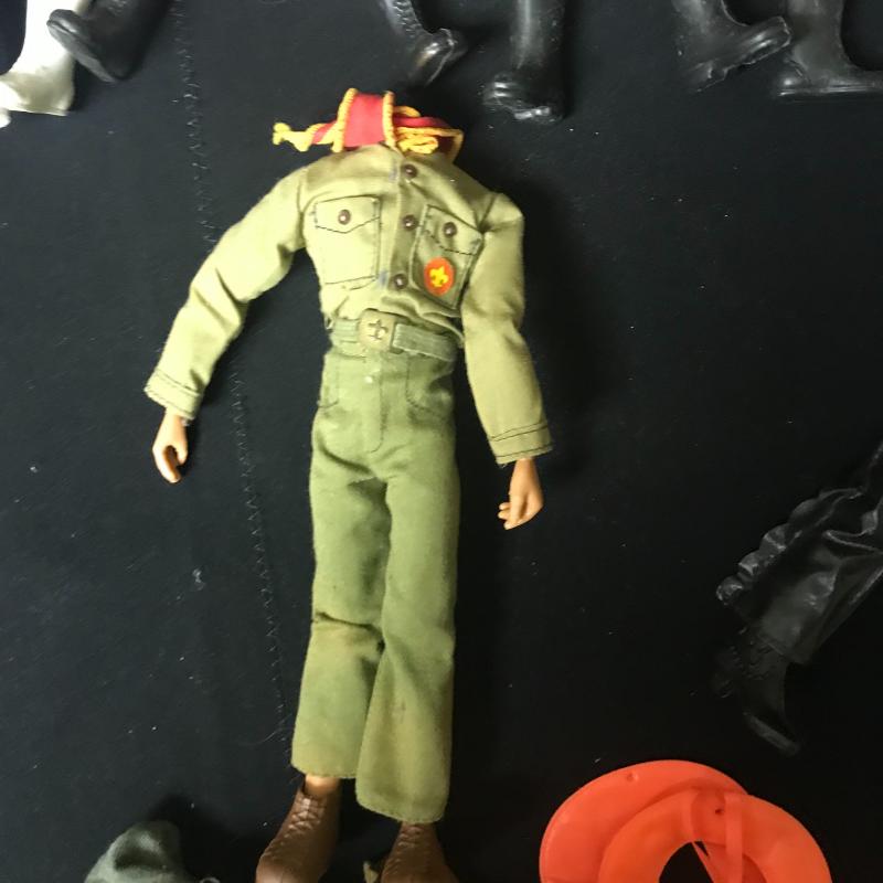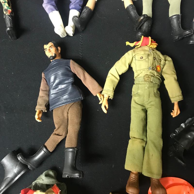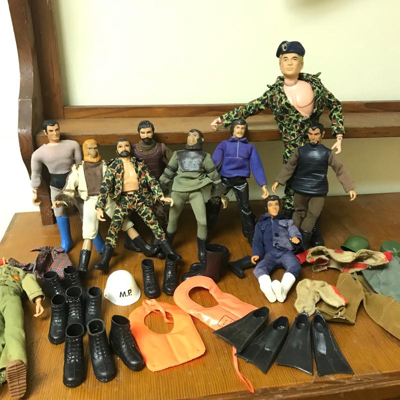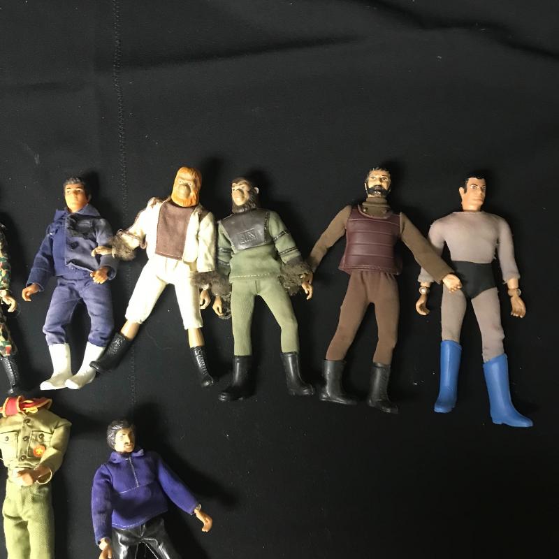 Ten action figures of military, Boy Scouts, Planet of the Apes and more. Some have had some tough battles. Most are all plastic with moving arms, legs etc. There are lots of extra boots and hats. Shipping available.