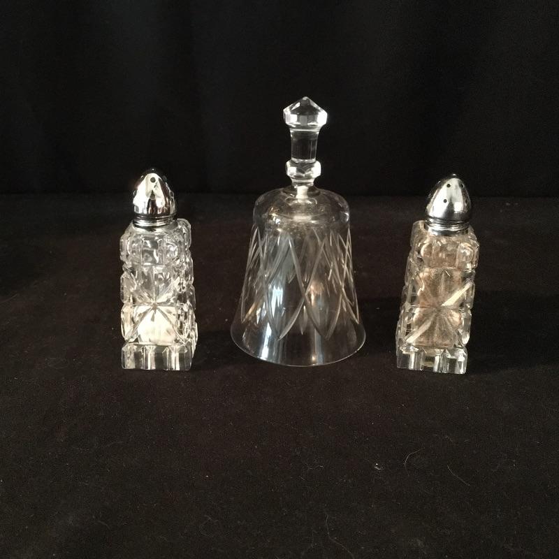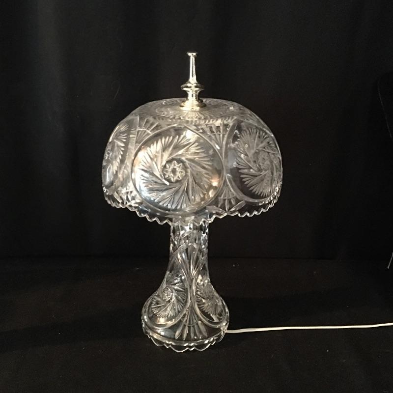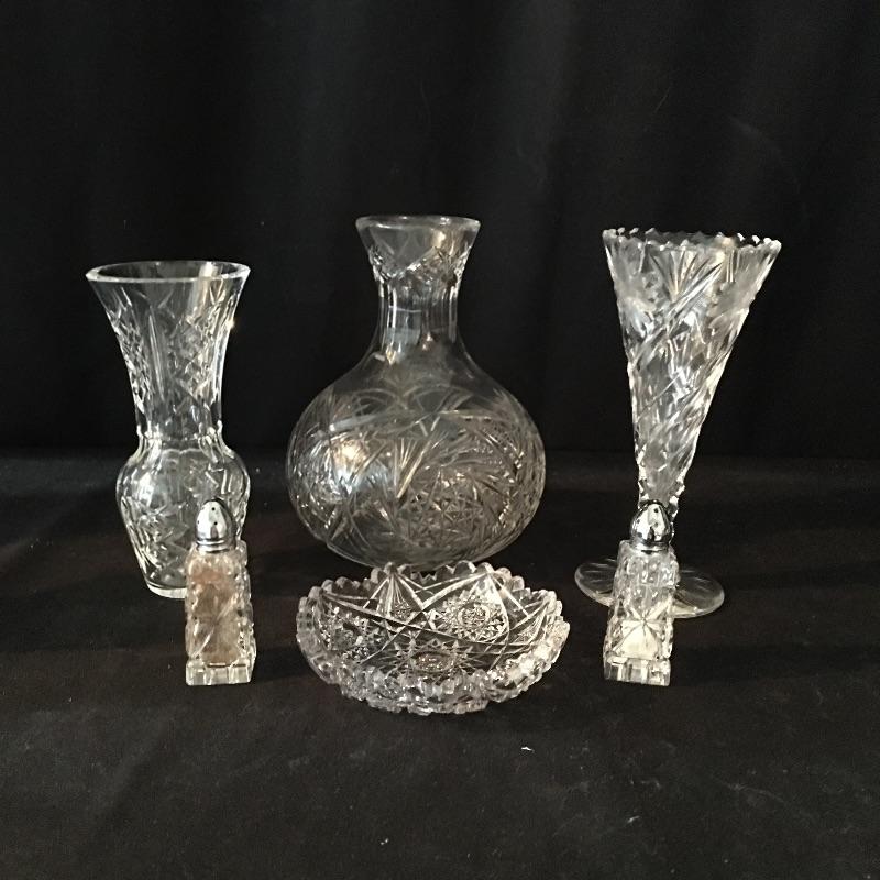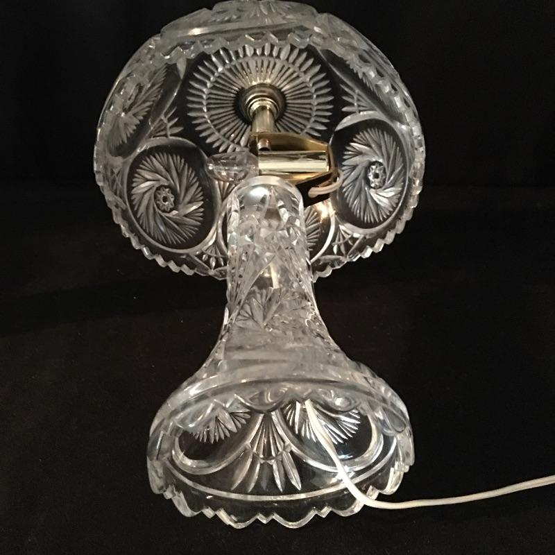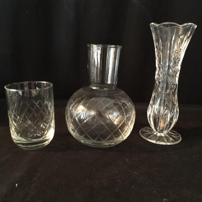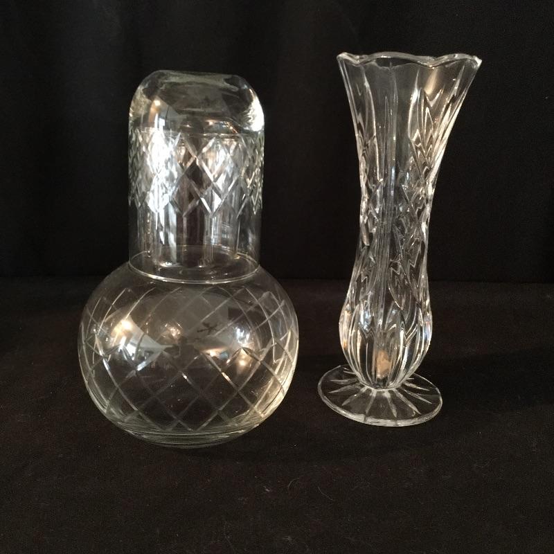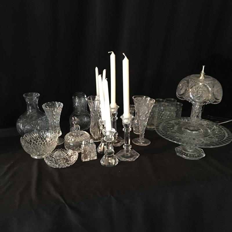 This array of formed glass includes a lamp, Six candle holders, salt and pepper shakers, five vases, bell, water jug with glass, seven glasses, cake plate and two bowls. Lamp measures 8”D x 14” tall and worked when tested.