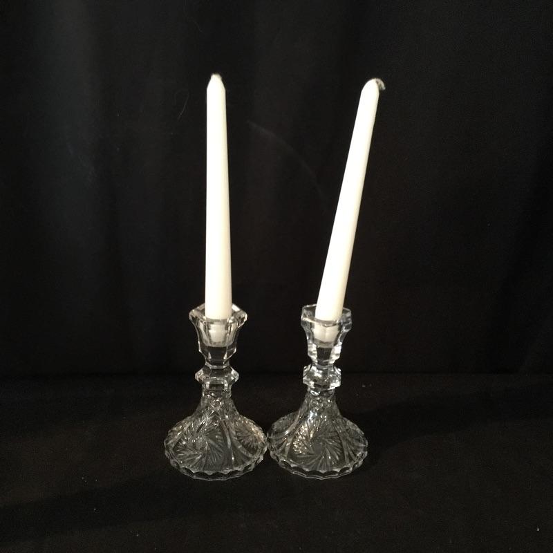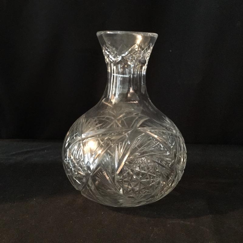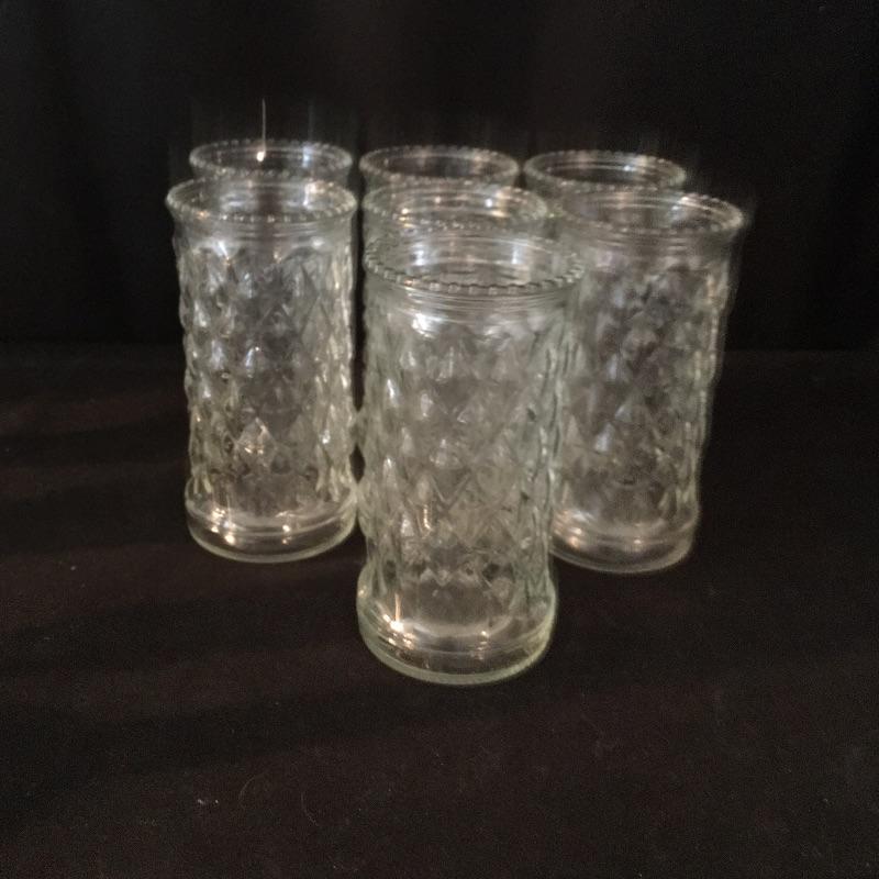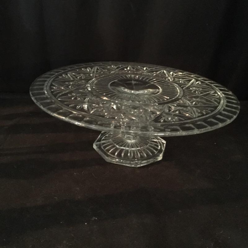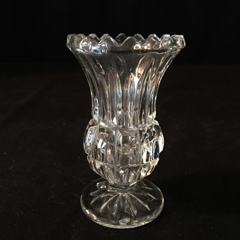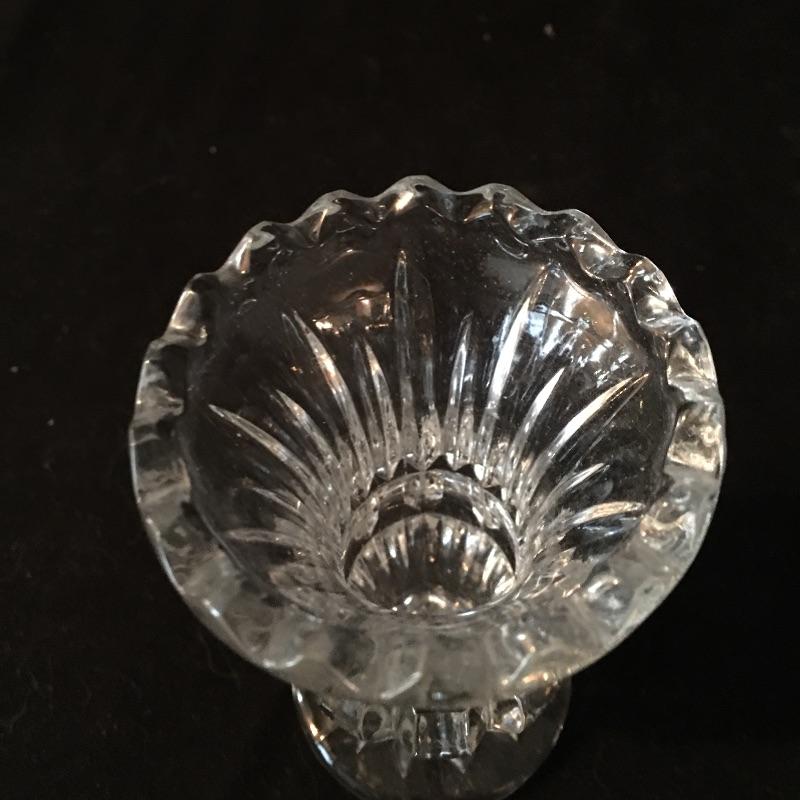 This array of formed glass includes a lamp, Six candle holders, salt and pepper shakers, five vases, bell, water jug with glass, seven glasses, cake plate and two bowls. Lamp measures 8”D x 14” tall and worked when tested.
