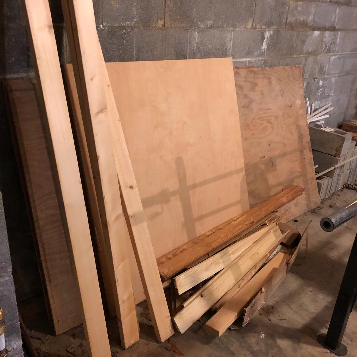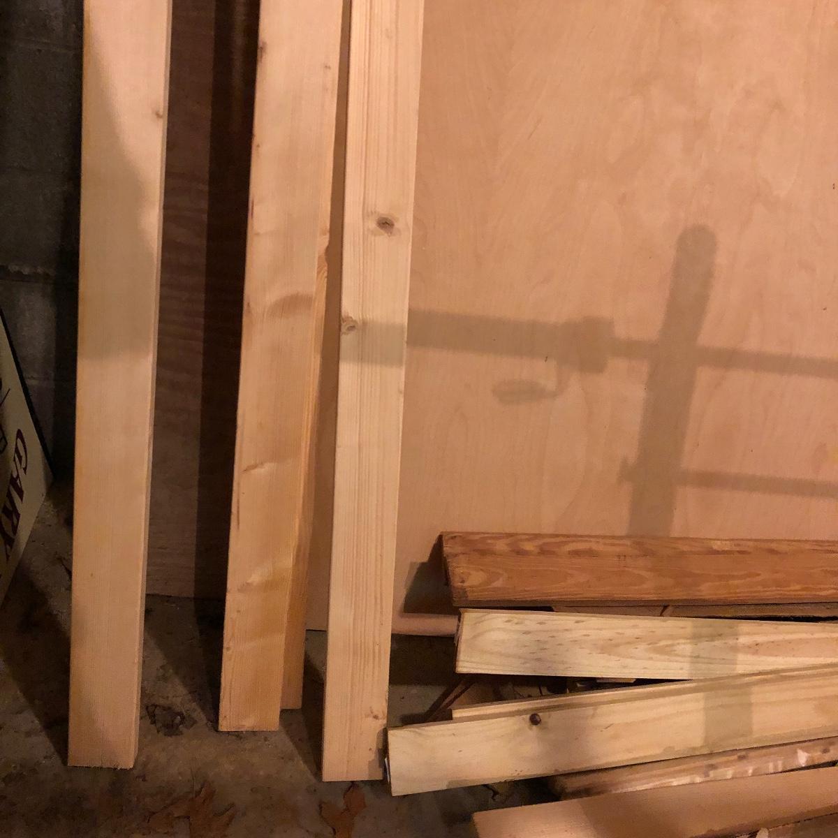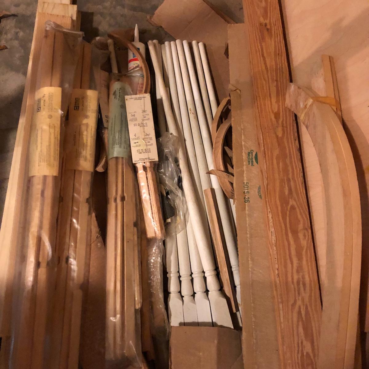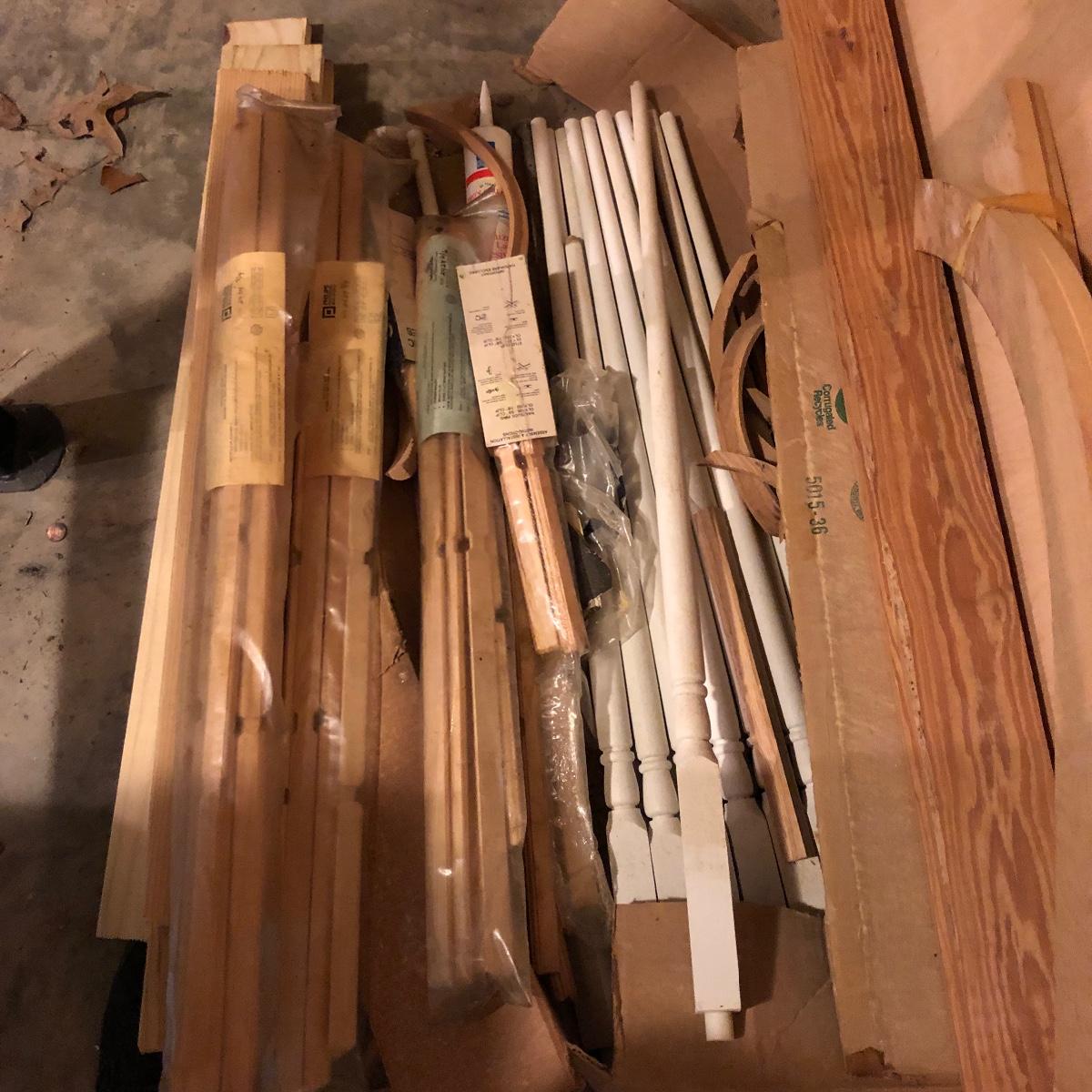 This stuff is like gold nowadays.! Lot includes three eight foot 2 x 4s, half sheet of 3/4” plywood, three partial sheets of 1/2” plywood that is used, thirteen spindles, two sets of rectangular grid wood and a few more pieces.