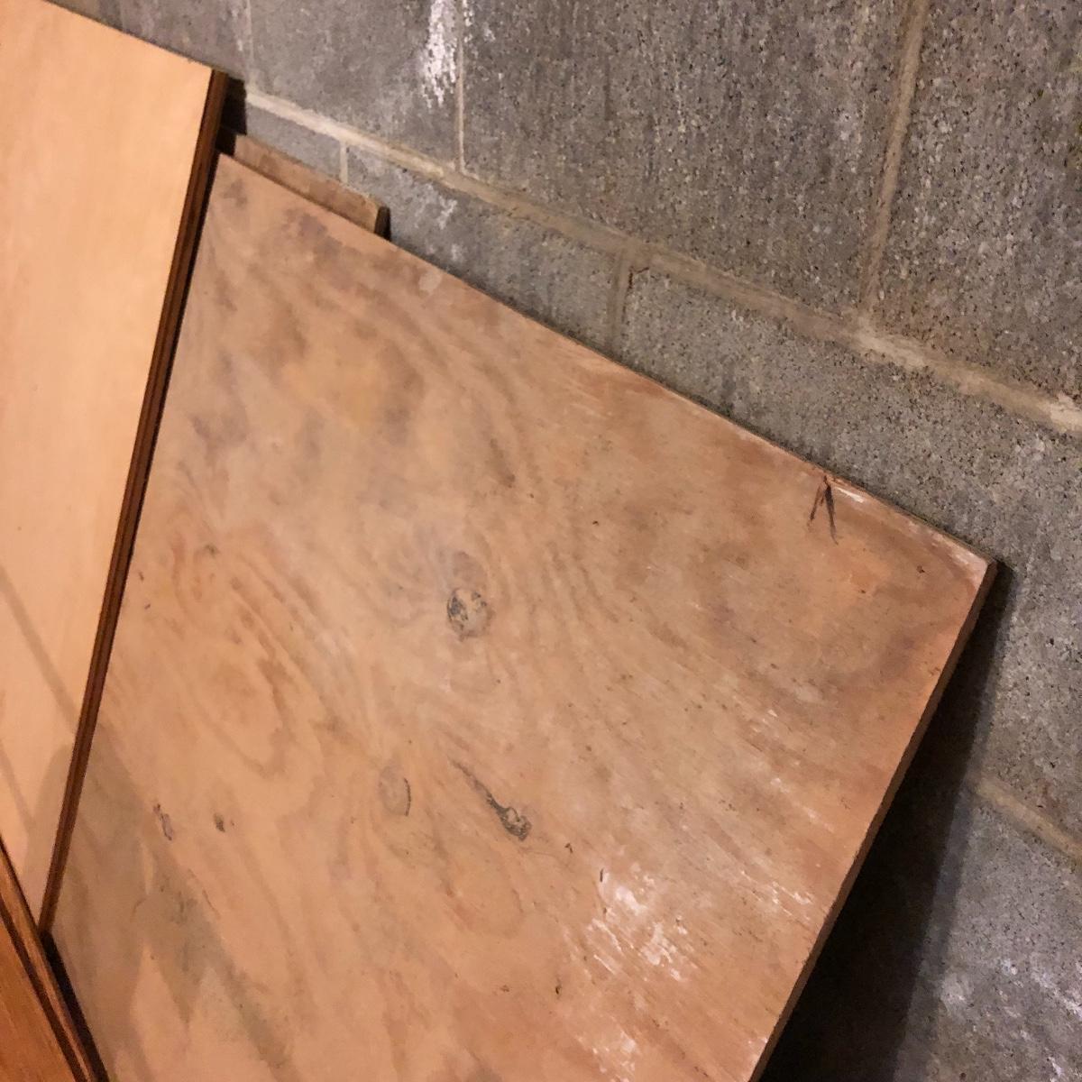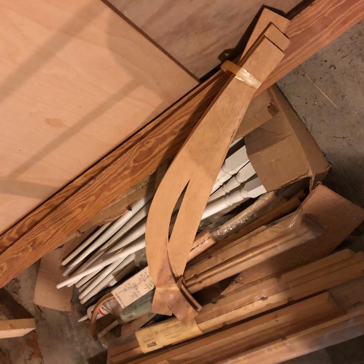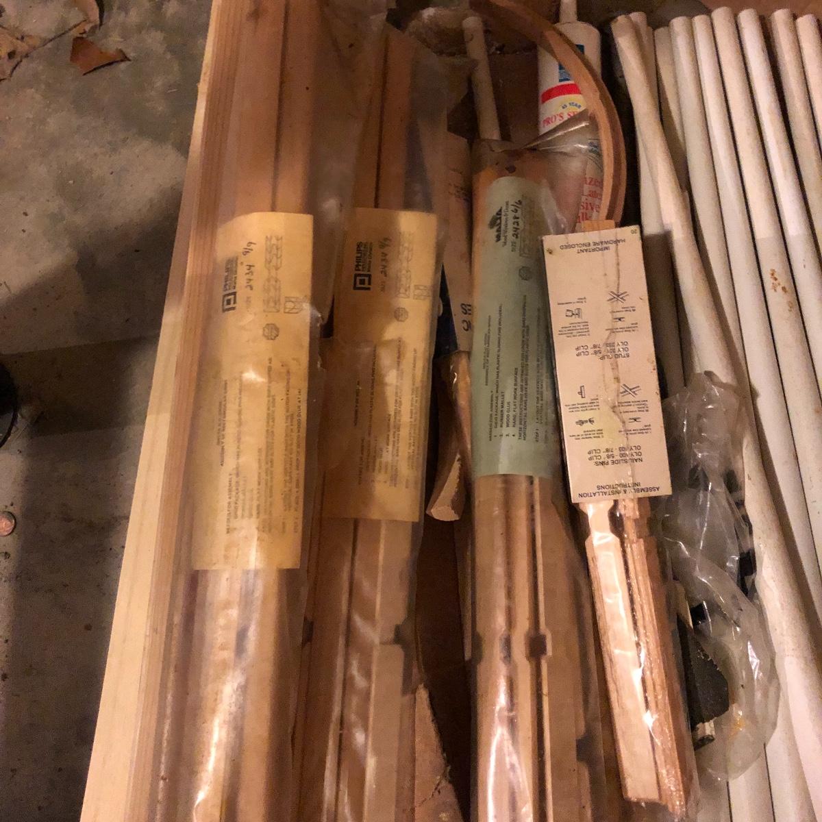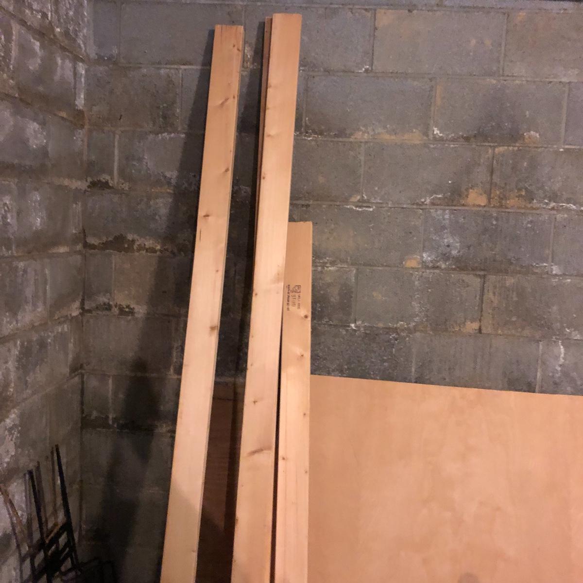 This stuff is like gold nowadays.! Lot includes three eight foot 2 x 4s, half sheet of 3/4” plywood, three partial sheets of 1/2” plywood that is used, thirteen spindles, two sets of rectangular grid wood and a few more pieces.