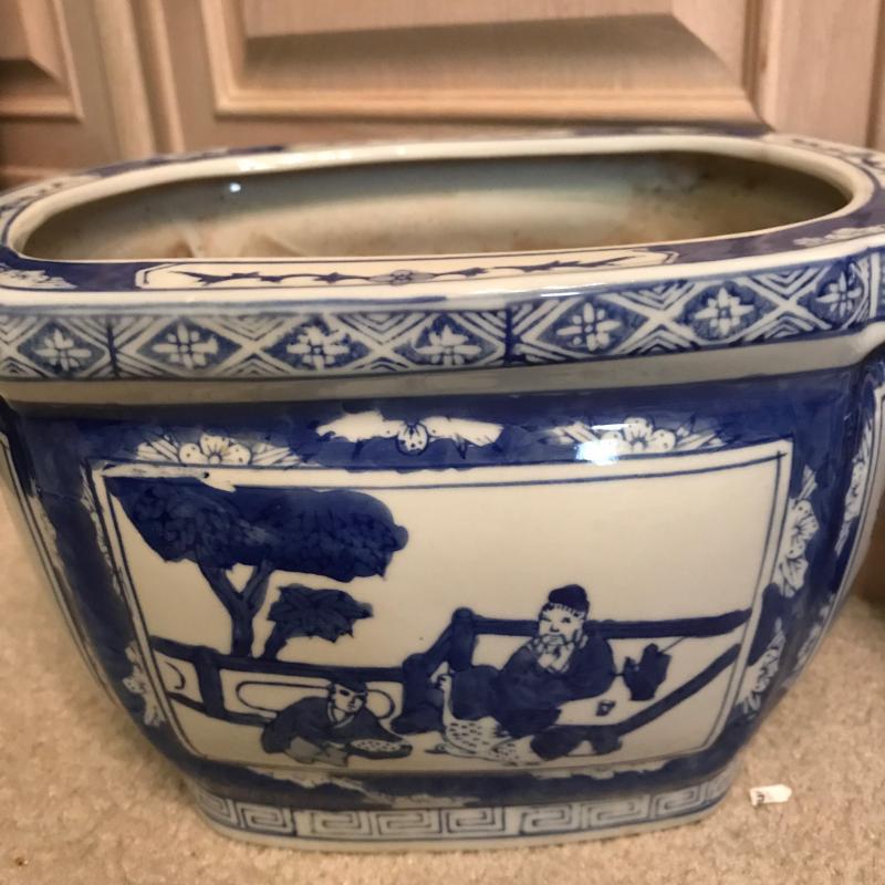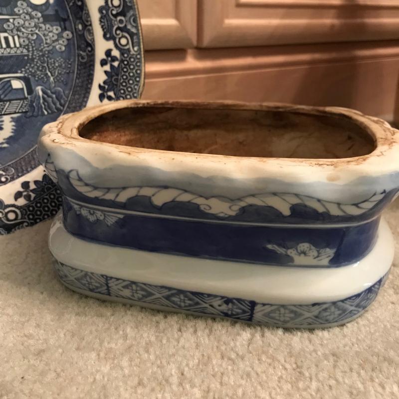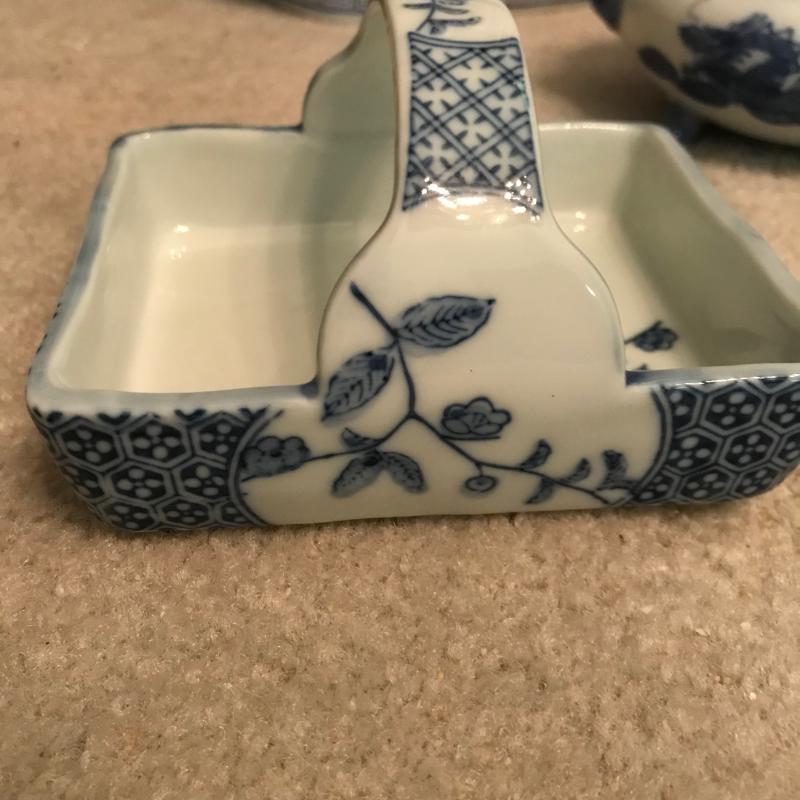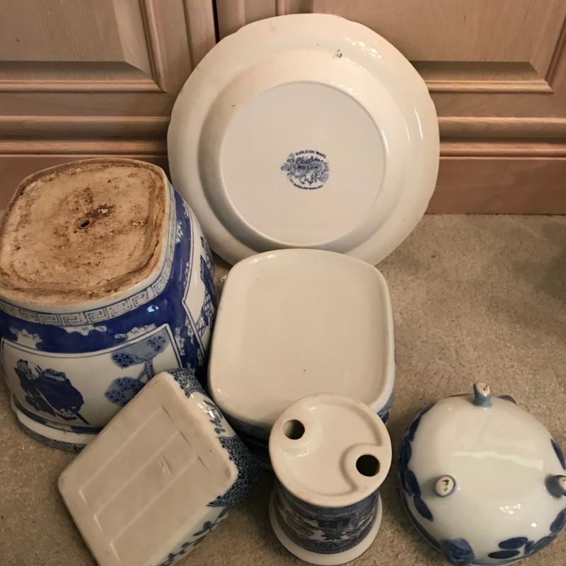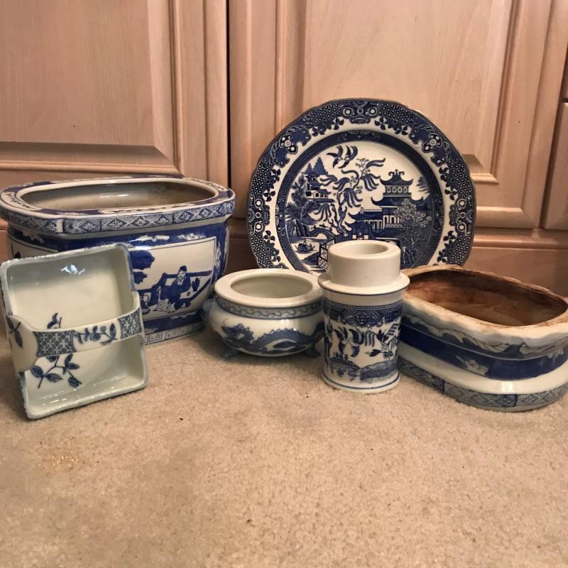 Six pieces of blue and white pottery in various shapes and sizes. See pics. Shipping available or local pickup.