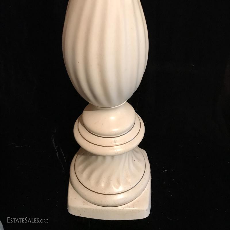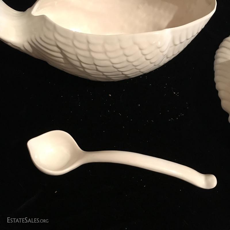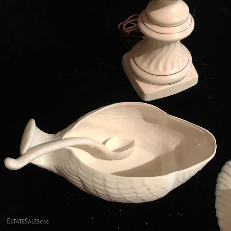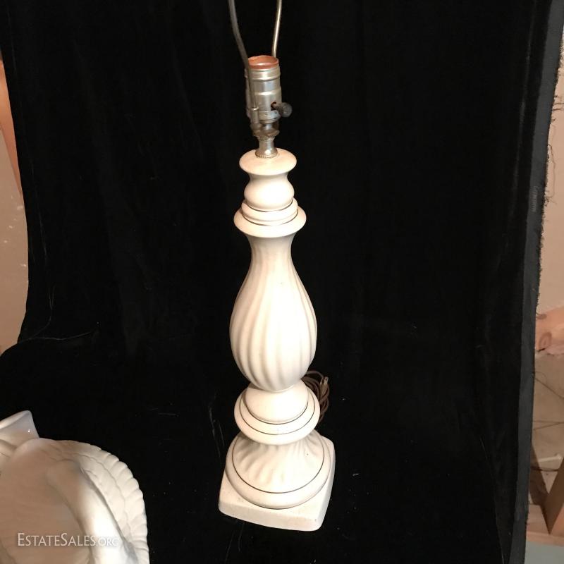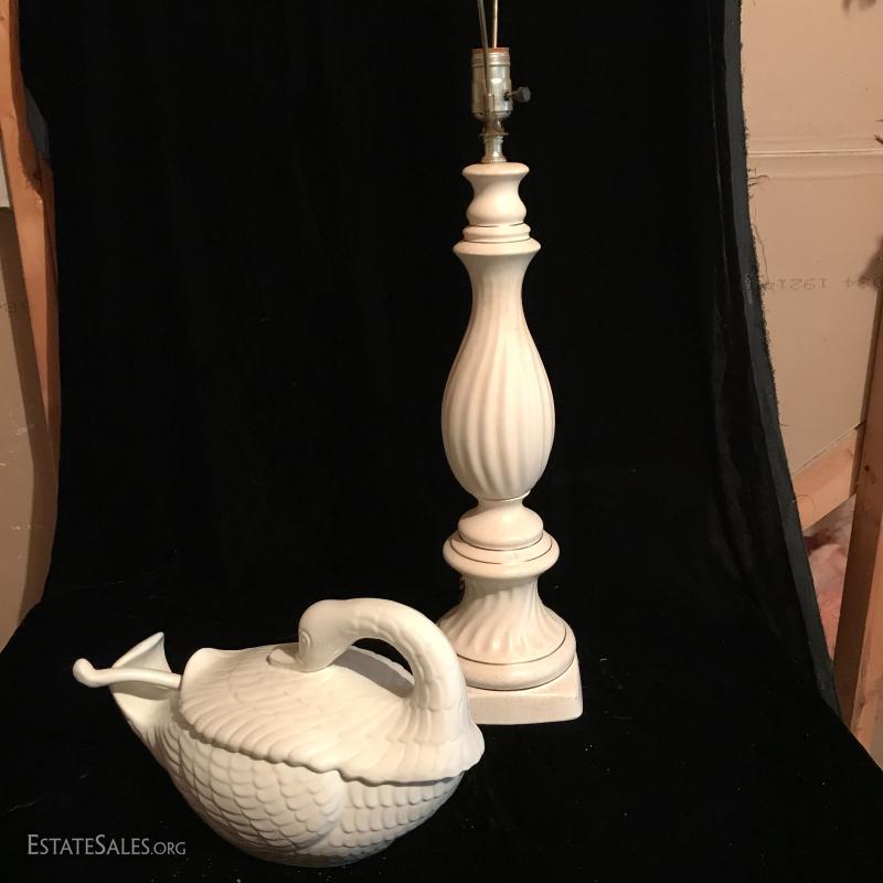 Ceramic lamp is white with gold accents and stands 32.5" tall. Ceramic swan soup tureen with ceramic ladle is in great condition and measures 14" x 7.5" x 9". This lot is available for local pick up only in Flat Rock, NC.