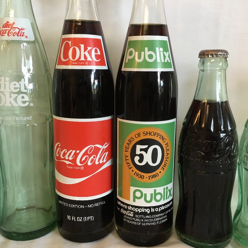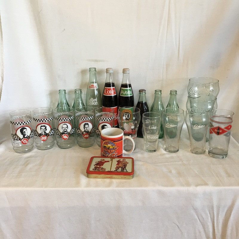 Who doesn't love Coca Cola. Add this great collection of Coca Cola memorabilia to your collection with glasses and bottles including five NASCAR glasses, seven Coke glasses, playing cards, coffee cup, two full Publix commemorative bottles and one small bottle and five empty bottles.