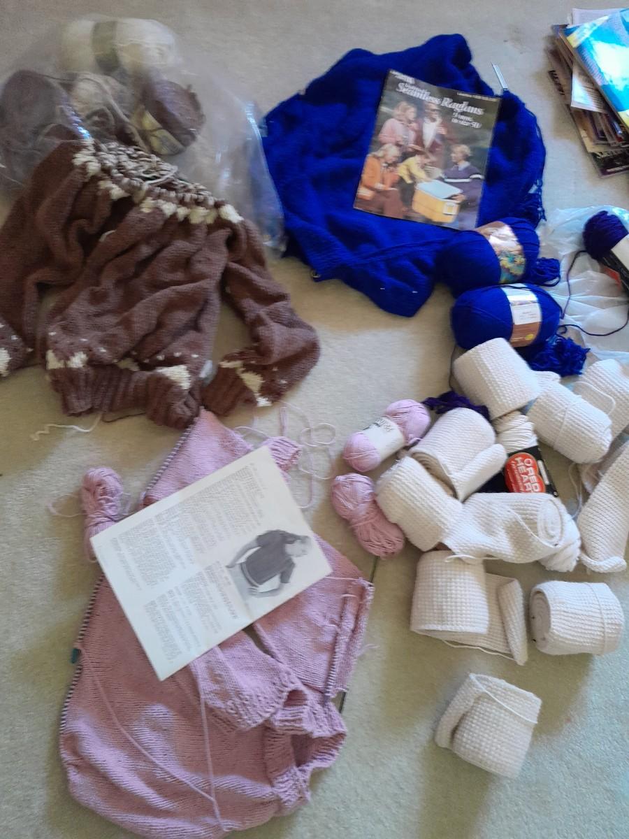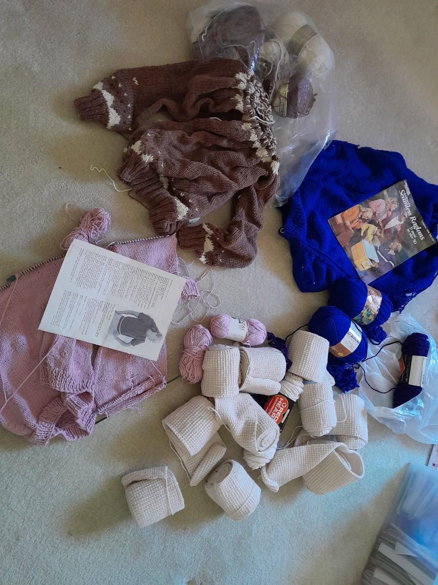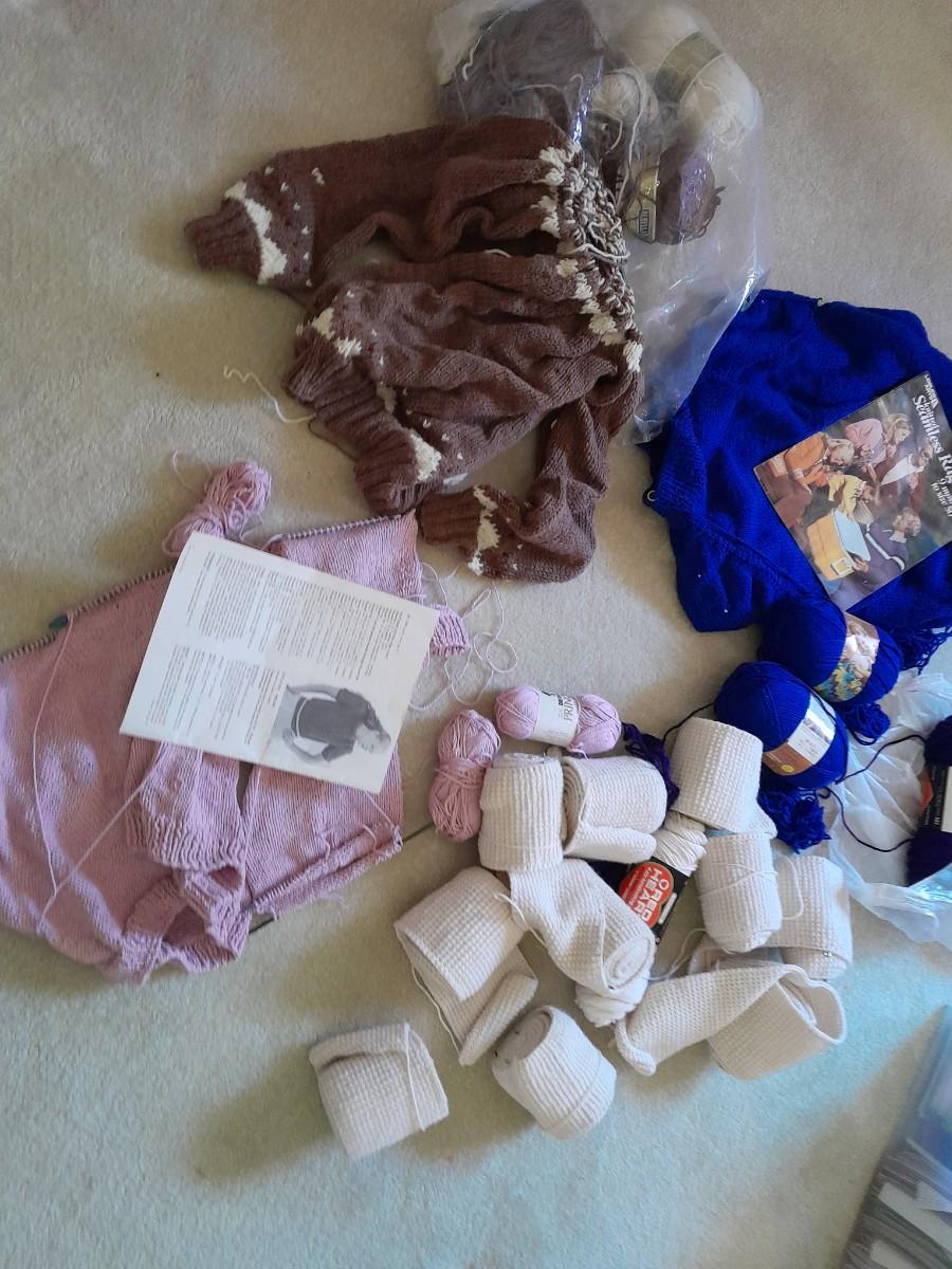 CROCHET AND KNIT PROJECTS ALREADY STARTED WITH EXTRA YARN SKEINS AND KNITTING NEEDLES.