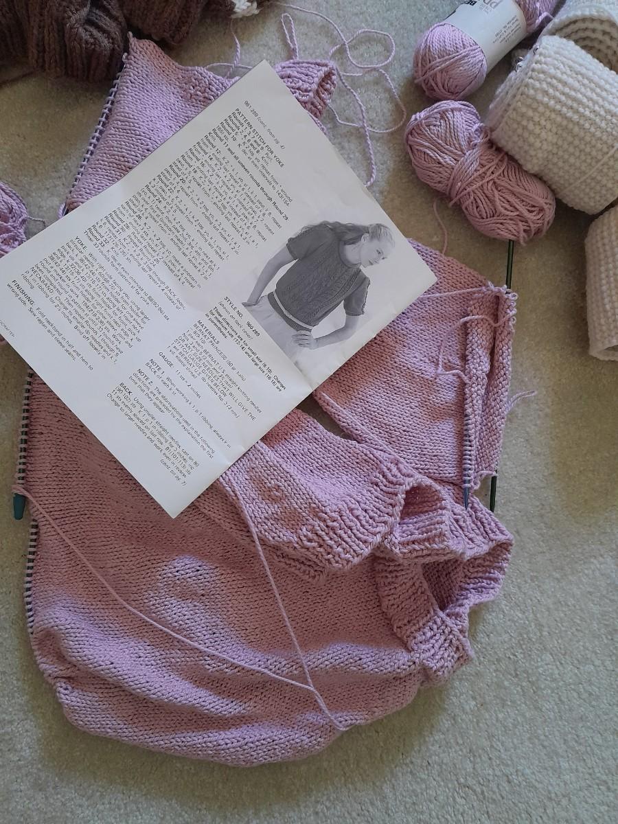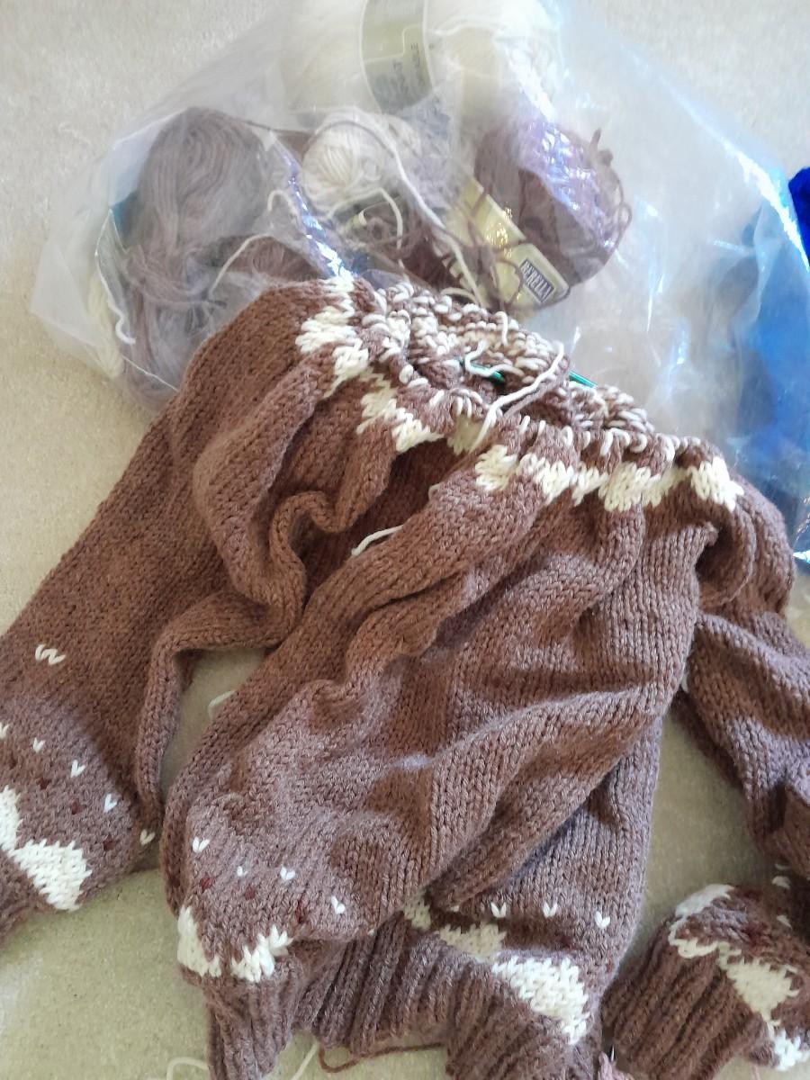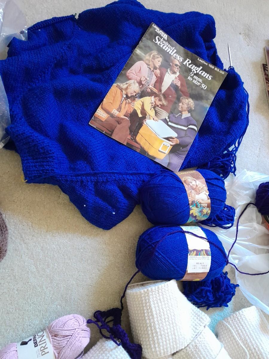 CROCHET AND KNIT PROJECTS ALREADY STARTED WITH EXTRA YARN SKEINS AND KNITTING NEEDLES.