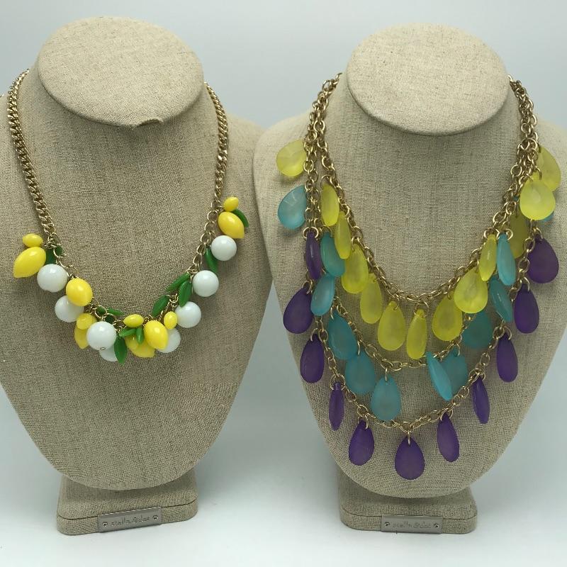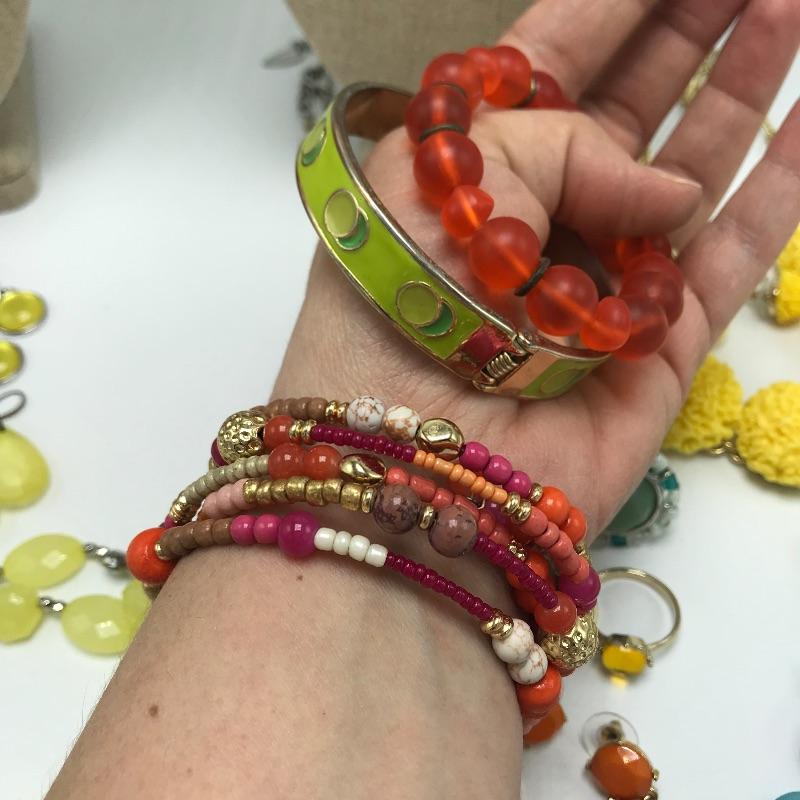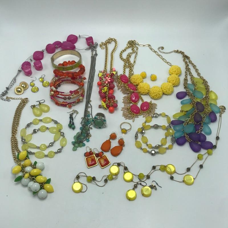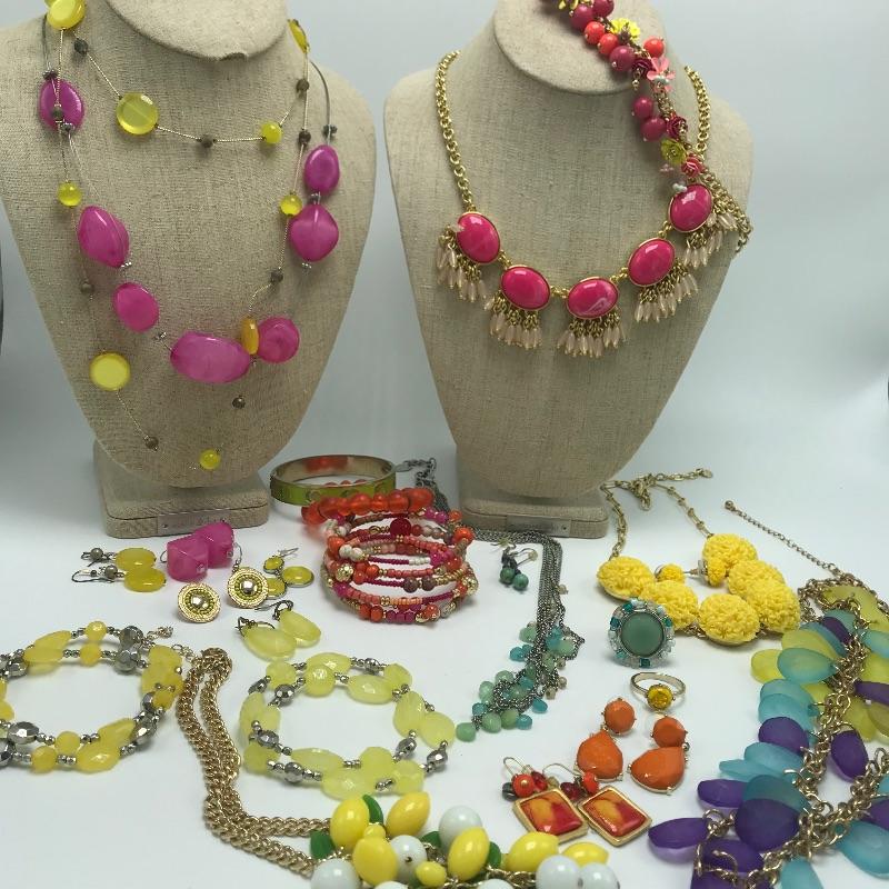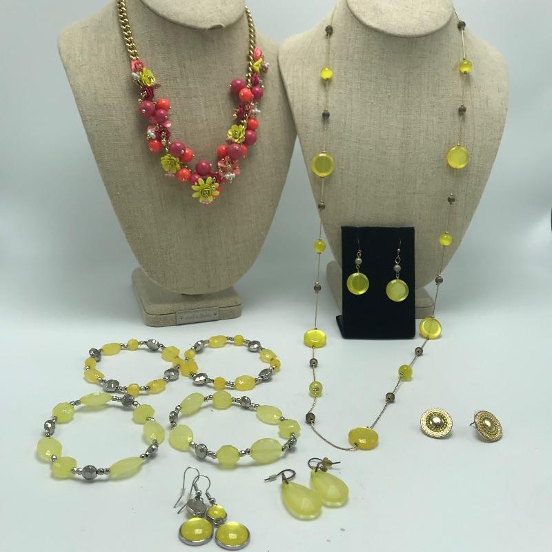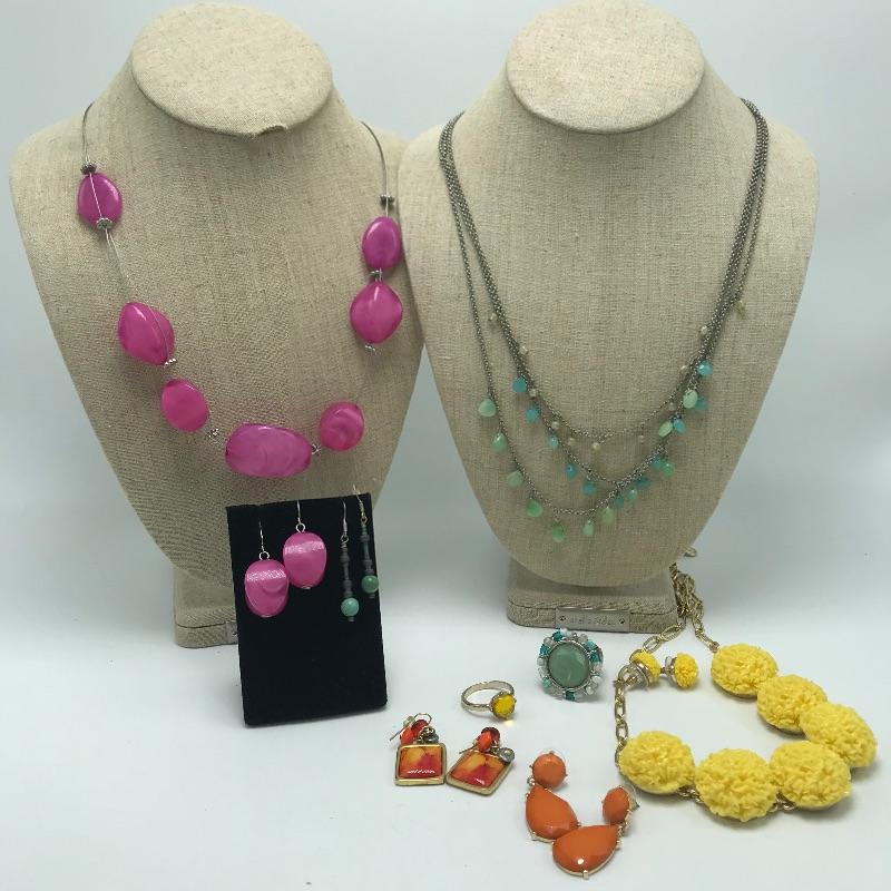Sweet collection to brighten up any look. A few sets mixed in and yet another great opportunity to mix and match. Brand names like Talbots and Charming Charlie’s. Green ring is an expandable ring.