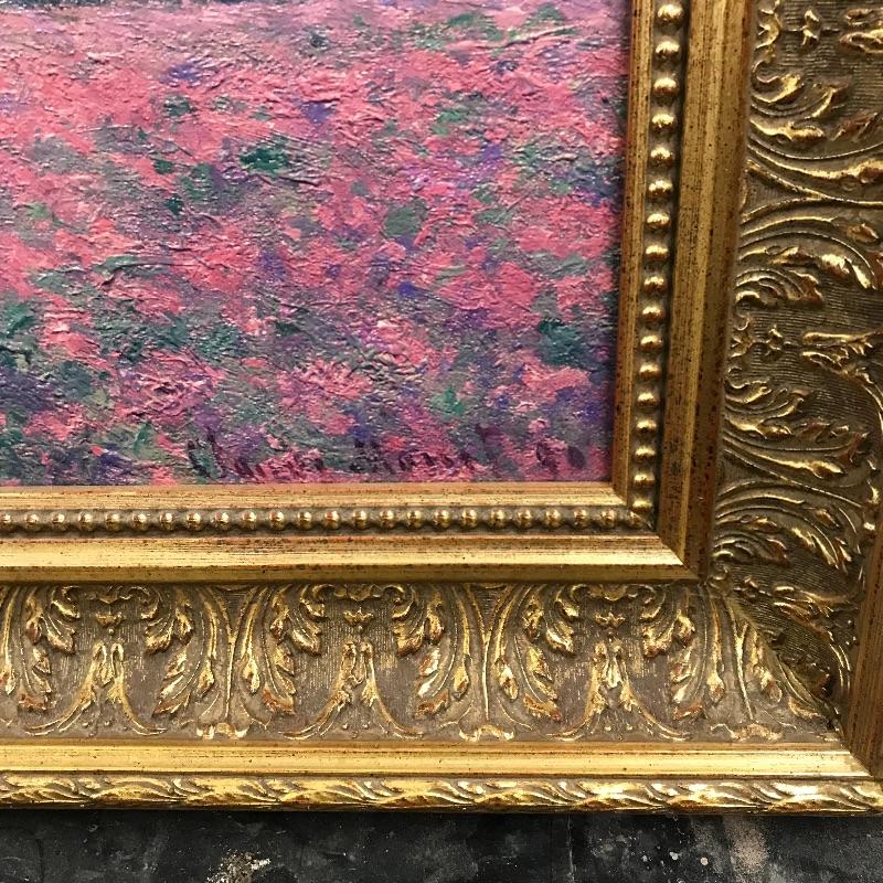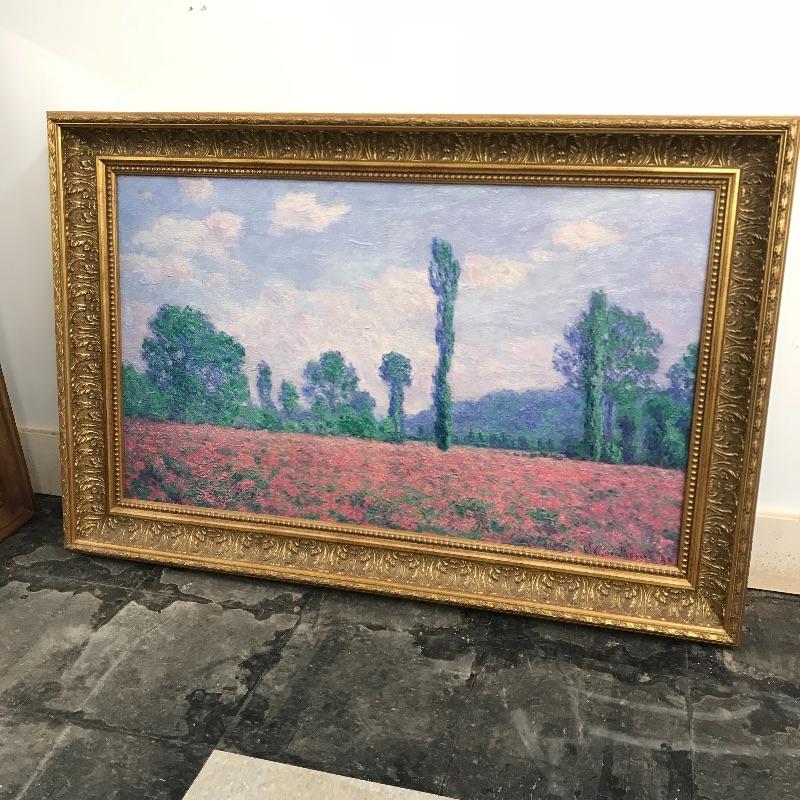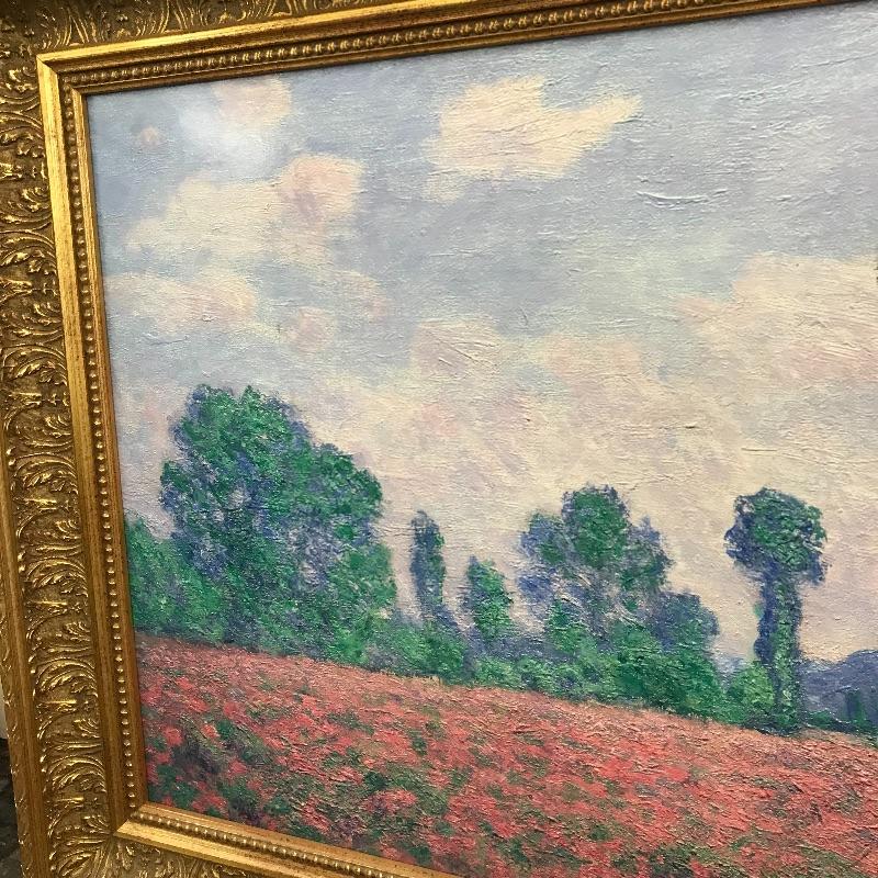 Claude Monet’s Field of Poppies near Giverny, 1890 print in a gold painted wooden frame measuring 46” x 31”. The paper on the back states state of the art digital image processing. The print itself shows details make it appear to be a true original oil painting. Frame is in great condition and ready for hanging. Local pick up only.