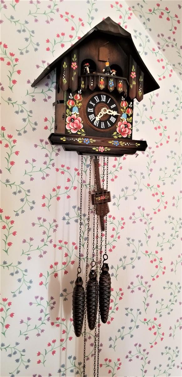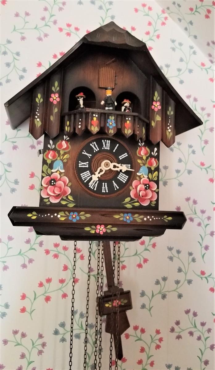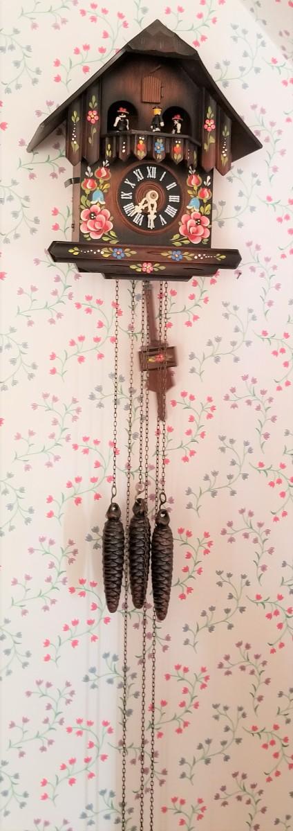 Cute German Cuckoo clock - working condition, plays "Edelweiss" while the little figures dance around. Complete - three weights. 10.5" tall, 9.5" wide