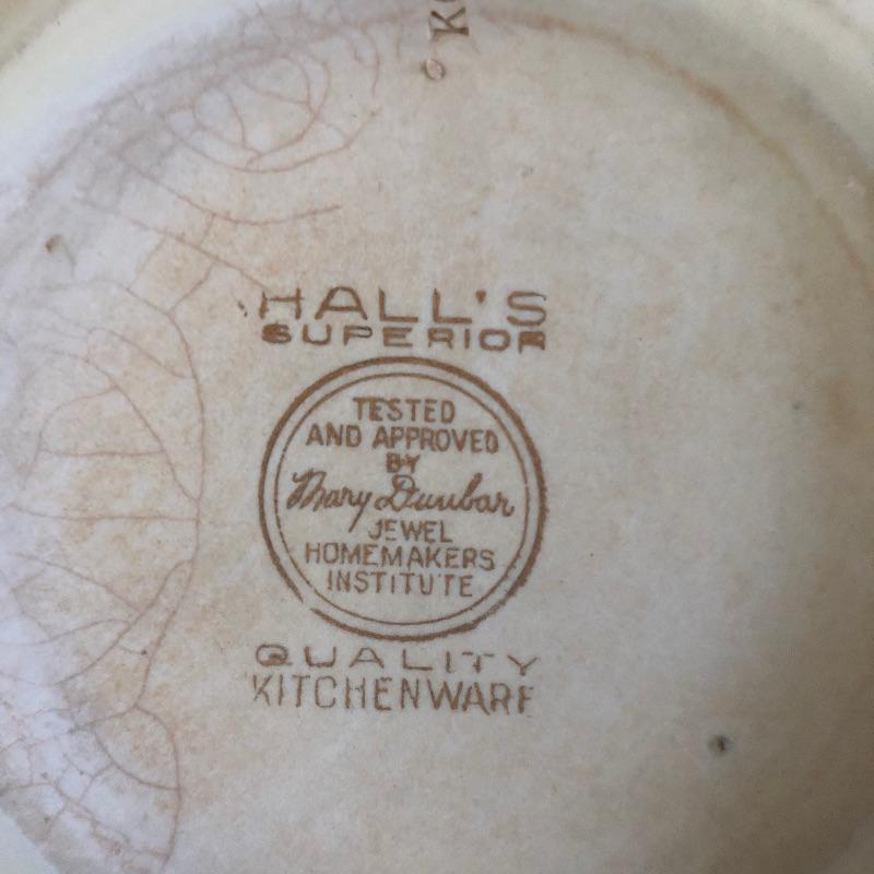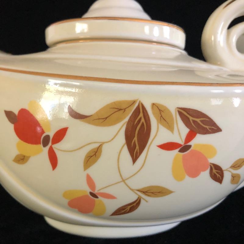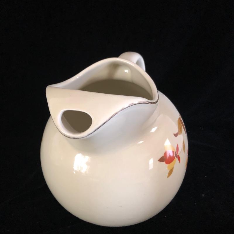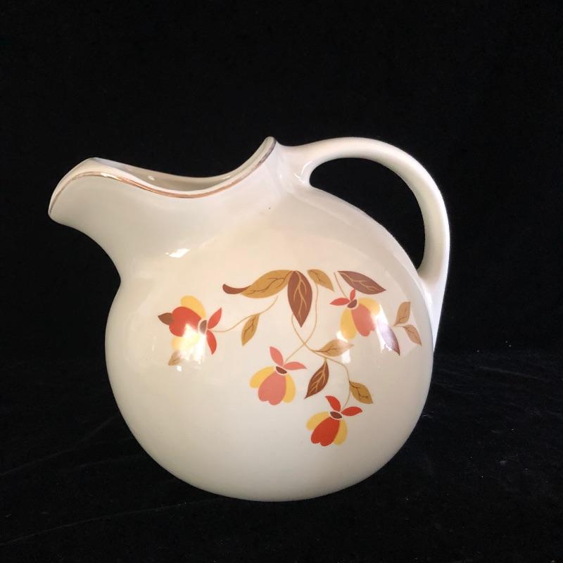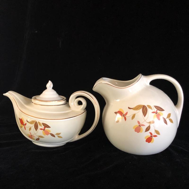 This matching pair of Hall pieces are beautiful with a retro vibe in their Autumn Harvest design. Made in 2002 the teapot comes with a handy built in tea strainer that tea connoisseurs will appreciate. Shaped in Hall’s Genie Aladdin style this superior piece is a stunner. The Hall tilt pitcher is matching and measures 8” tall and has a small amount of crazing underneath.