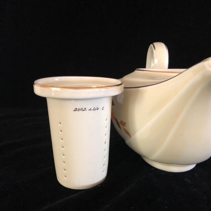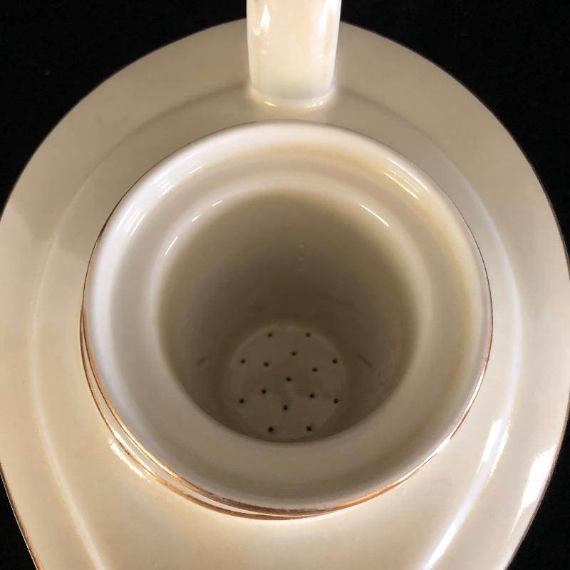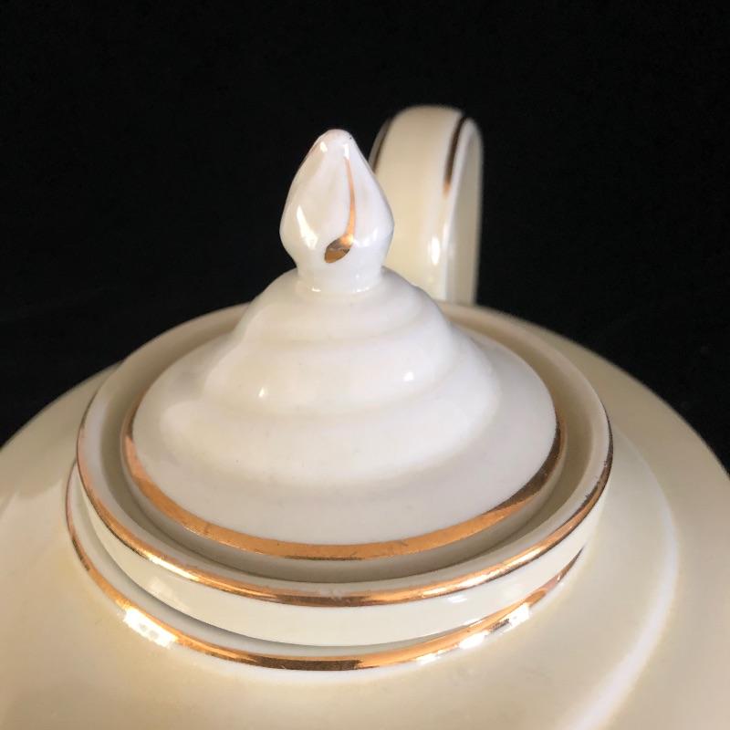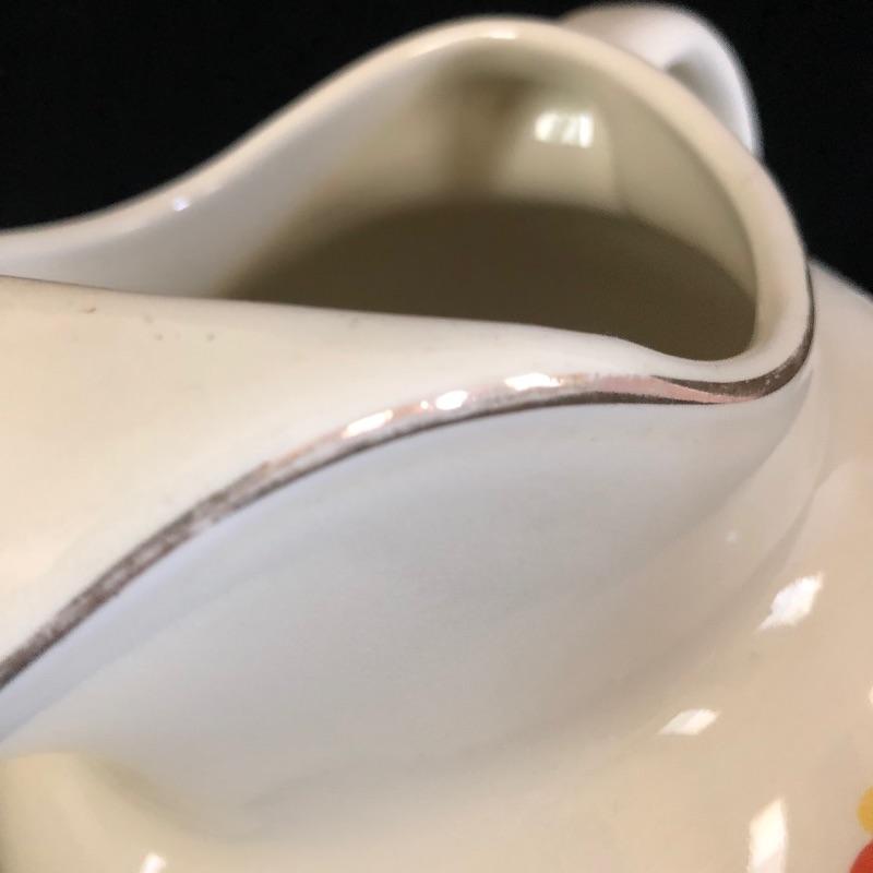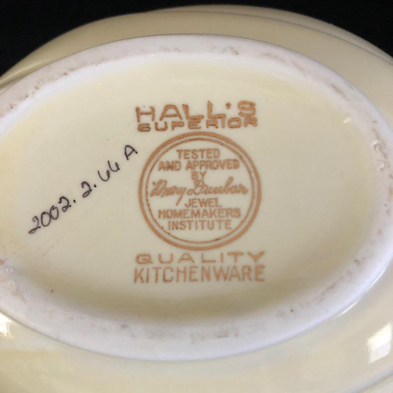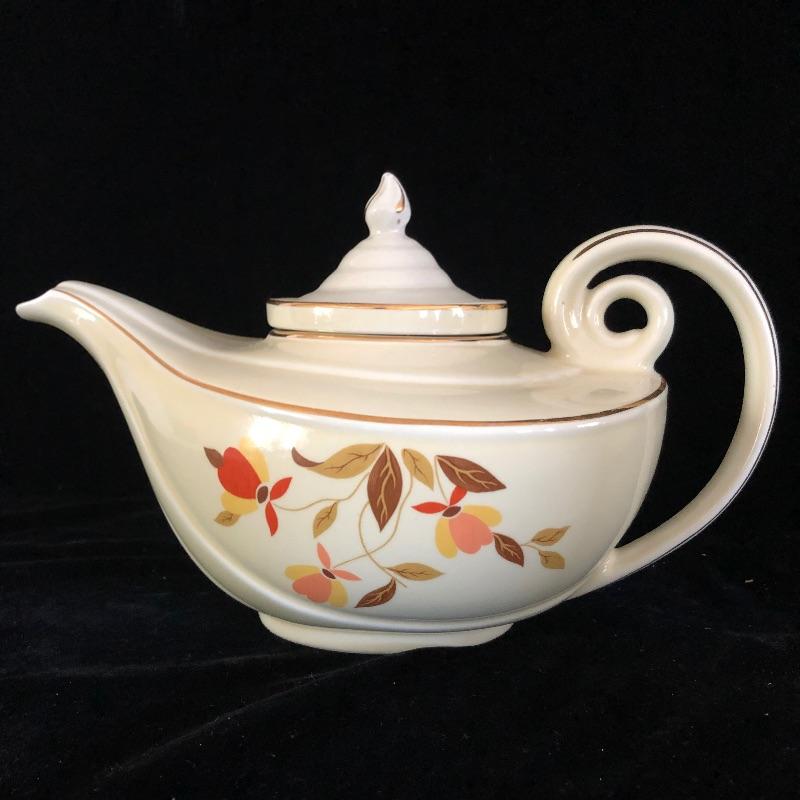 This matching pair of Hall pieces are beautiful with a retro vibe in their Autumn Harvest design. Made in 2002 the teapot comes with a handy built in tea strainer that tea connoisseurs will appreciate. Shaped in Hall’s Genie Aladdin style this superior piece is a stunner. The Hall tilt pitcher is matching and measures 8” tall and has a small amount of crazing underneath.