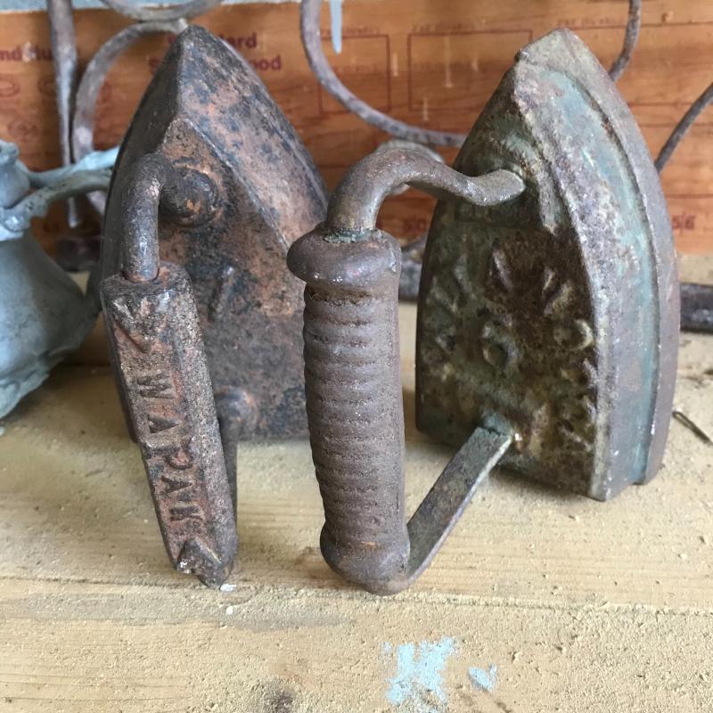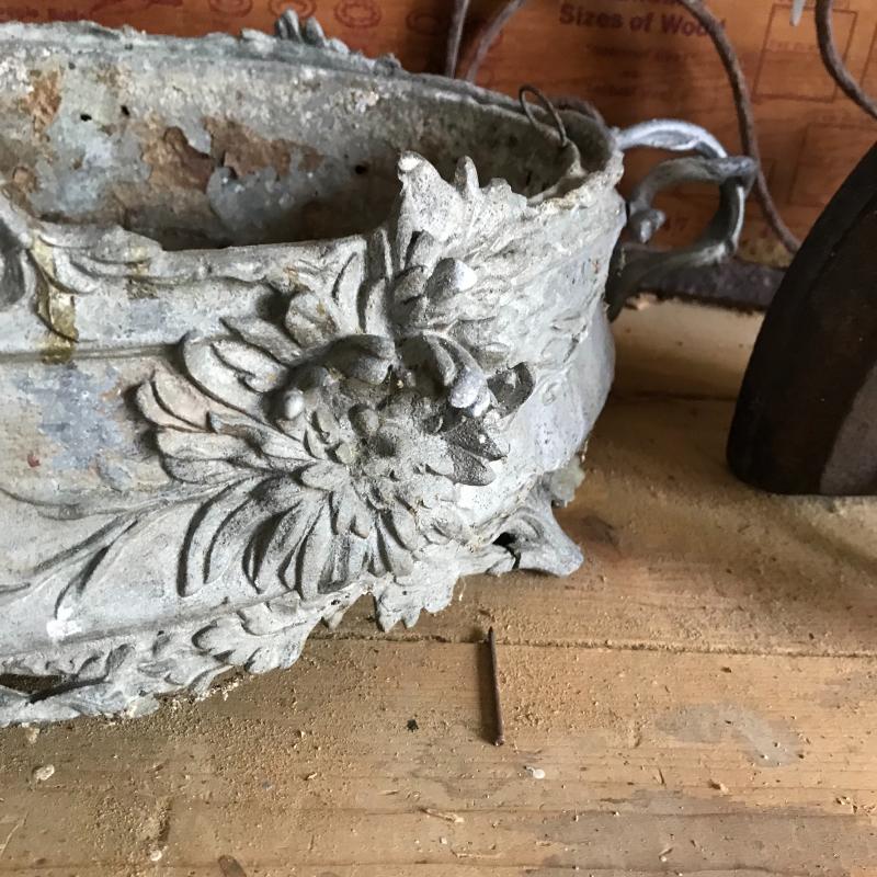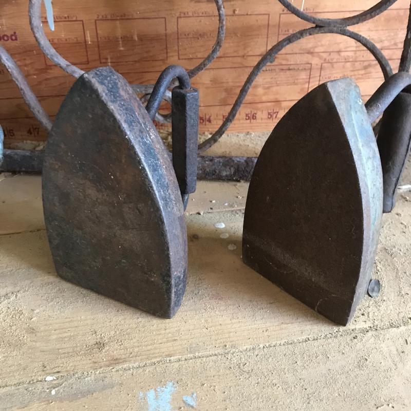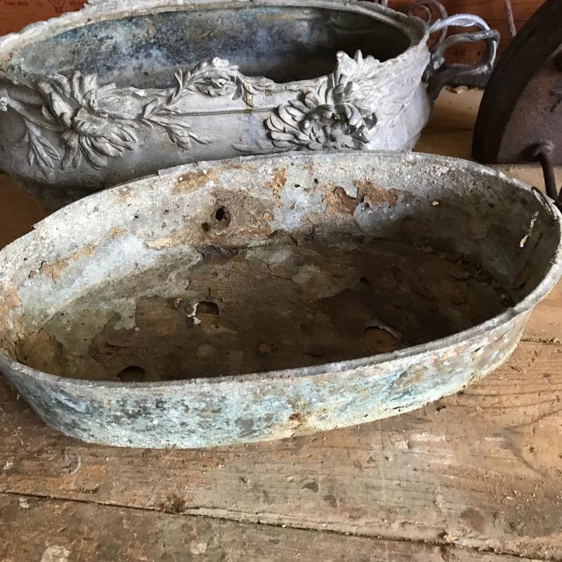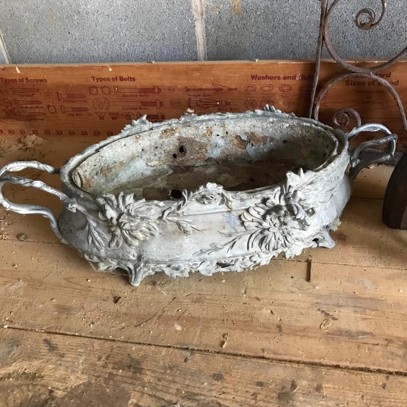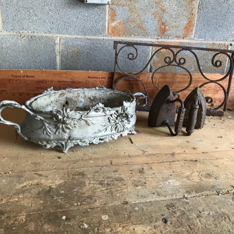 Galvanized planter with detail work. Two antique irons and an iron scroll that measures 18.5” x 10”. This lot is available for local pick up in Flat Rock, NC.