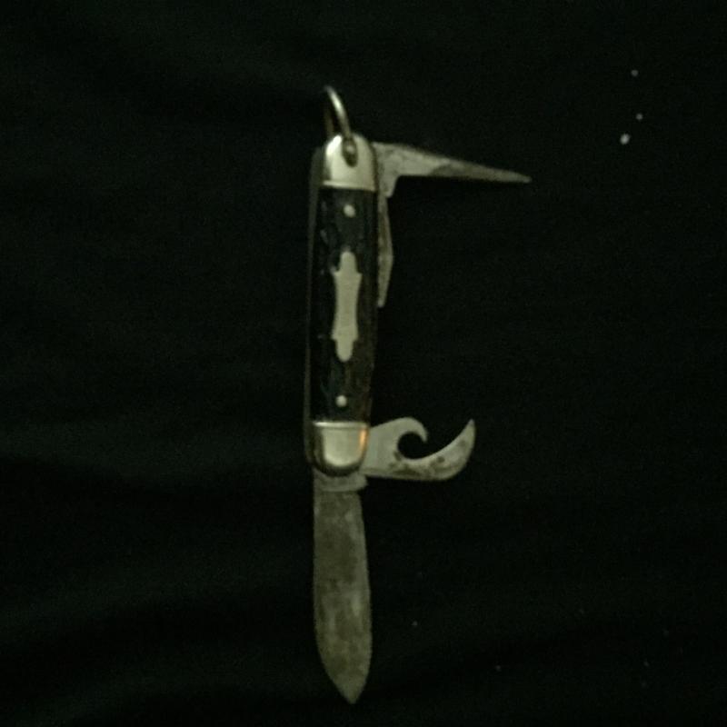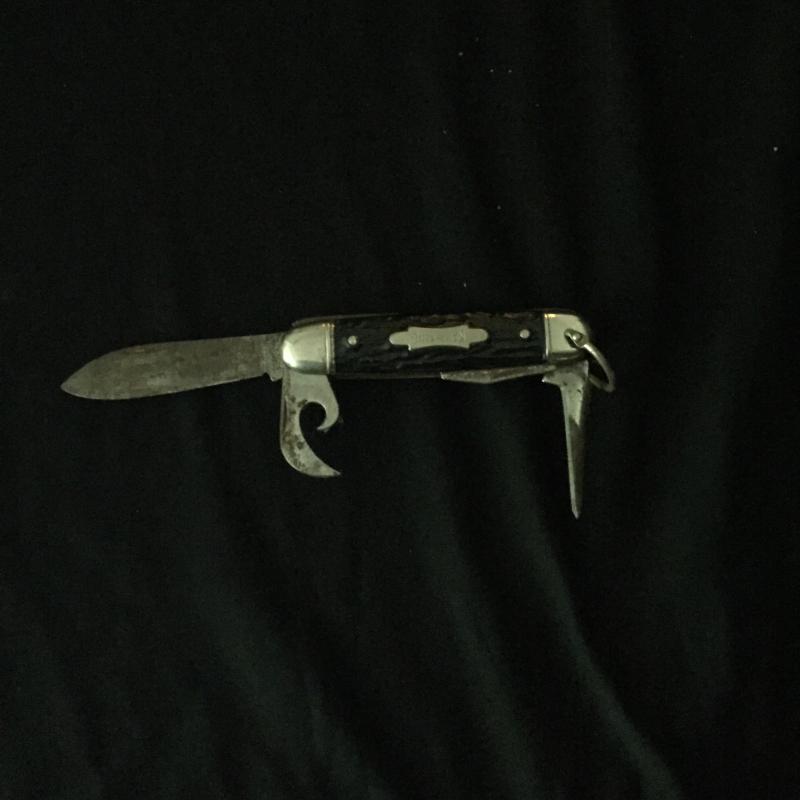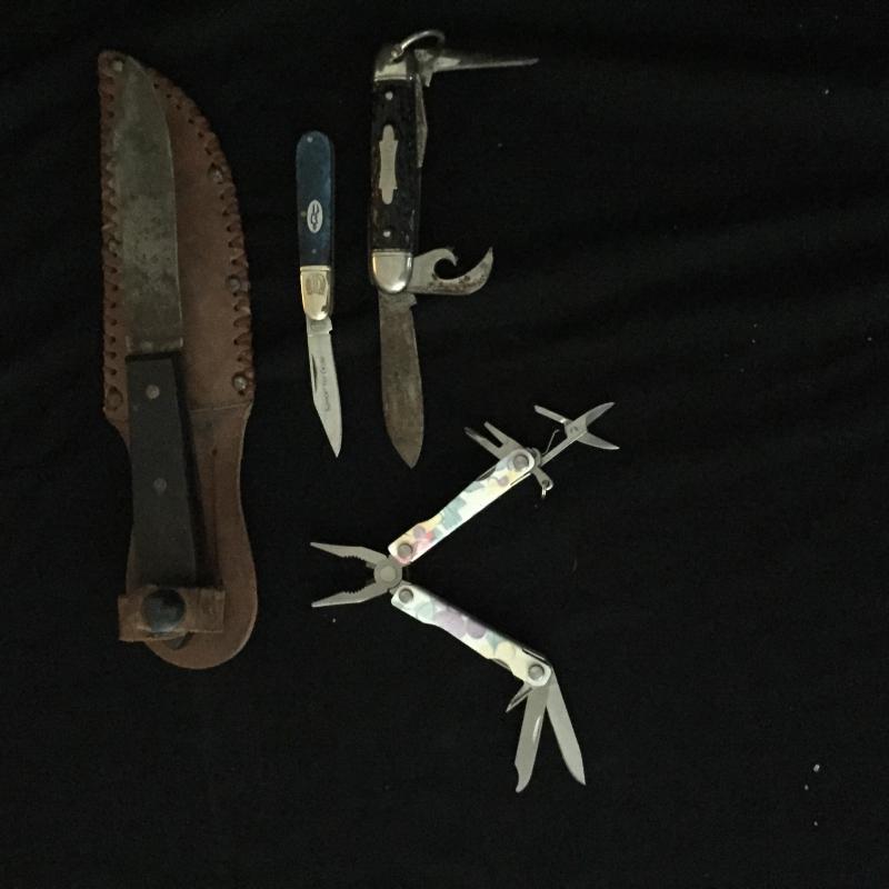 Lot of Knives includes a Multi Tool by Kamp-King and a metal knife in leather carrier that measures 8.5”. A few other knifes included. Local pick up only.