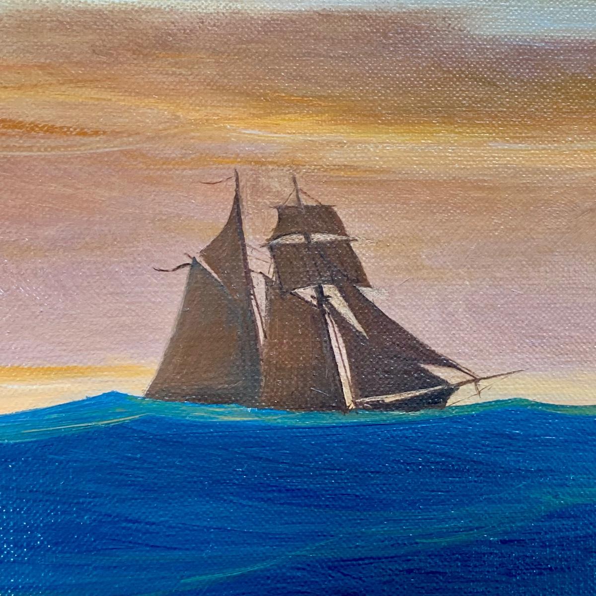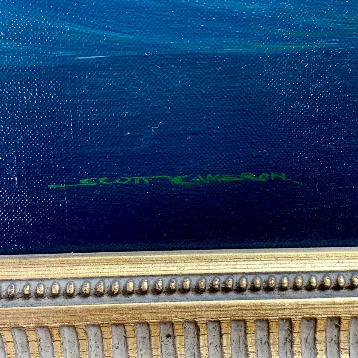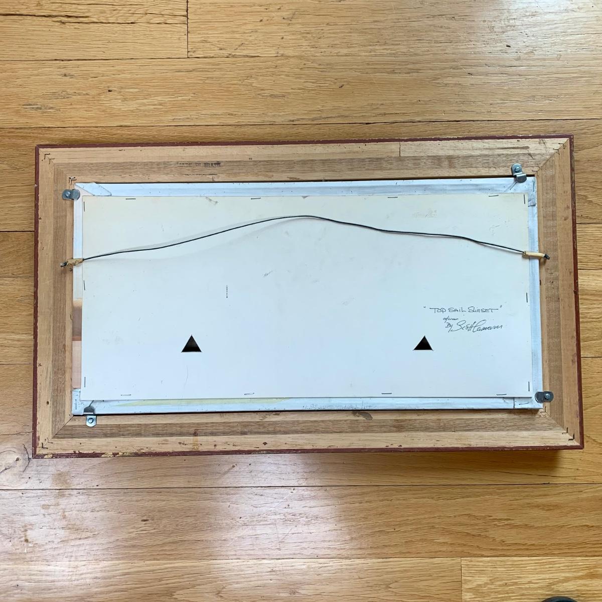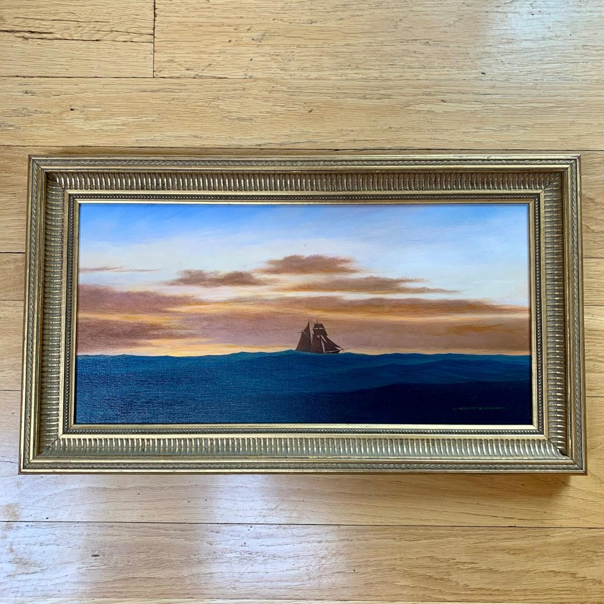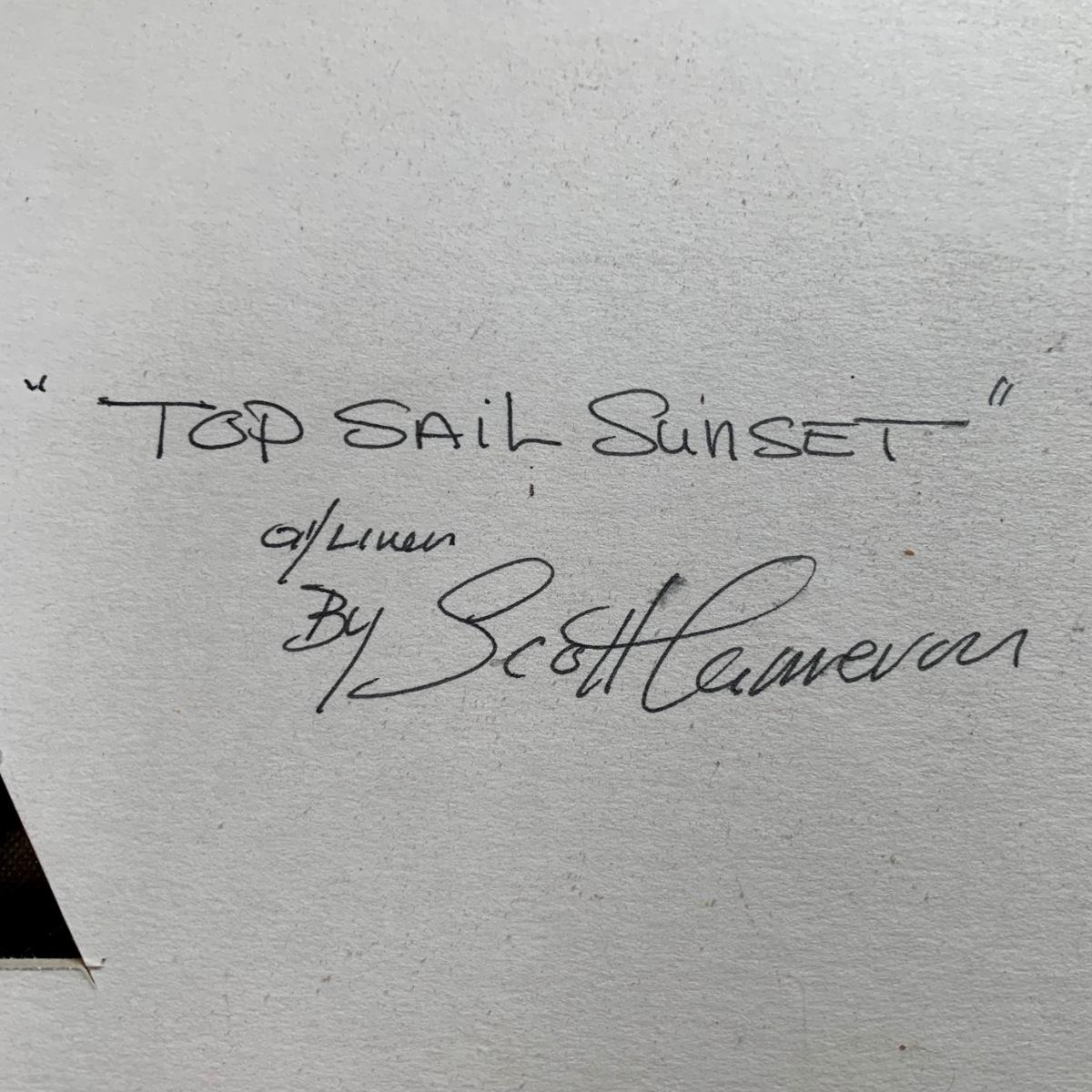 LOT 187 L: Signed Framed Oil Painting on Canvas: "Top Sail Sunset" by Scott Cameron (American, late 20 century)