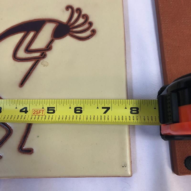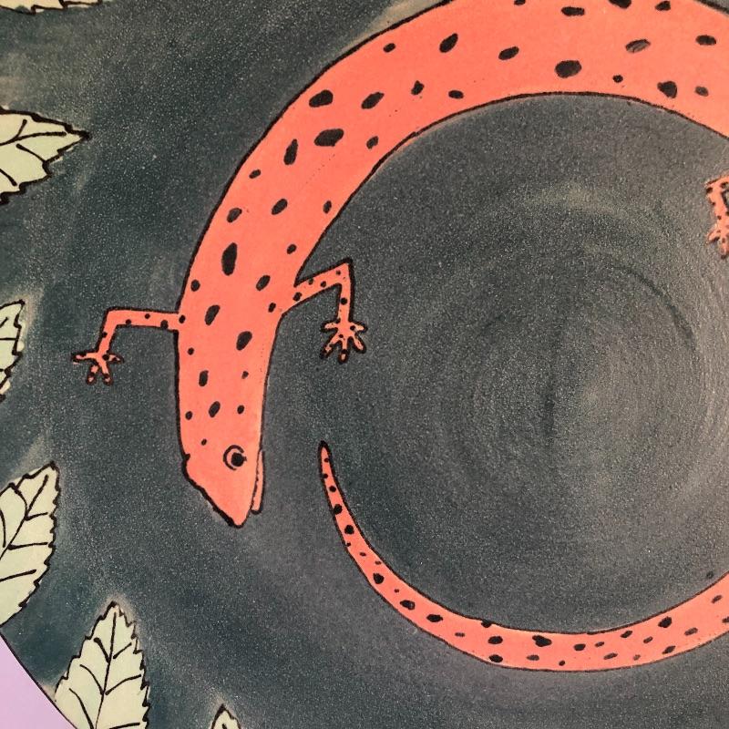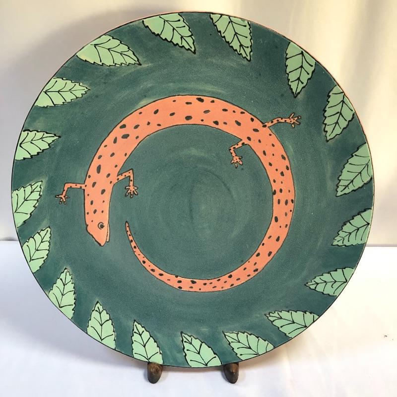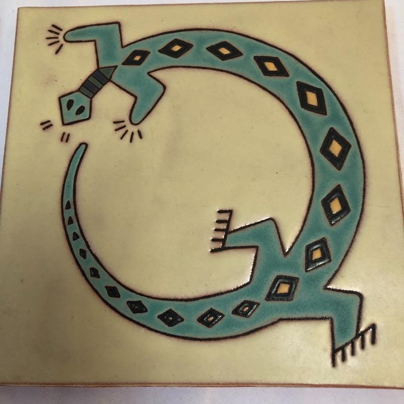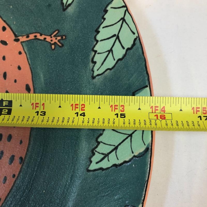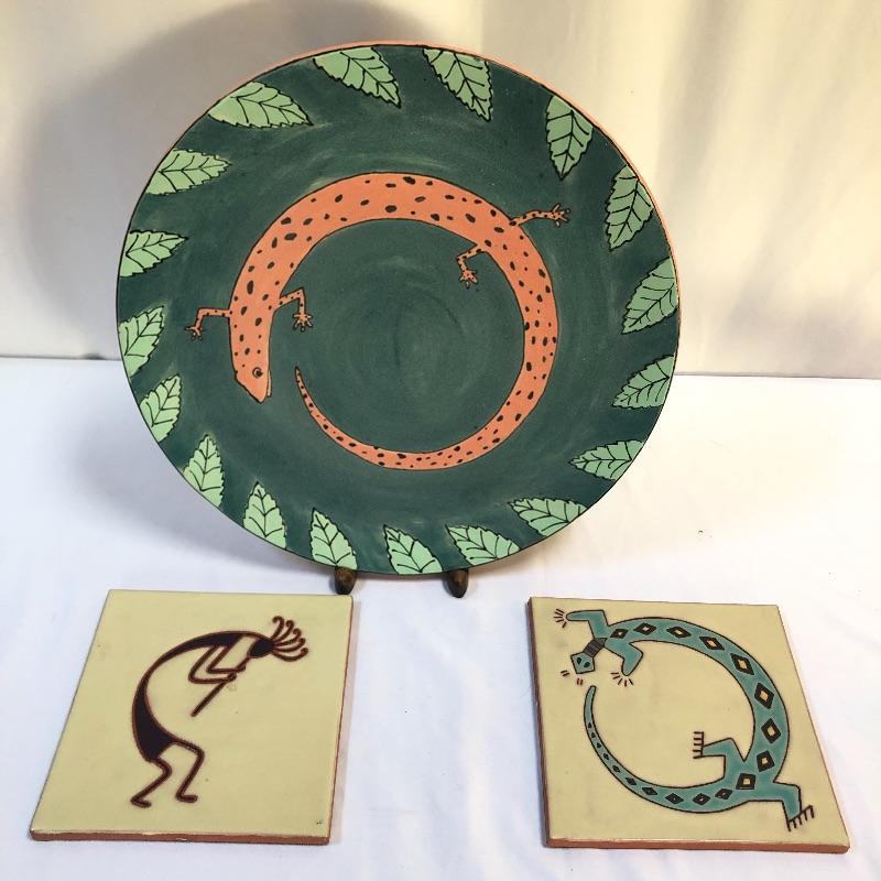 This large stoneware ceramic platter is an eye catching piece with its pink salamander design on a teal blue background. We have paired this gorgeous platter with 2 primitive style glazed tiles/trivets that are terra-cotta.