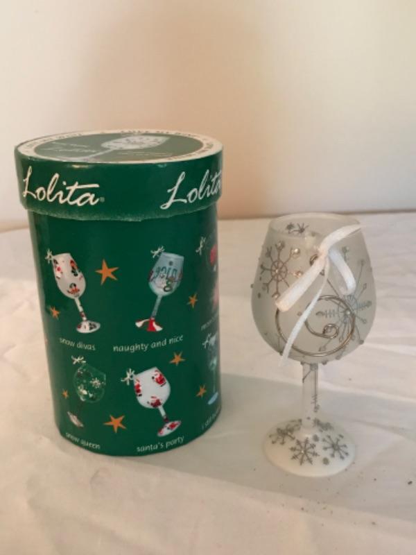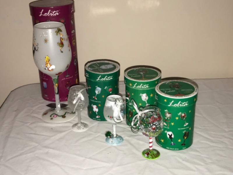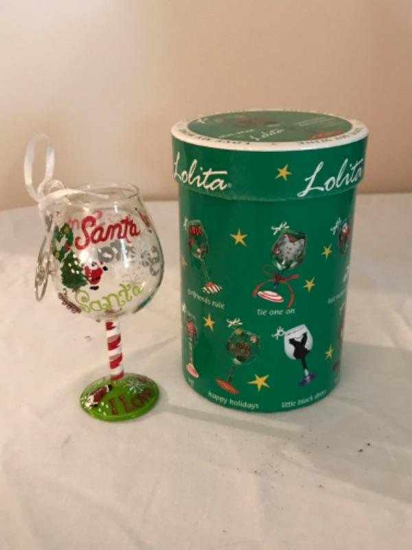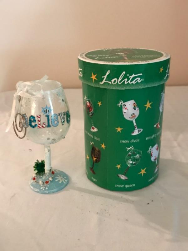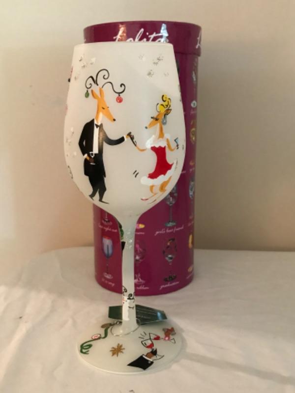 Hand painted, 15 oz. Reindeer Holiday wine glass with recipe on bottom. Three hand painted mini wine glasses Silver Snowflake, I Still Believe and I Love Santa