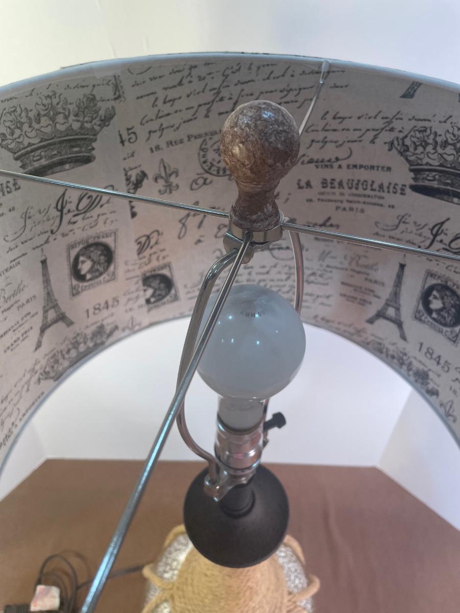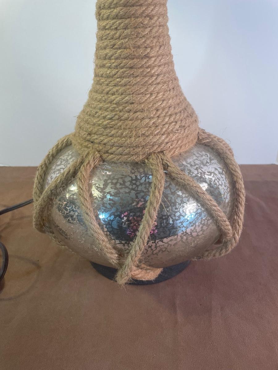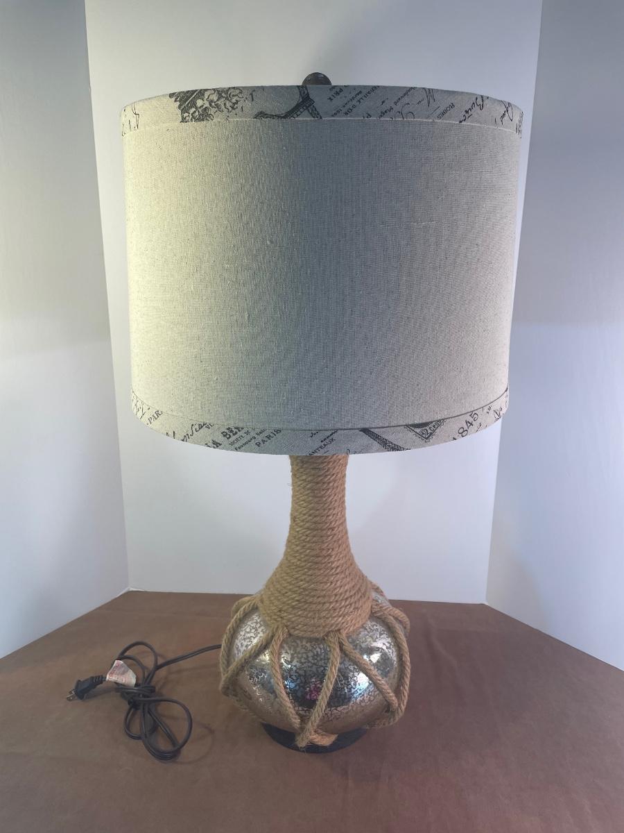 28" tall with rope detail, shade has patterned lining. excellent condition