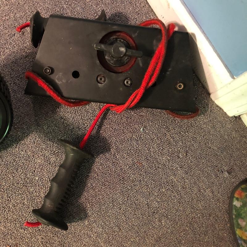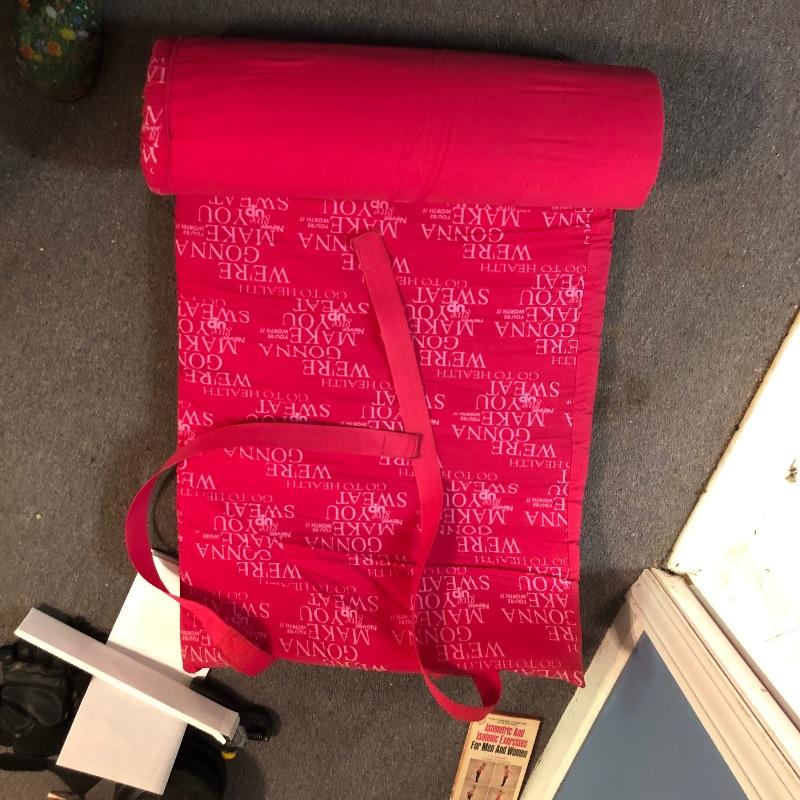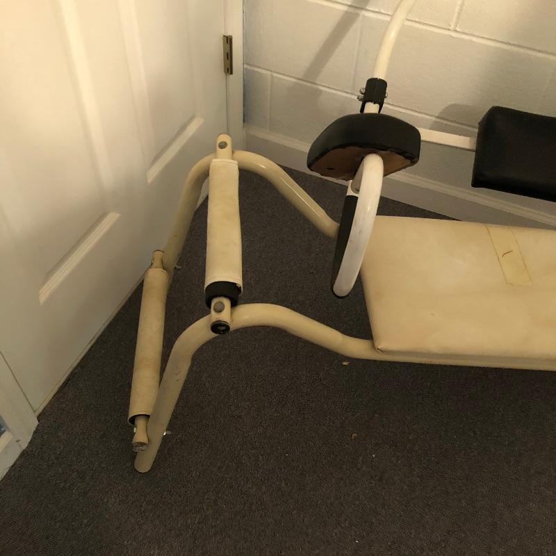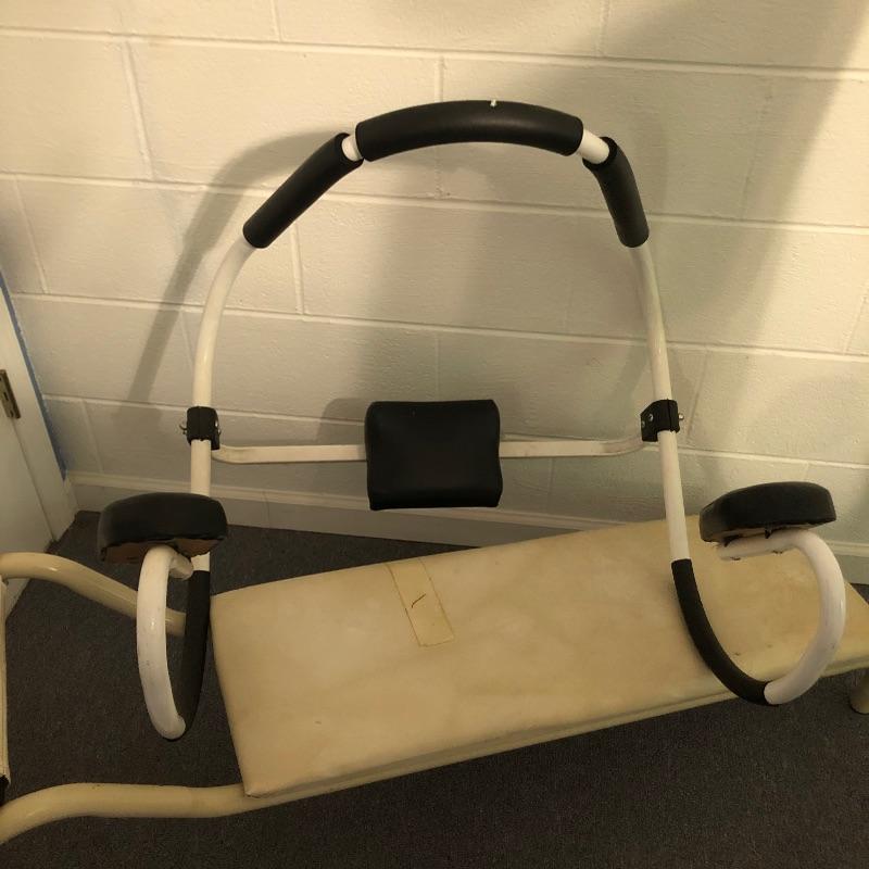 Some useful pieces of workout equipment here, see images for everything that is included. Just some of the many items included are a small workout bench, stomach cruncher, weights, yoga mat and exercise ball and a shoulder pulls apparatus with two red ropes.
