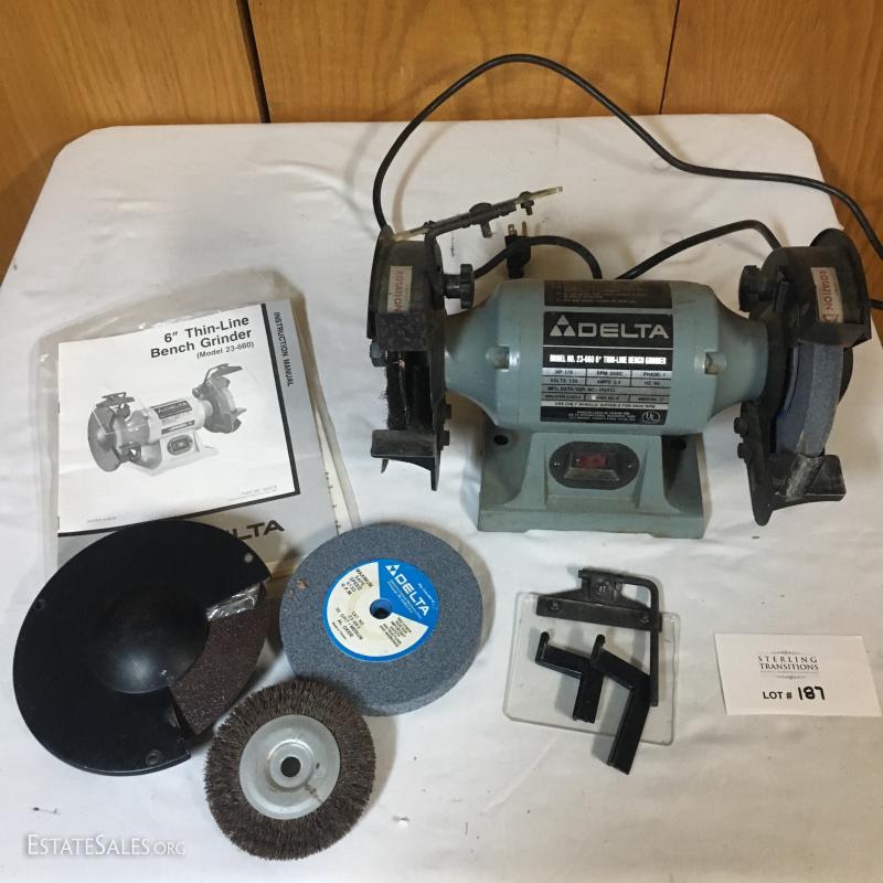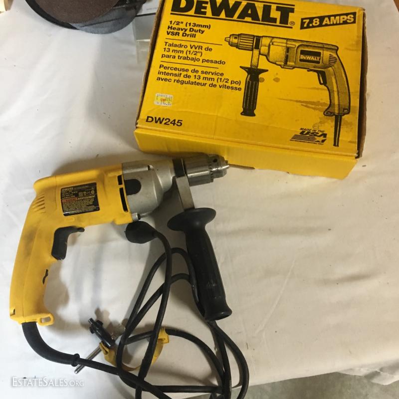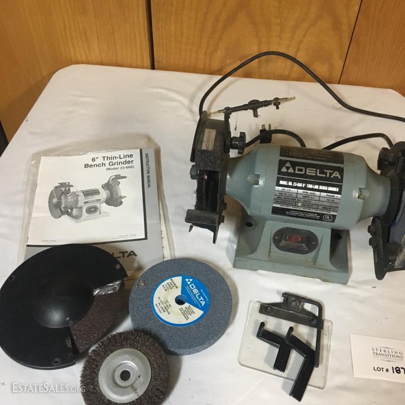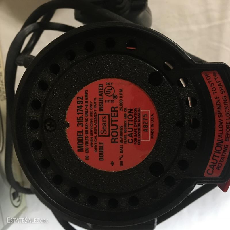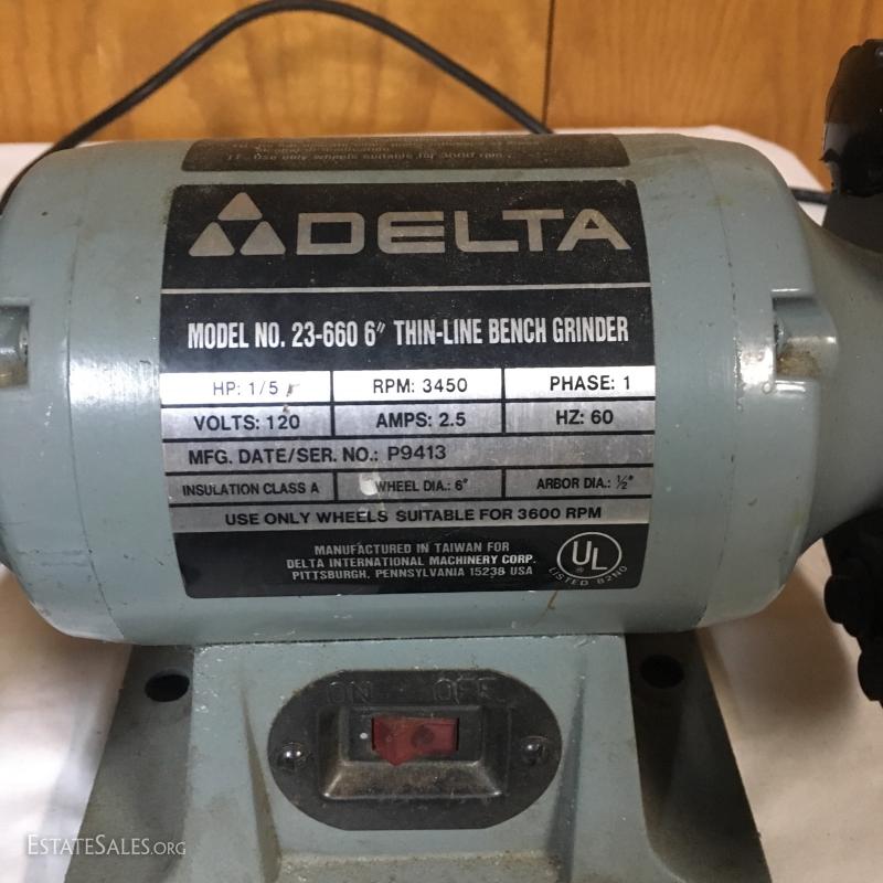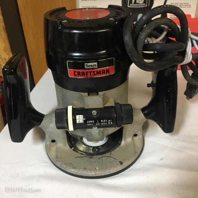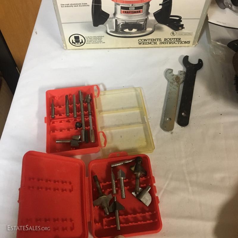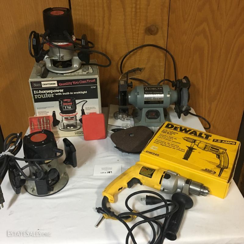 Delta 6" thin line bench grinder (Model 23-660), Craftsman Router (1.5 horsepower with built in work light), DeWalt 7.8amps heavy duty VSR Drill and a Craftsman Double Insulated Router. All ran when plugged in but are as is where is when picked up.