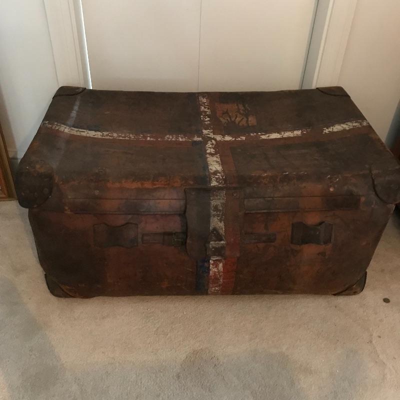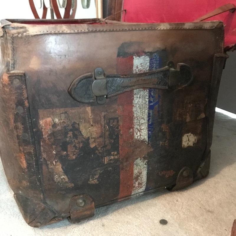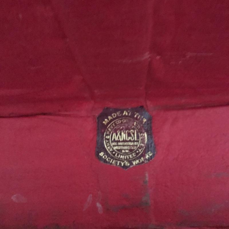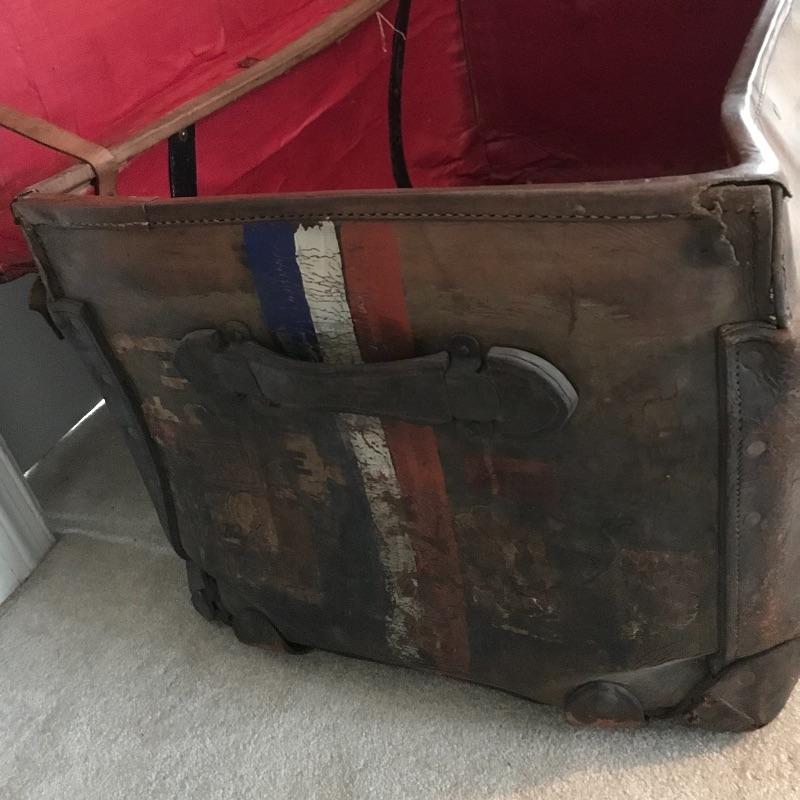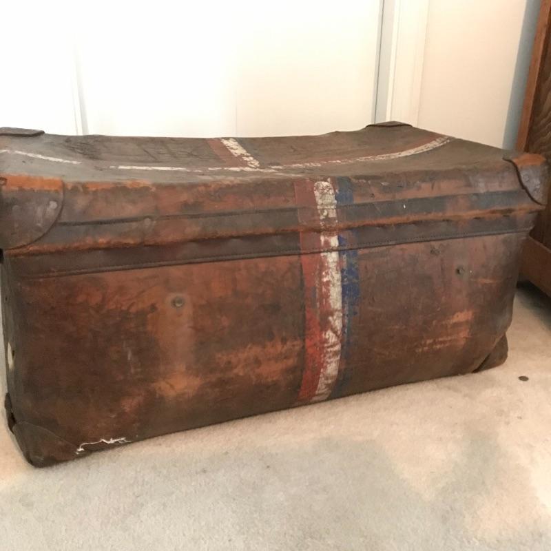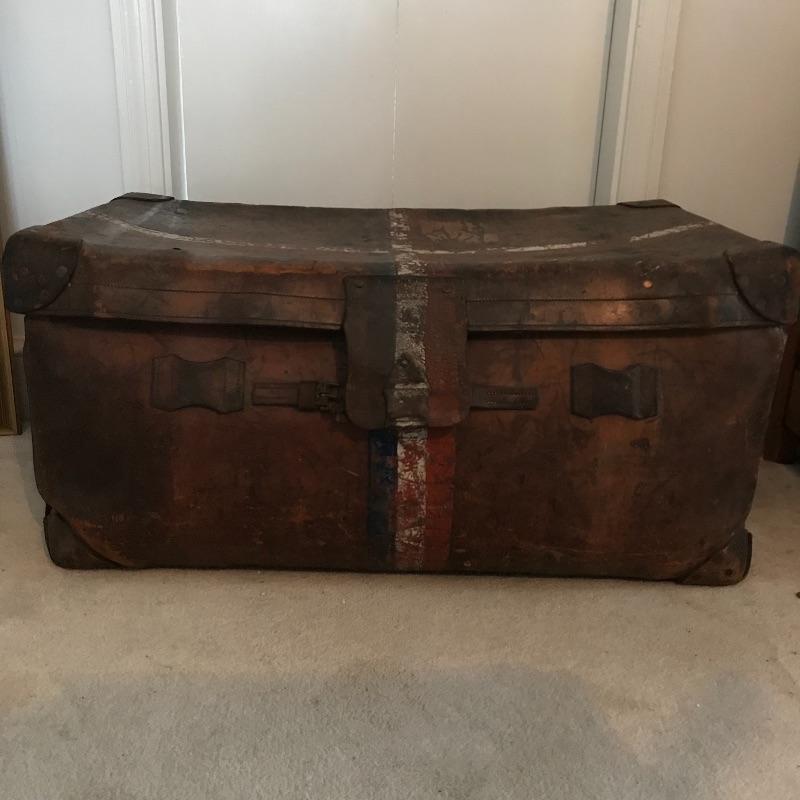 Wow. What a find! A&N CSL, Society Works leather trunk with patriotic designs appears well loved, but definitely has a lot of life left in it. The outer area of the trunk appears to be completely leather with some brass hardware. The inner lining appears to be bright red canvas, There are also wooden stabilizers on the base. Trunk has normal wear for its age and will be a steal at any price! Trunk measures approximately 36” x 23” x 18”. No shipping.