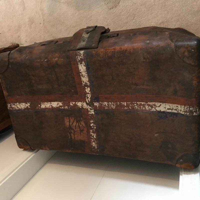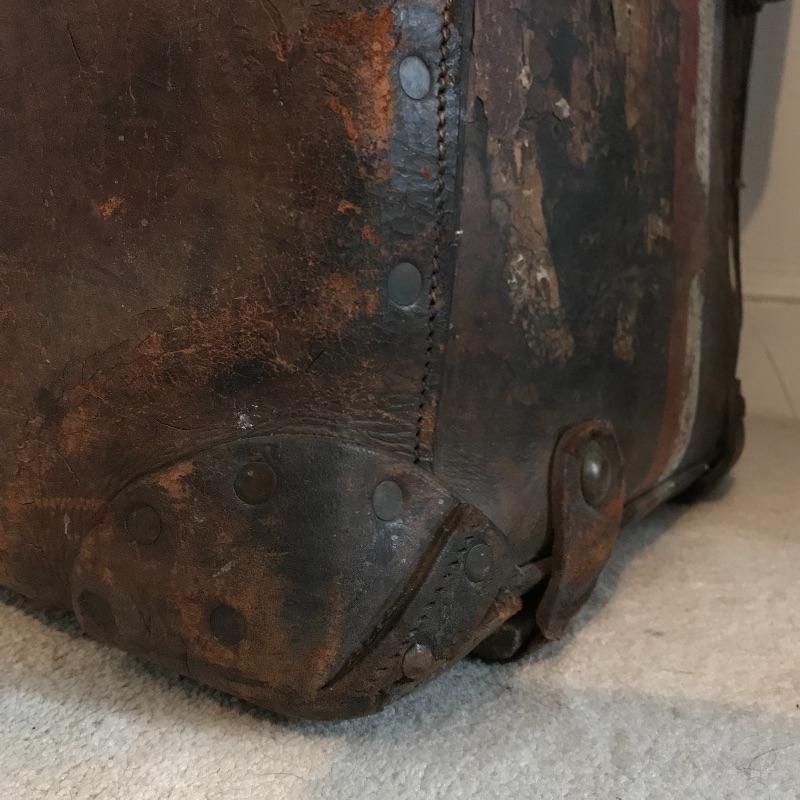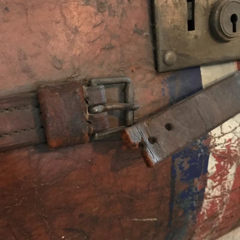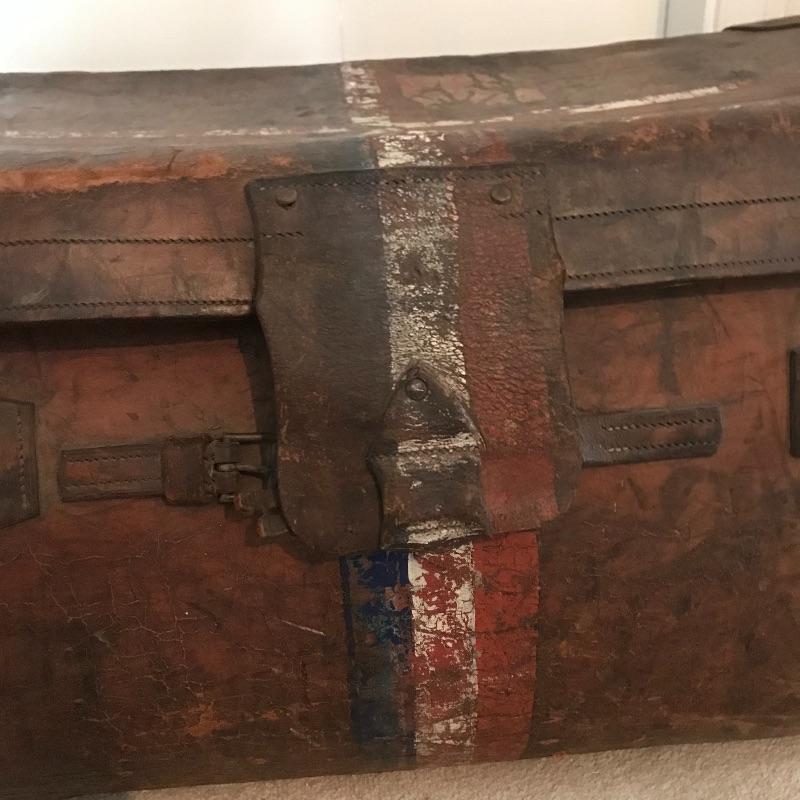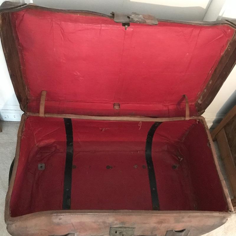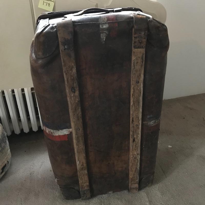 Wow. What a find! A&N CSL, Society Works leather trunk with patriotic designs appears well loved, but definitely has a lot of life left in it. The outer area of the trunk appears to be completely leather with some brass hardware. The inner lining appears to be bright red canvas, There are also wooden stabilizers on the base. Trunk has normal wear for its age and will be a steal at any price! Trunk measures approximately 36” x 23” x 18”. No shipping.