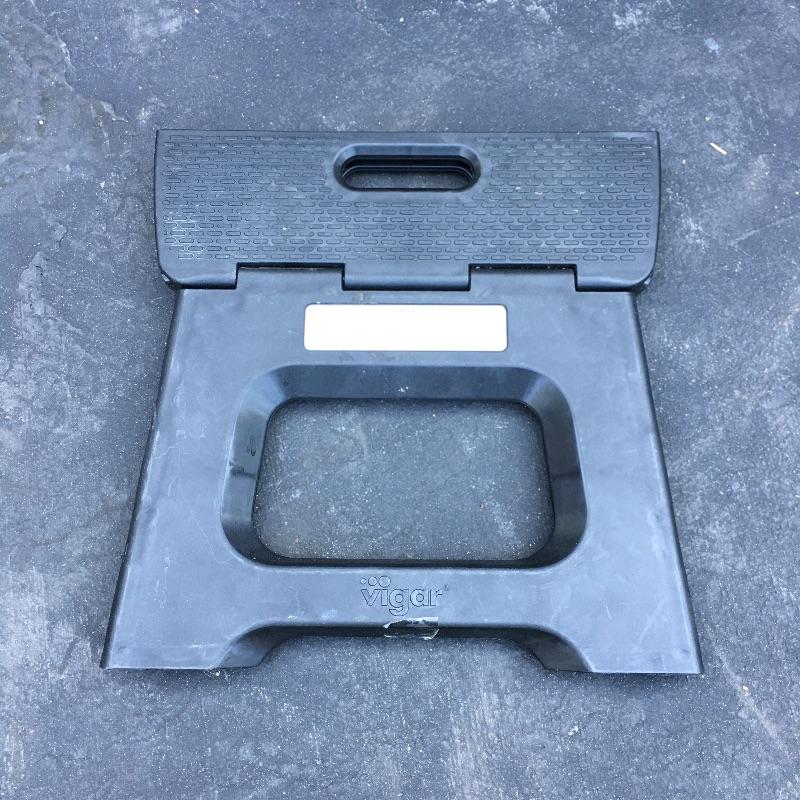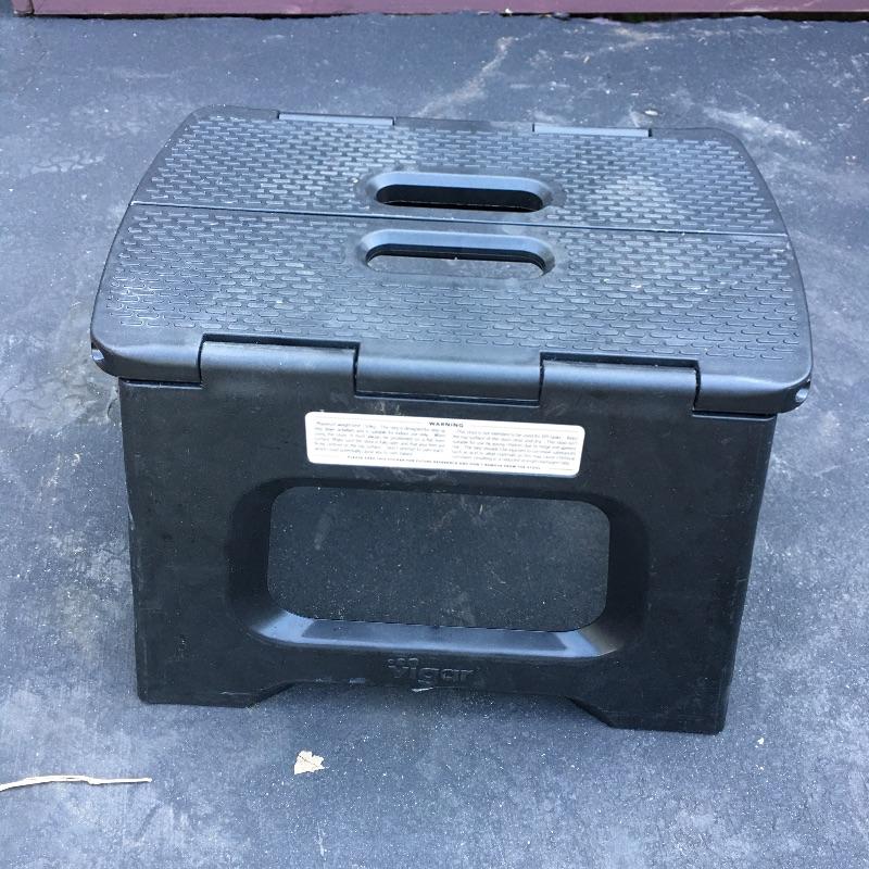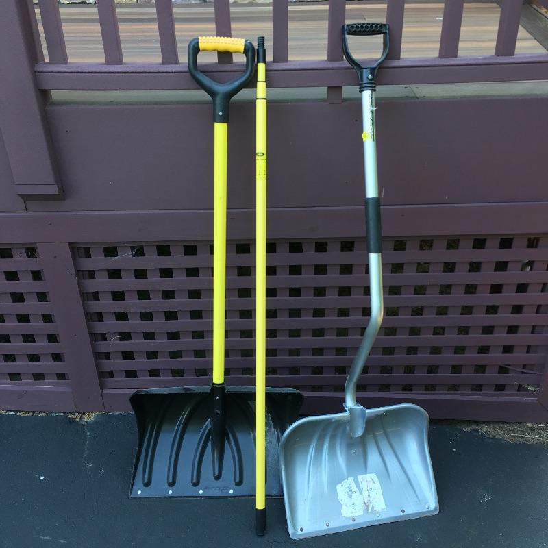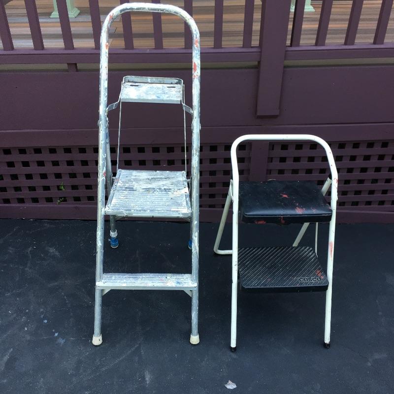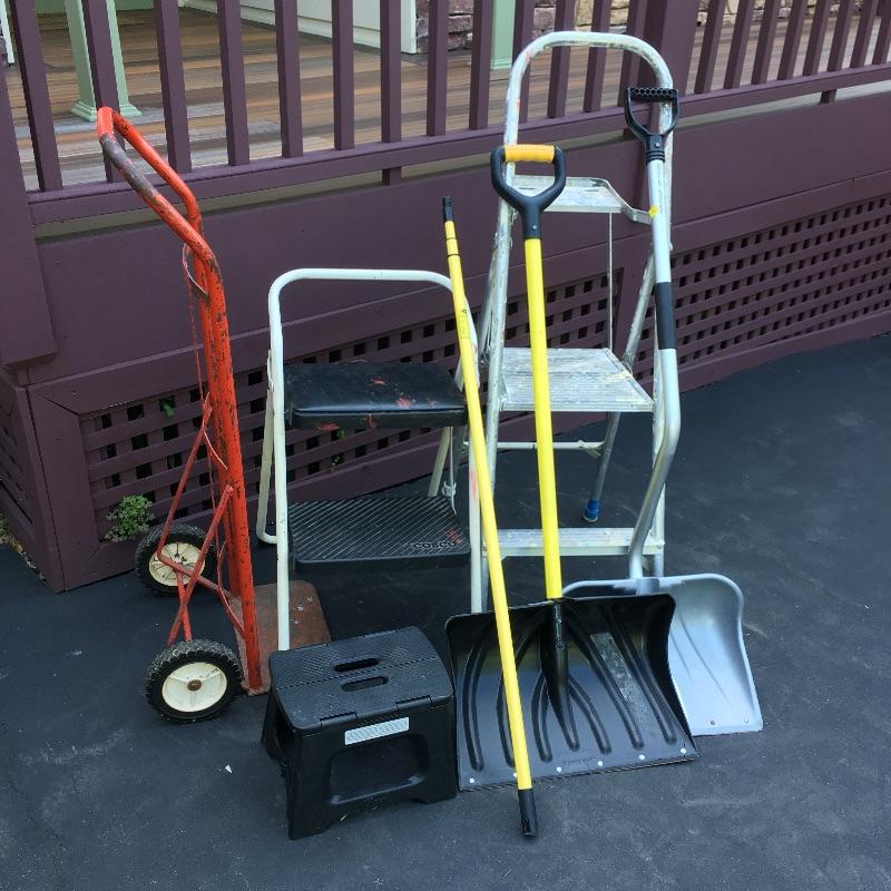 Lot includes aluminum stepladder with shelf, metal stepladder, foldable step, hand truck, two snow shovels and a extension pole. Aluminum stepladder measures 17.25” x 25” x 50”. Get a step up on your household chores with this practical lot.