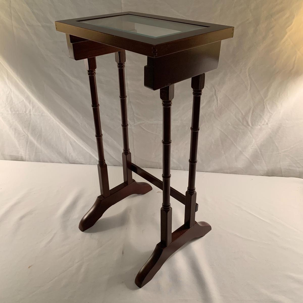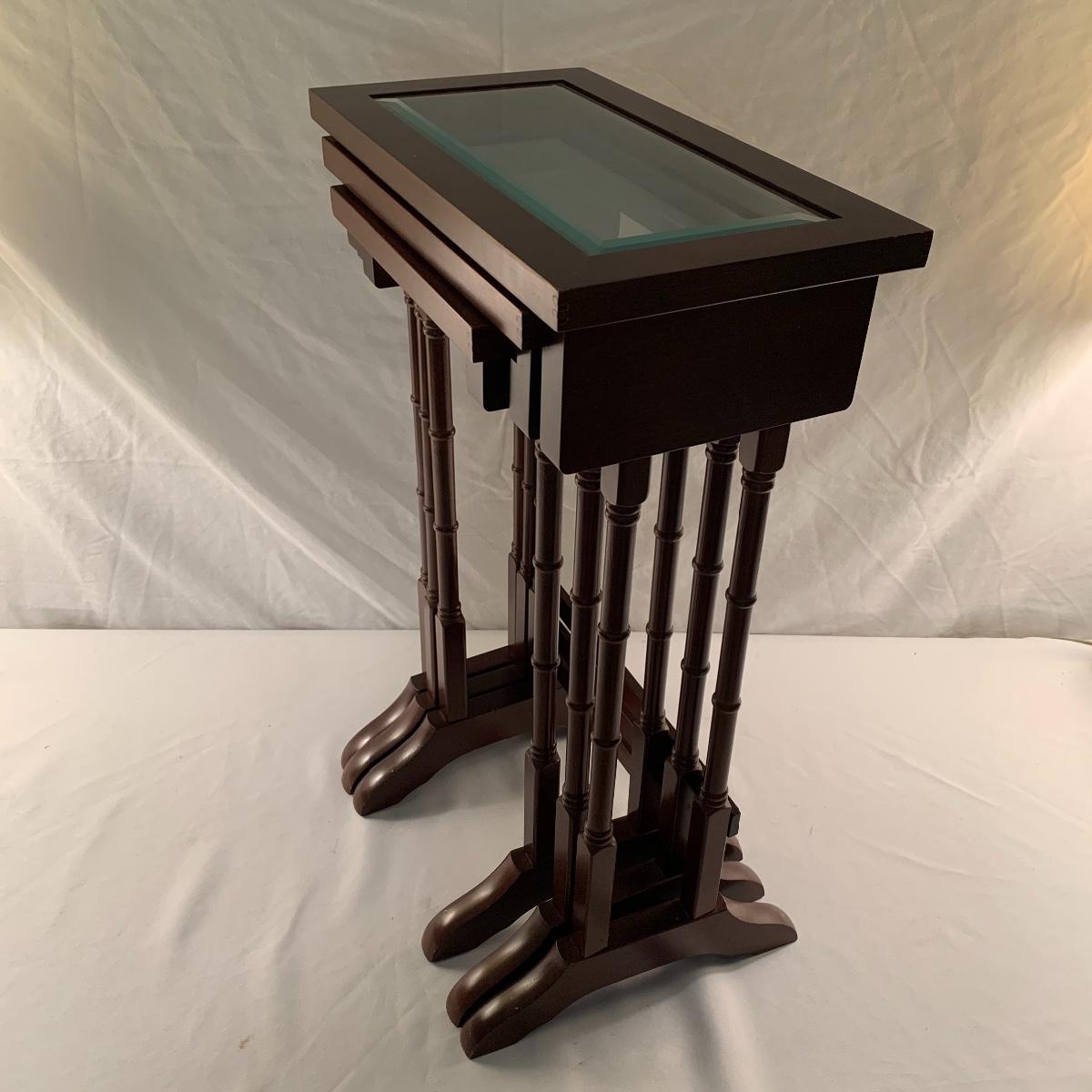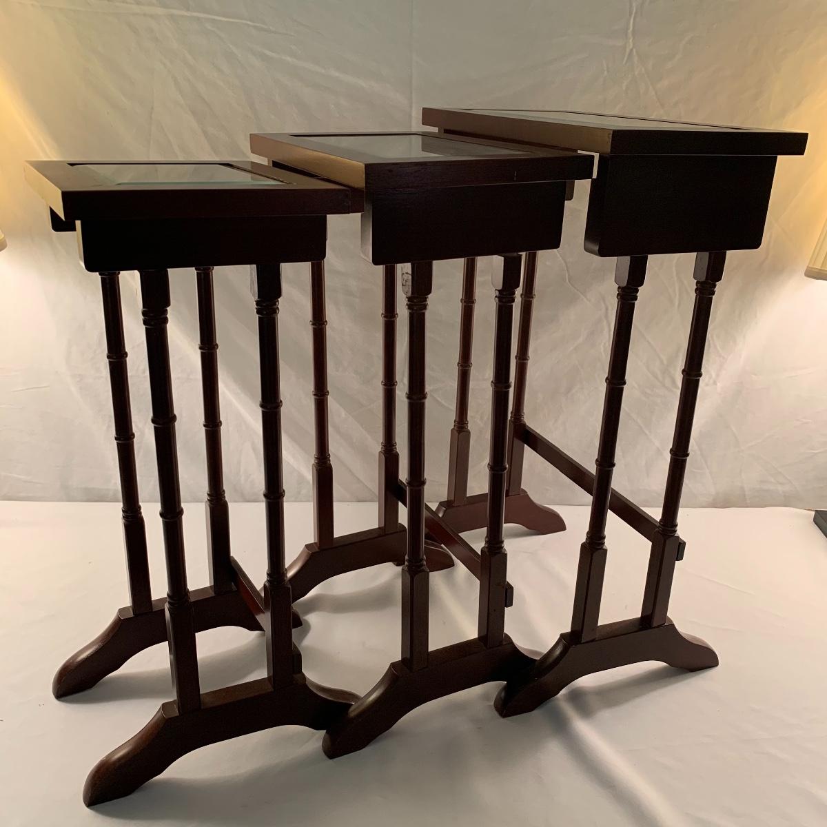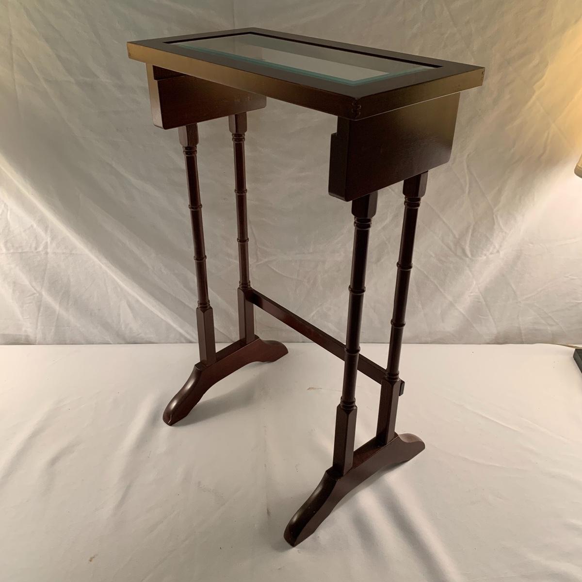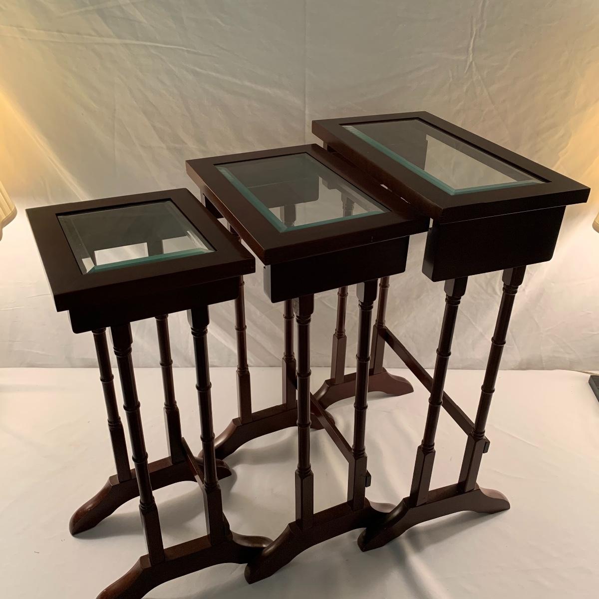 These three solid wood petite nesting tables with beveled glass tops nestle into one another. They are slim, lightweight tables that are a dark wood. They are in good condition but slightly wobbly and probably won’t do well standing alone with a heavy weight item. They are perfect tables for beverages or remote controls next to your favorite chair or couch. The beveled glass tops can be removed (see photos). The largest table measures about 16" x 9" x 25".