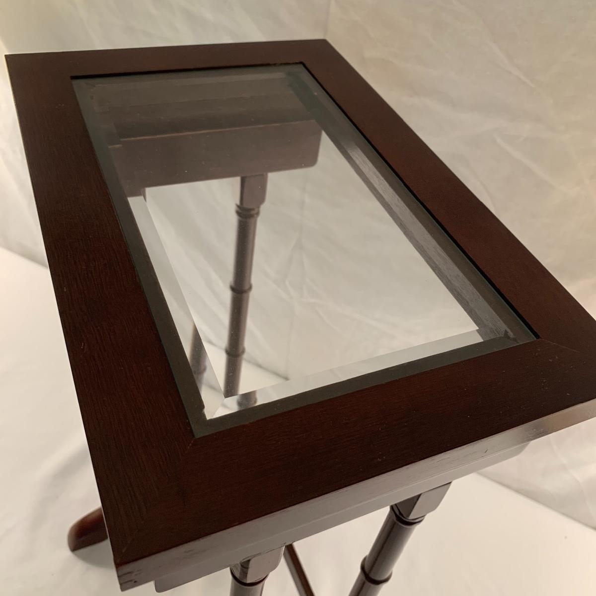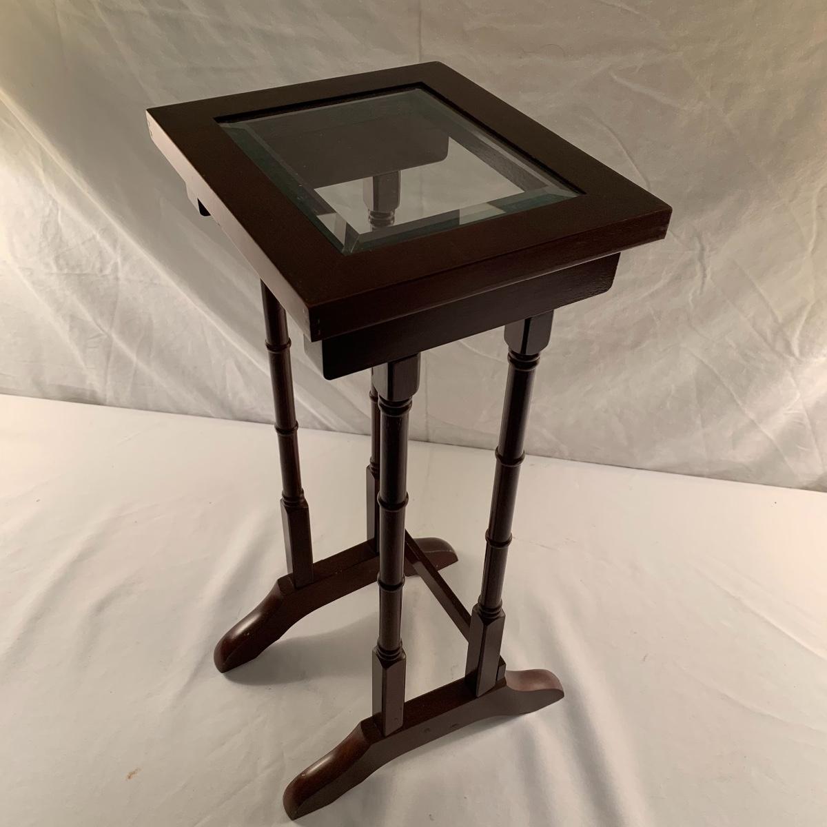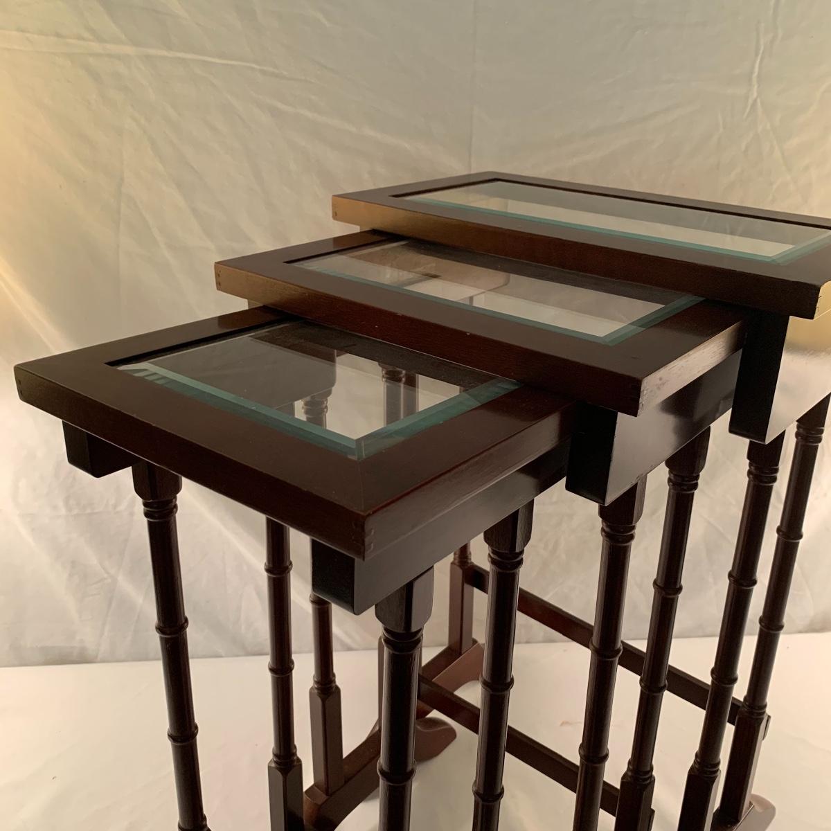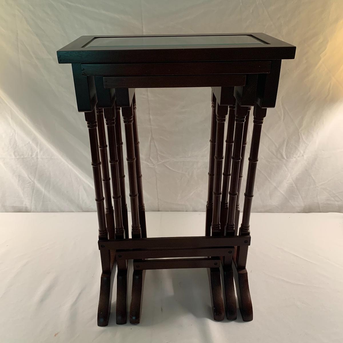 These three solid wood petite nesting tables with beveled glass tops nestle into one another. They are slim, lightweight tables that are a dark wood. They are in good condition but slightly wobbly and probably won’t do well standing alone with a heavy weight item. They are perfect tables for beverages or remote controls next to your favorite chair or couch. The beveled glass tops can be removed (see photos). The largest table measures about 16" x 9" x 25".