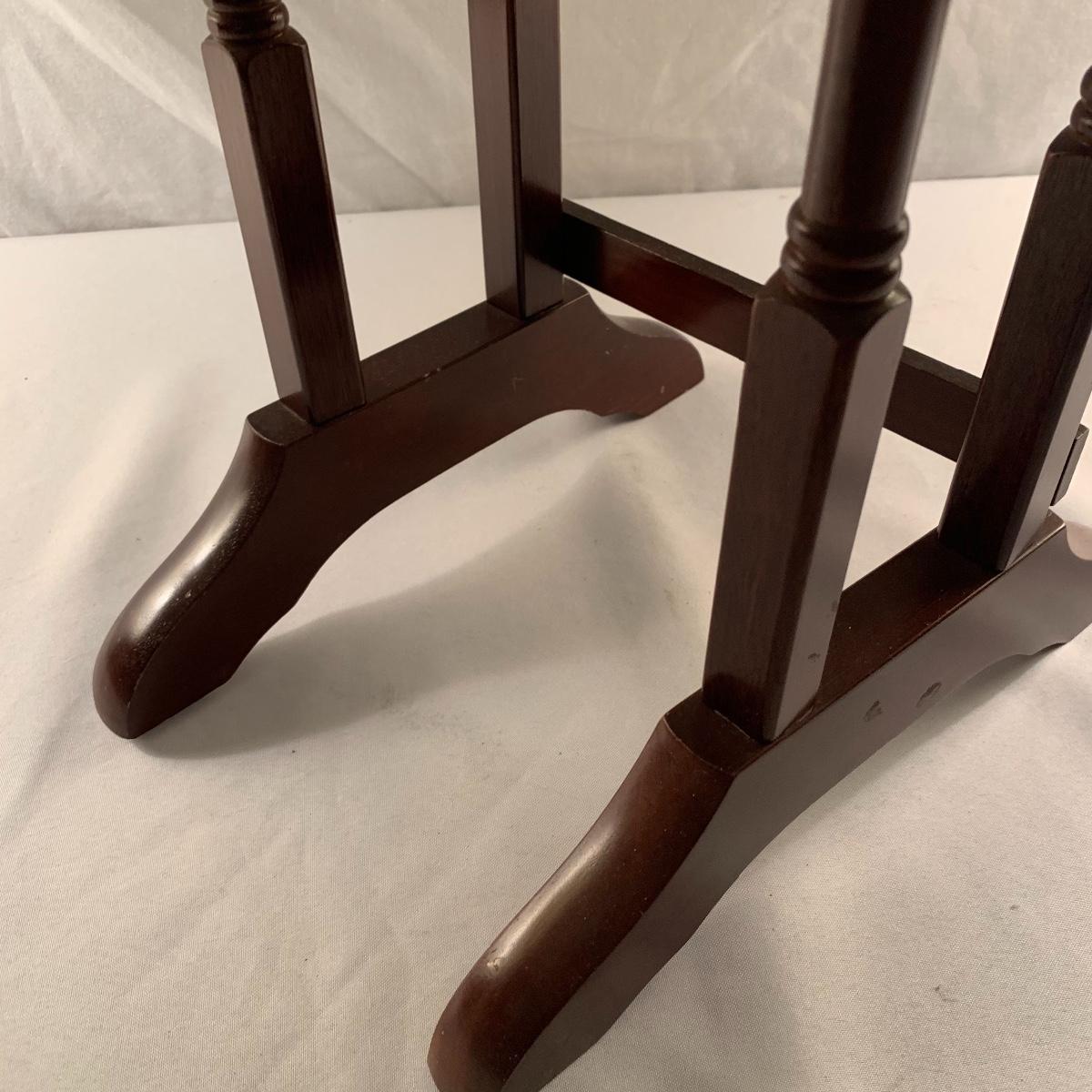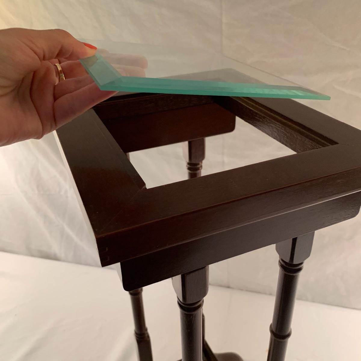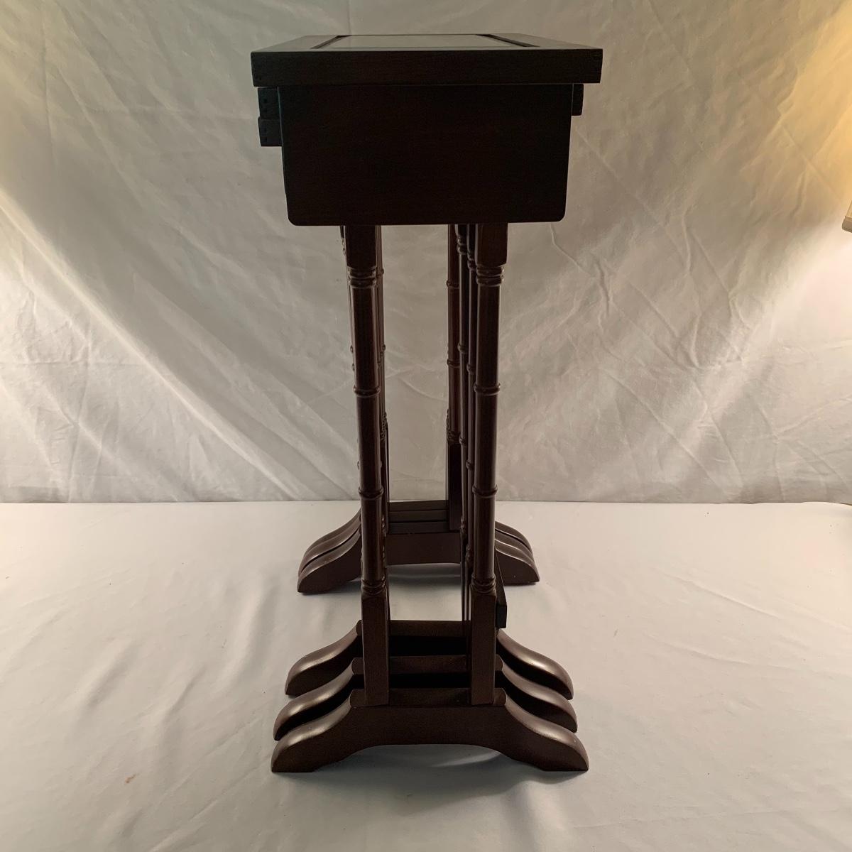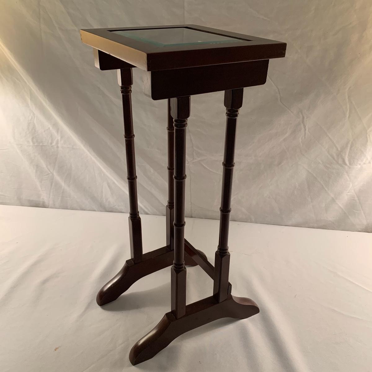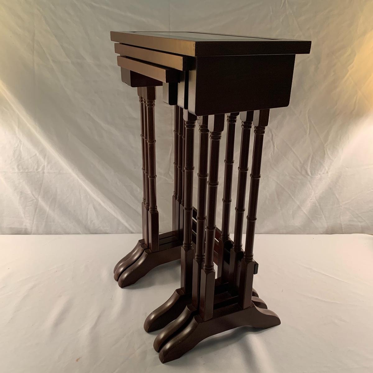 These three solid wood petite nesting tables with beveled glass tops nestle into one another. They are slim, lightweight tables that are a dark wood. They are in good condition but slightly wobbly and probably won’t do well standing alone with a heavy weight item. They are perfect tables for beverages or remote controls next to your favorite chair or couch. The beveled glass tops can be removed (see photos). The largest table measures about 16" x 9" x 25".