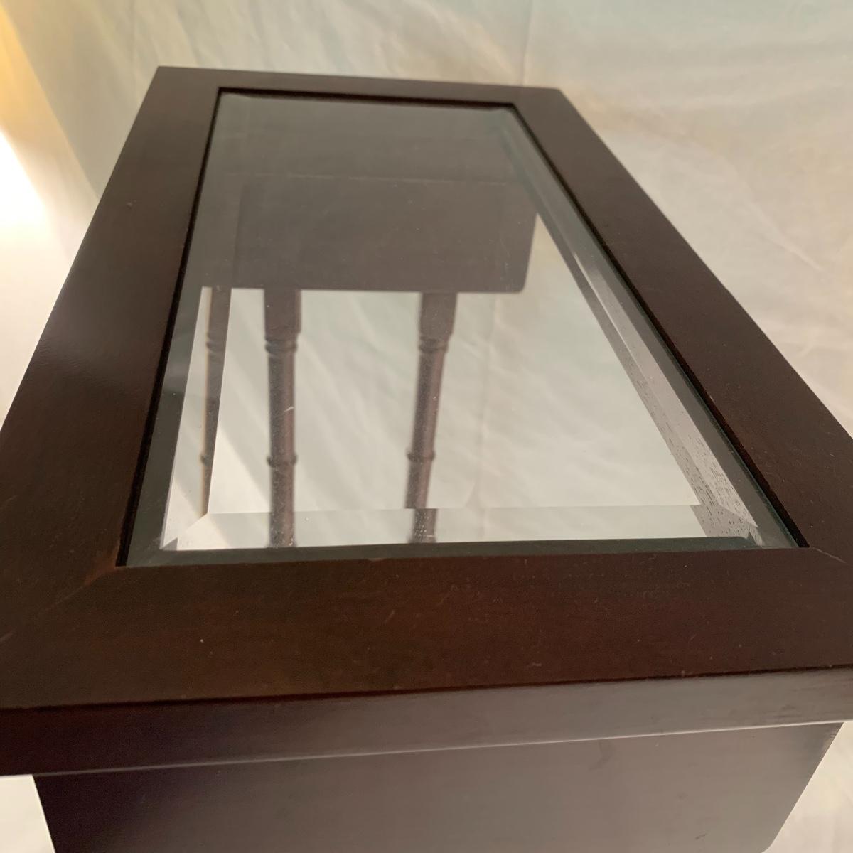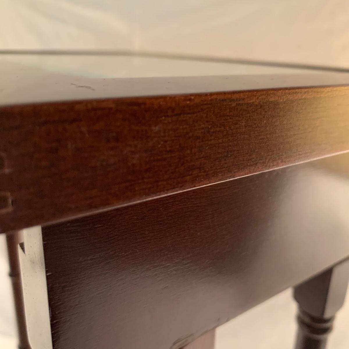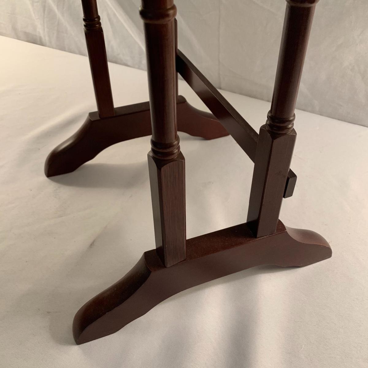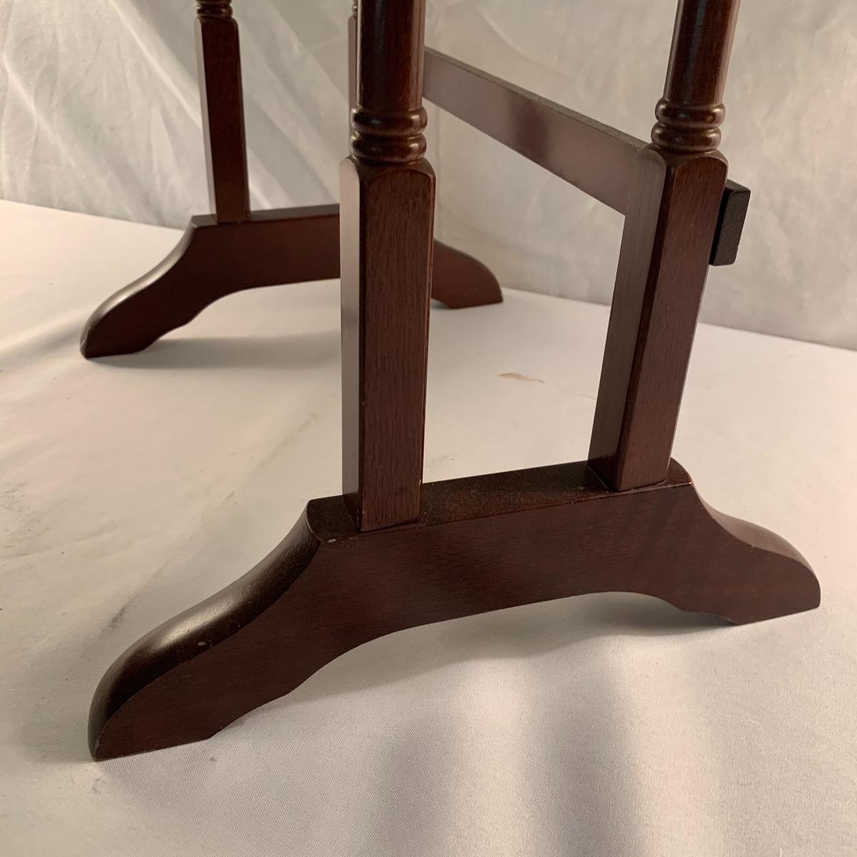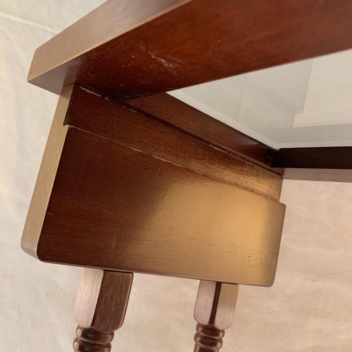 These three solid wood petite nesting tables with beveled glass tops nestle into one another. They are slim, lightweight tables that are a dark wood. They are in good condition but slightly wobbly and probably won’t do well standing alone with a heavy weight item. They are perfect tables for beverages or remote controls next to your favorite chair or couch. The beveled glass tops can be removed (see photos). The largest table measures about 16" x 9" x 25".