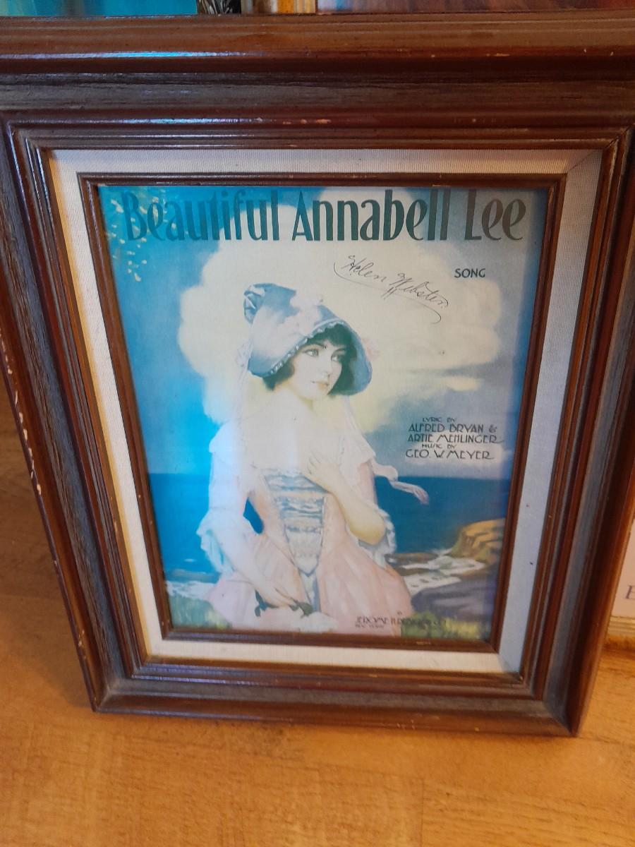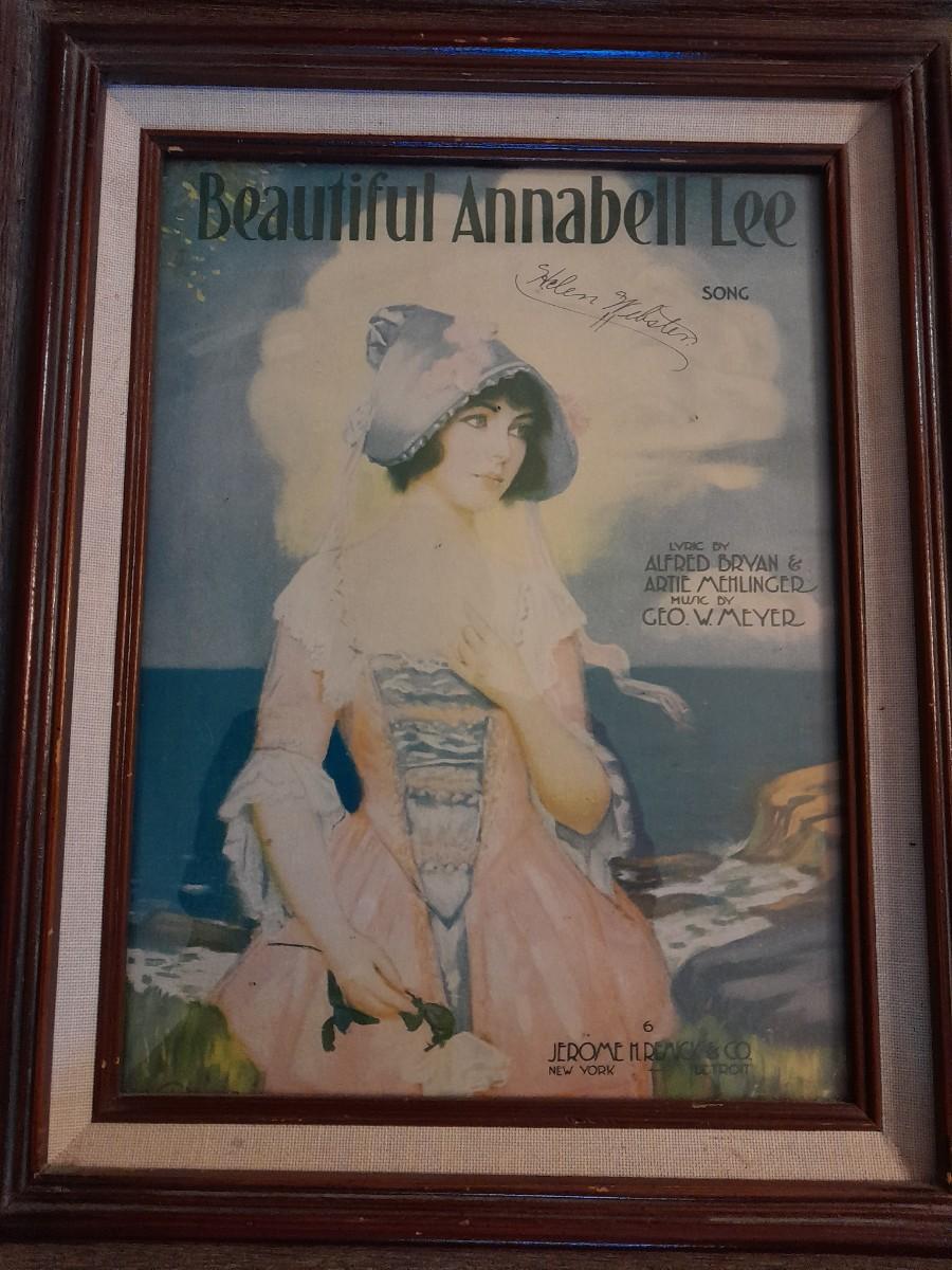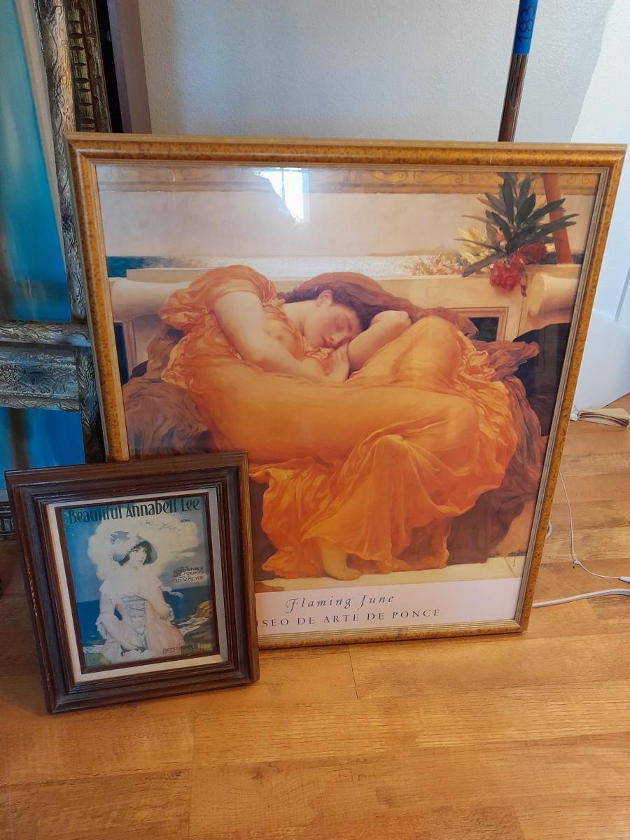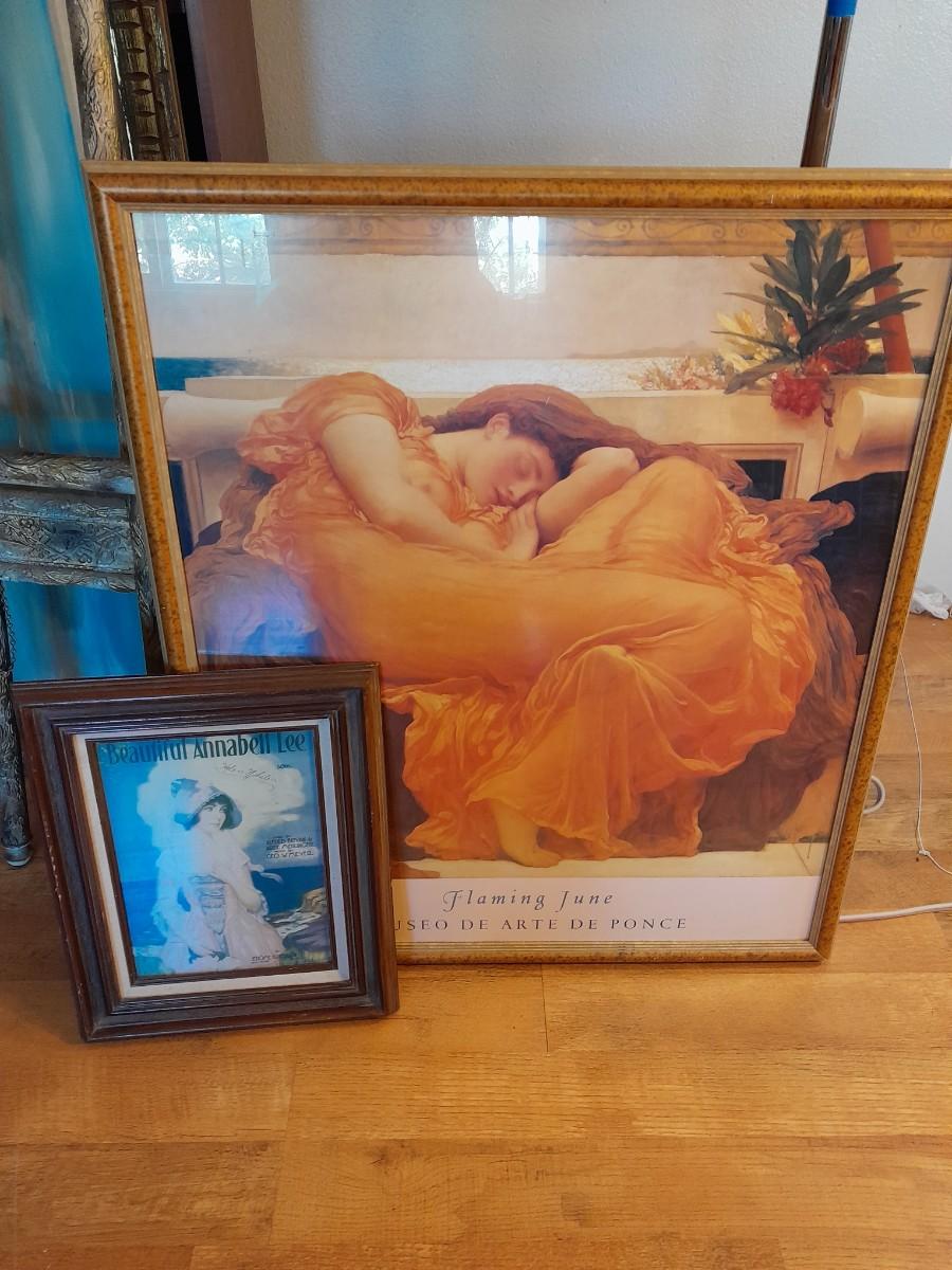 TWO FRAMED PICTURES OF WOMEN, FRAMED MUSIC SHEET "BEAUTIFUL ANNABELL LEE" SONG 13" X 17" AND FRAMED "FLAMING JUNE" MESEO DE ARTE DE PONCE 29" X 34"