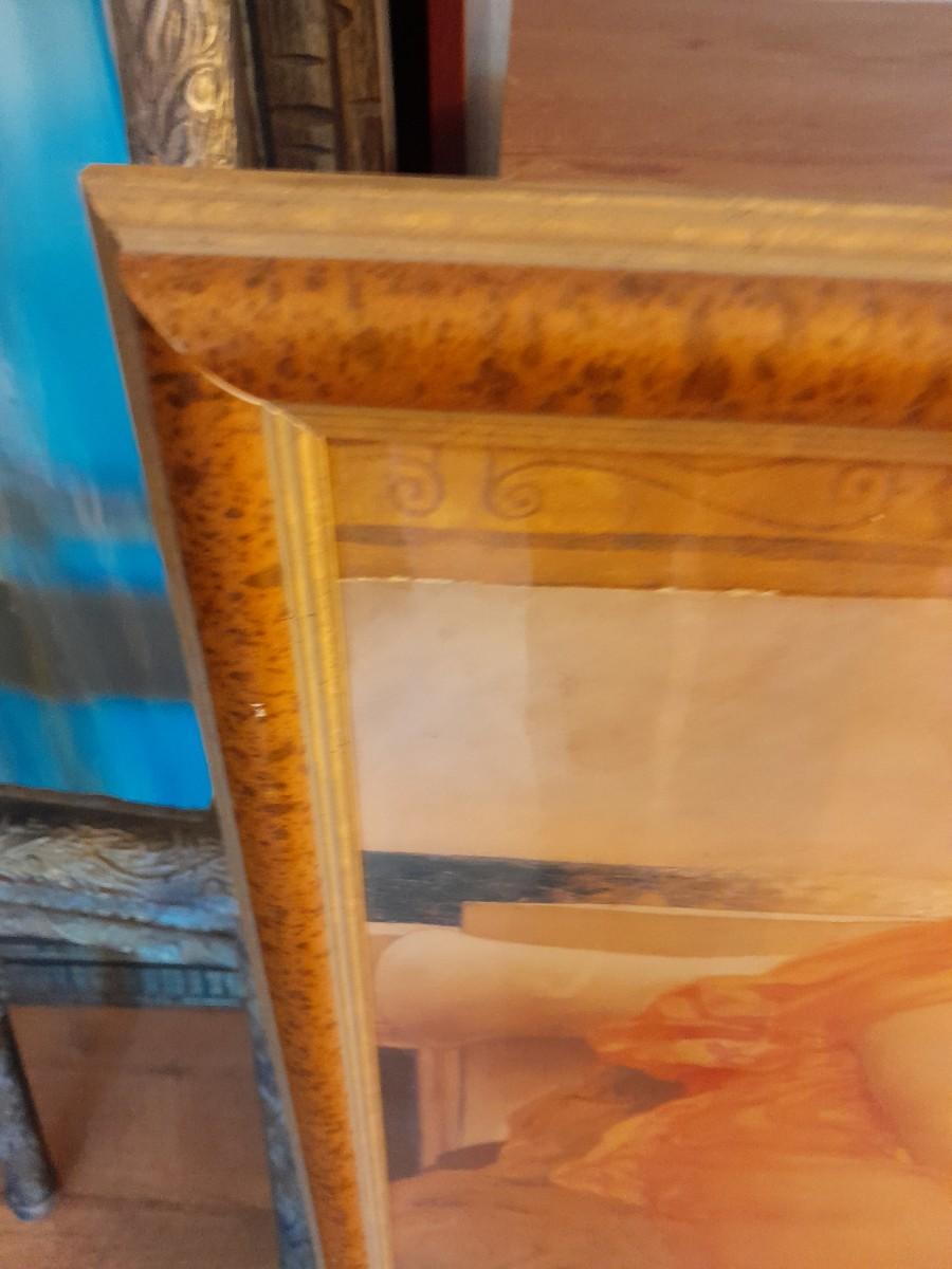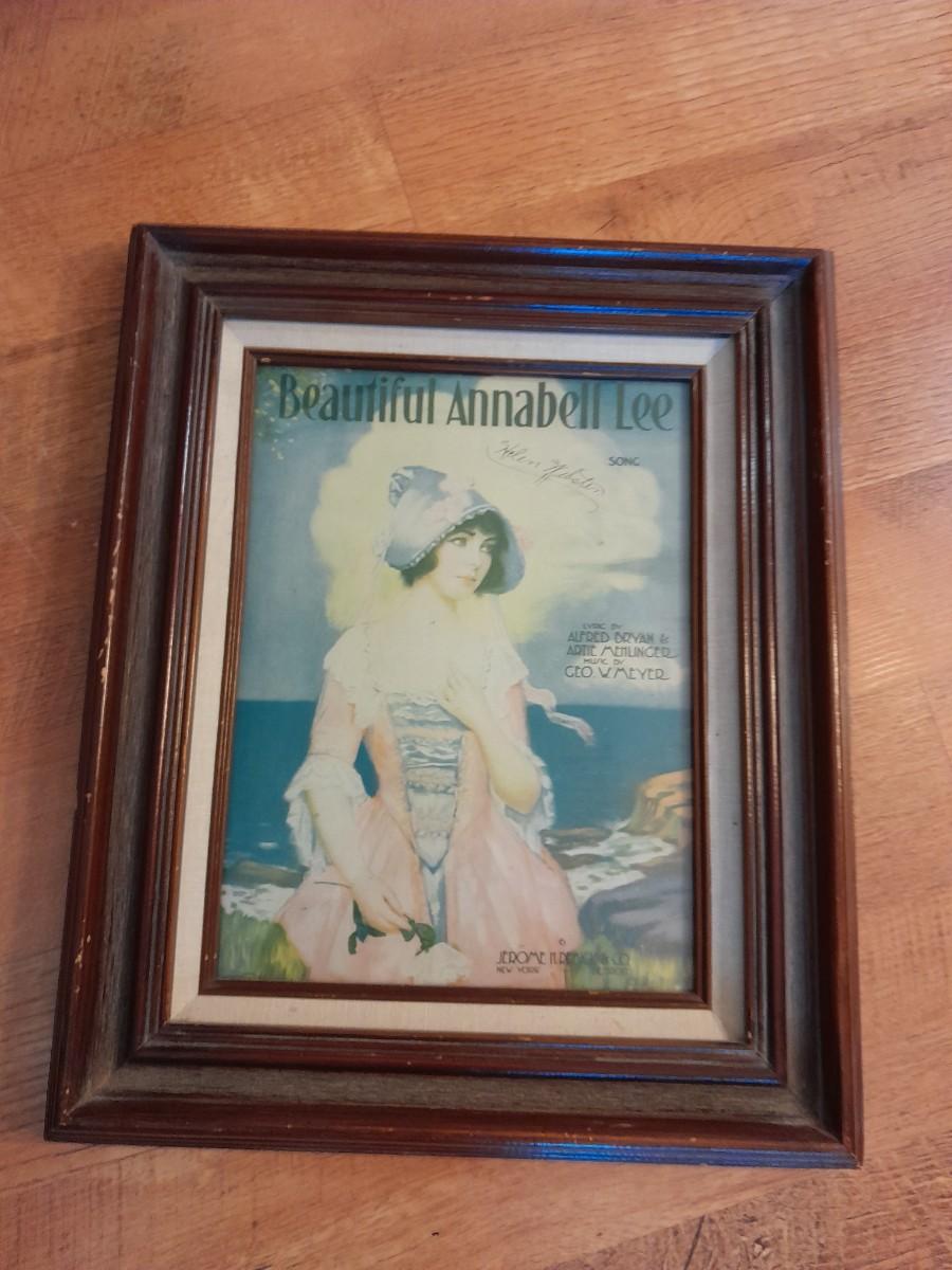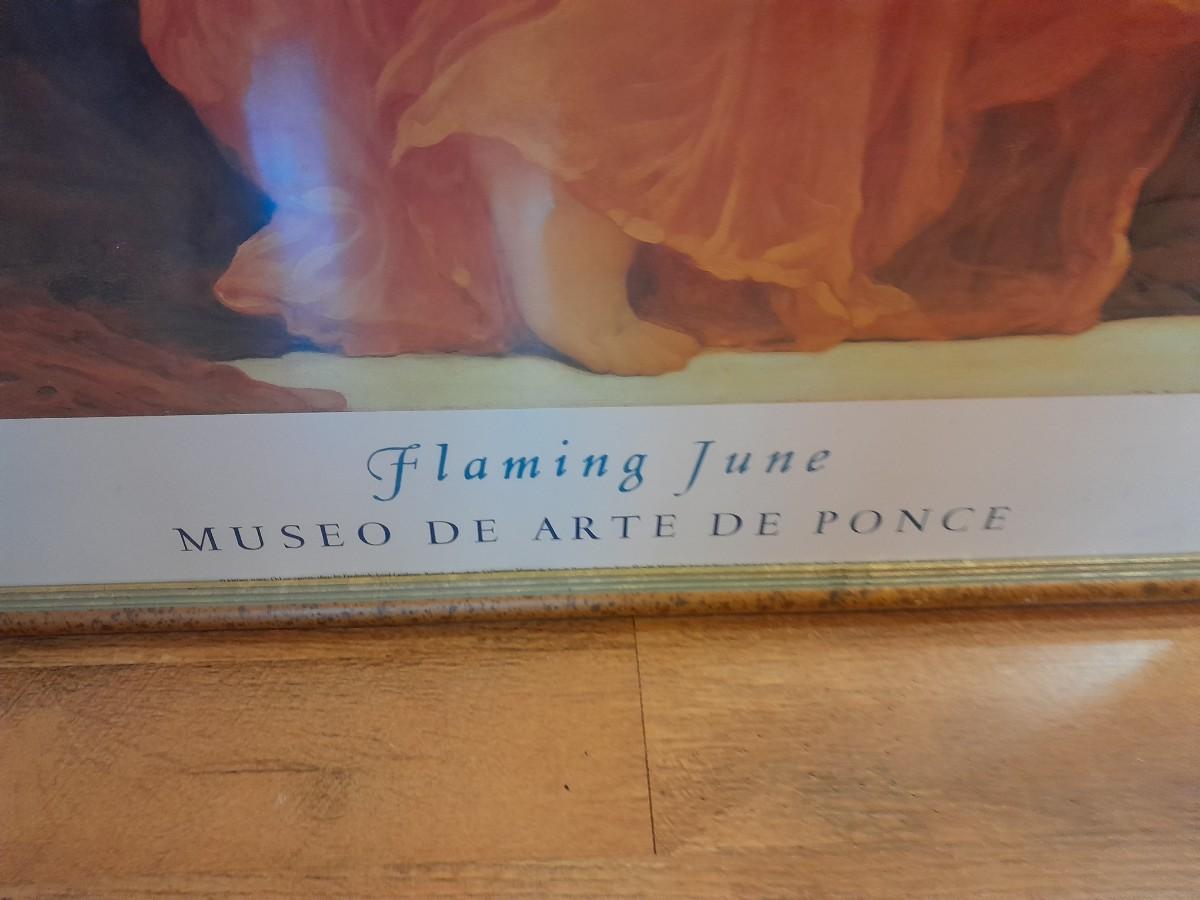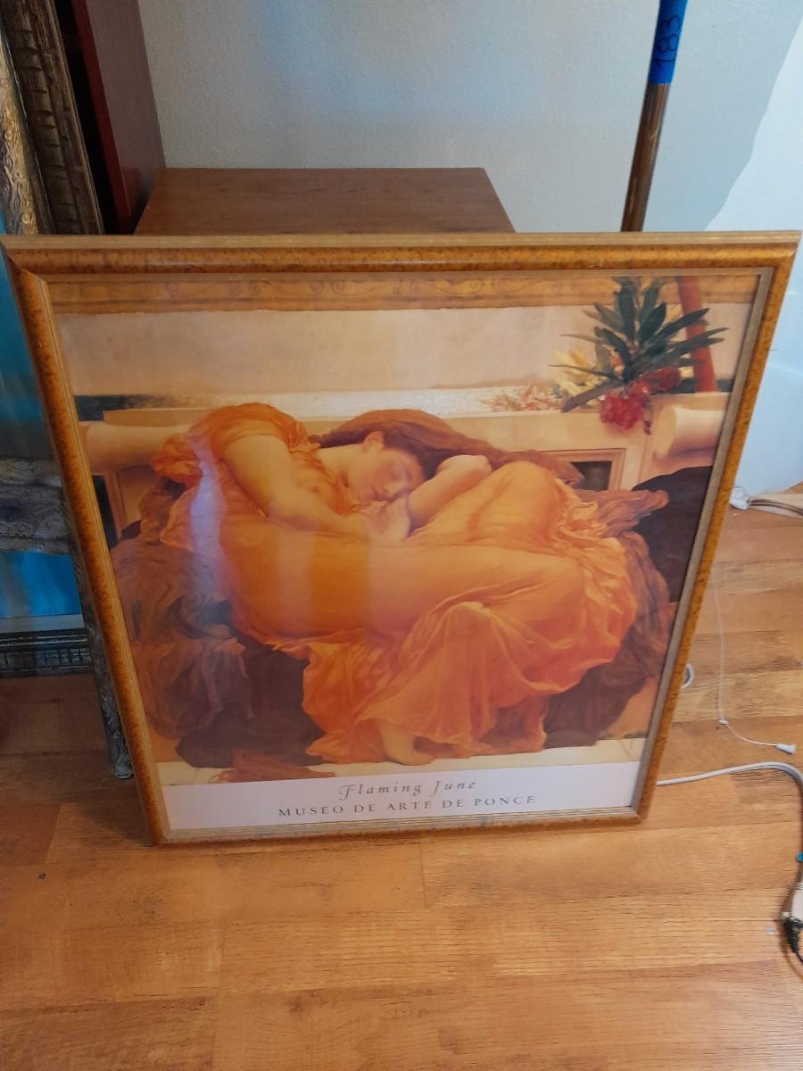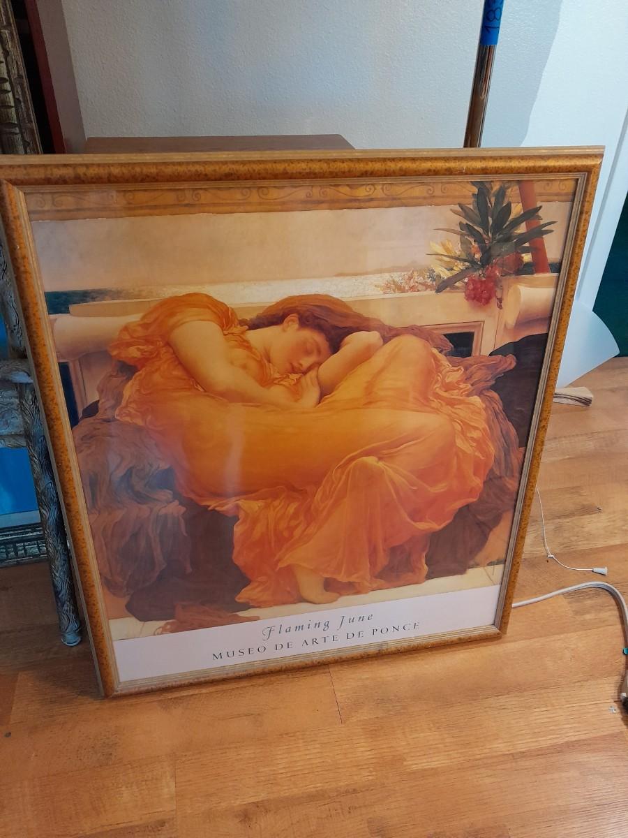 TWO FRAMED PICTURES OF WOMEN, FRAMED MUSIC SHEET "BEAUTIFUL ANNABELL LEE" SONG 13" X 17" AND FRAMED "FLAMING JUNE" MESEO DE ARTE DE PONCE 29" X 34"