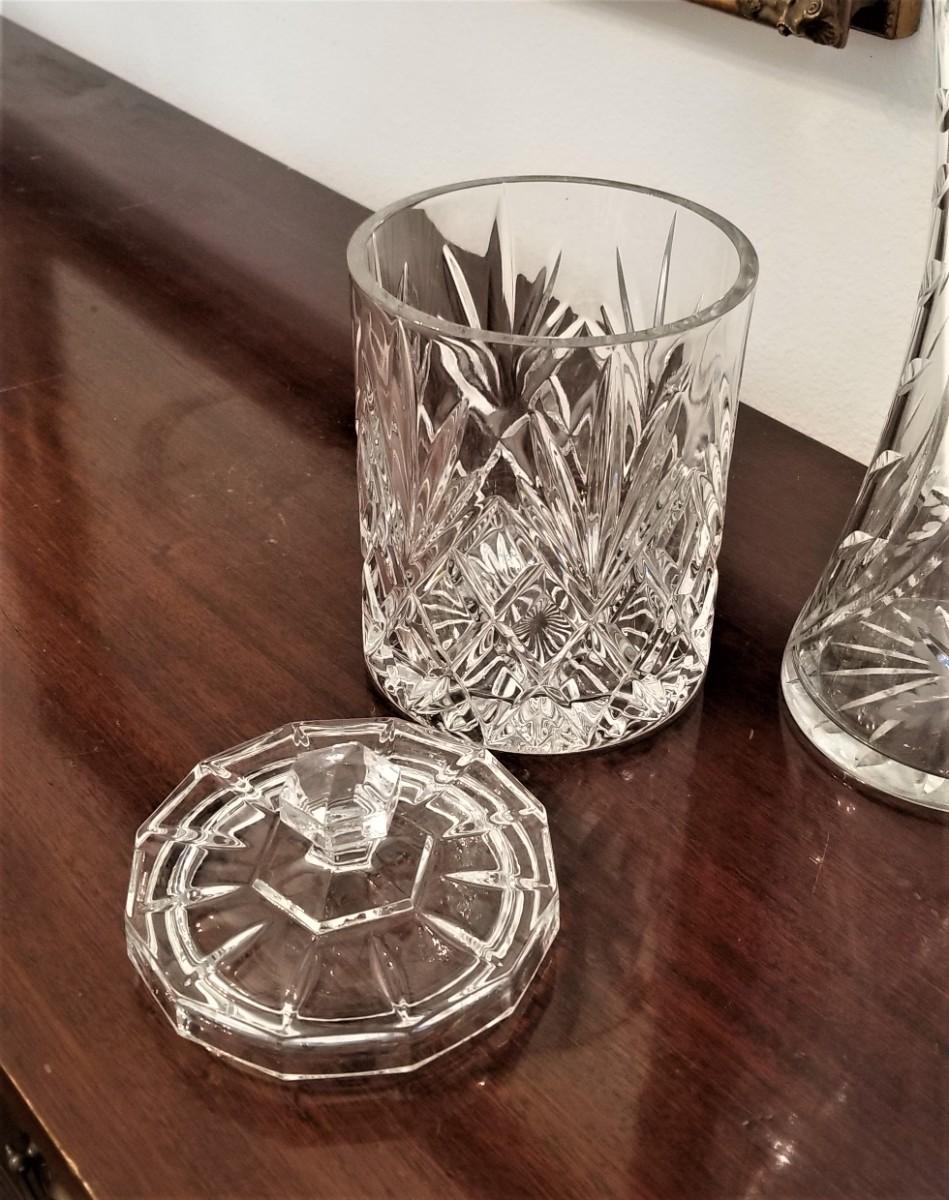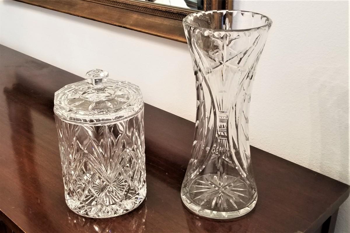 Two nice pieces of glass - crystal vase and pressed glass biscuit barrel - both in good condition. Vase is 12" tall, biscuit carrel is 9: tall.