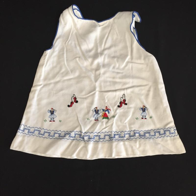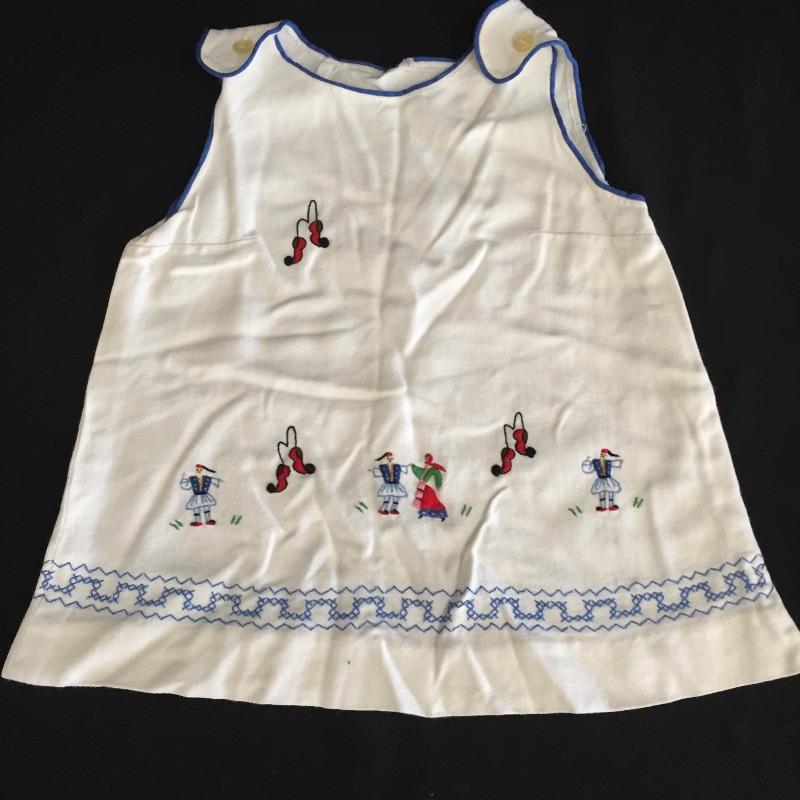 Adorable hand stitched pair of matching vintage toddler dresses. There is a variation in sizes with the larger one measuring 21”L with a chest measurement of 13”. Some light marks on the larger dress that could possibly wash out.